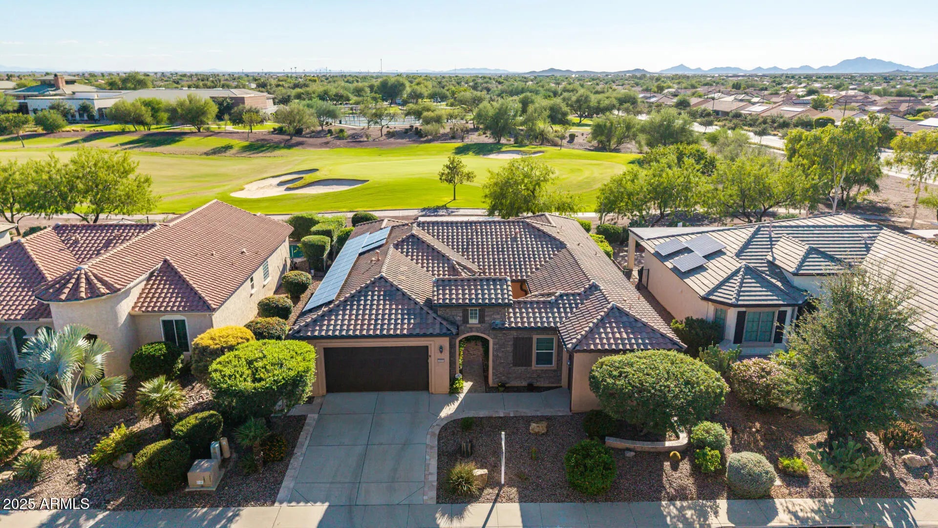 **NEW PRICE!**ABSOLUTELY STUNNING 2 bdrm plus den home on the 10th green! From the lovely stone front elevation and stone-pavered courtyard with fountain, to the serene golf course views, this home is a winner! Gorgeous chef's kitchen includes oversized cabinets, pendant lighting, gorgeous granite! Huge walk-in pantry PLUS a butler's pantry for extra storage! Spacious great room and formal dining room! Plantation shutters! The extended covered patio features travertine pavers, gas firepit! Did I mention the solar panels? They're owned free and clear, and convey with the home! The guest bedroom has an ensuite bathroom! There's even a Murphy bed in the den! Large 2-car garage with plenty of cabinets, and a separate golf cart garage! Washer, dryer and refrigerator convey! Hurry to this one!