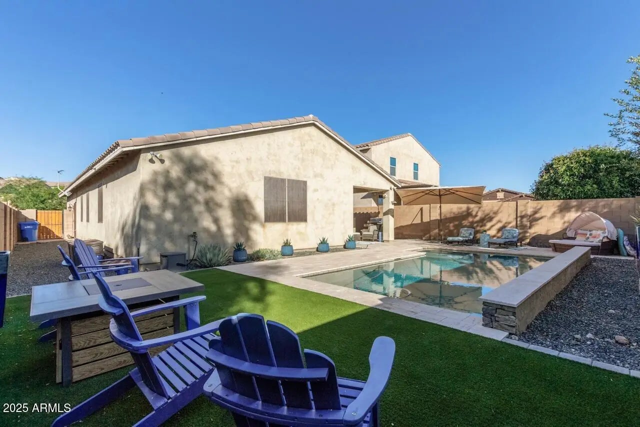 Special Financing Available - ask listing agents for details. Nestled within the desirable gated community of Stoneledge in northwest Phoenix, this impeccably maintained residence offers a refined blend of comfort, efficiency, and modern upgrades. Featuring 3 bedrooms plus a den/office and 2 bathrooms, this home showcases thoughtful design throughout every space. The open great room concept enhances the home's livability, complemented by tall upgraded baseboards, modern tile, new carpet, updated lighting, and ceiling fans for year-round comfort. The kitchen stands out with granite slab counters, staggered cabinetry, stainless steel appliances, a pull-out faucet, new pendant lighting above the island, and a walk-in pantry for optimal storage. The secondary bathroom offers dual sinks and a separate door between the vanity area and shower/toilet for privacy and convenience, while the second bedroom features a custom closet for extra organization. Additional upgrades include new faucets, 2-inch blinds, blackout curtains, security doors on both the front and garage side entry, and a Ring doorbell for added peace of mind. Outdoors, enjoy Arizona living at its best with a sparkling pebble-sheen play pool highlighted by sheer descents as a soothing water feature. The travertine pool decking, artificial turf front and back, and sunscreens make this low-maintenance yard perfect for relaxation or entertaining. The home's upgraded stone elevation, paver driveway, and travertine surround around the pool elevate its curb appeal. Electric car owners will appreciate the charging outlet already in place in the garage. Within the Stoneledge community, residents enjoy private parks, playgrounds, picnic areas, and BBQ spaces that foster a welcoming neighborhood atmosphere. The location provides convenient access to Ridgeline Charter School, NVCA private school, Fry's shopping center, Mountainside Fitness, and other nearby destinations, making it a practical and appealing choice for everyday living. Stylish, well-appointed, and move-in ready, this home represents the perfect combination of modern upgrades, thoughtful design, and desirable location. Arrange a private tour today!