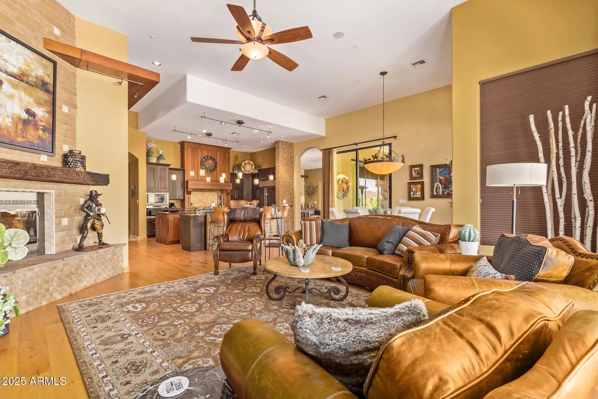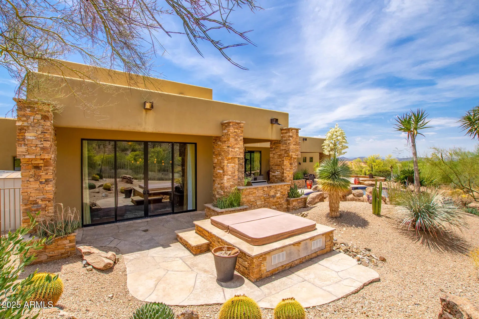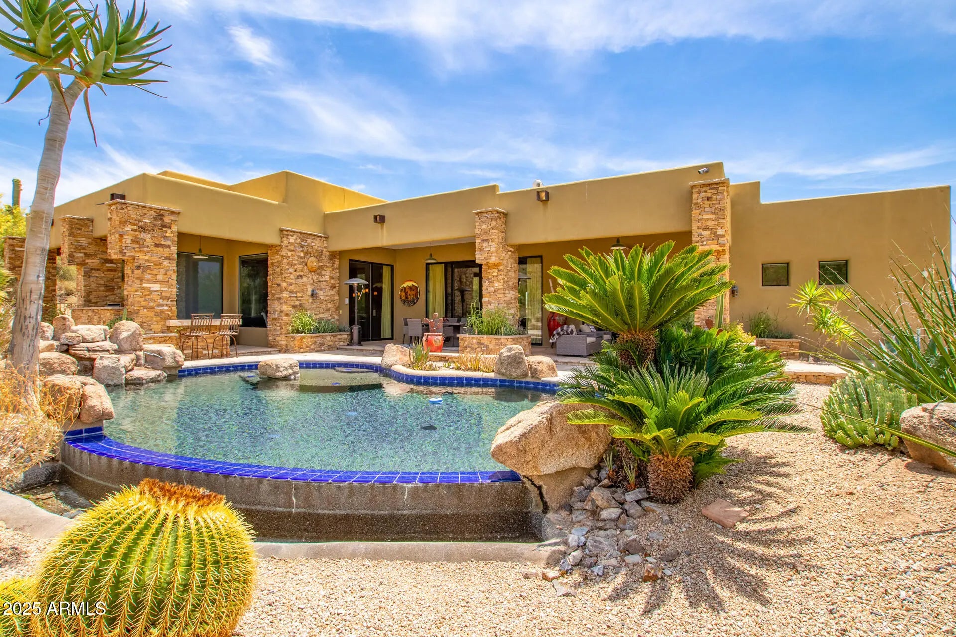 Breathtaking views of the Sonoran Desert surrounding this beautiful custom 4 bedroom home in Canyon Ridge Estates. Enter this beautiful home from a private courtyard with a stone fireplace, flagstone walkway and custom landscaping. The interior has high ceilings, retractable doors to the patio and stone floors in the main living areas. The kitchen is an entertainers delight with two large islands, Wolf/Subzero appliances, double ovens and wood flooring. This home provides outdoor living at its finest, with a custom pool, spa, built in BBQ and endless views. BOTH AC UNITS replaced February 2026