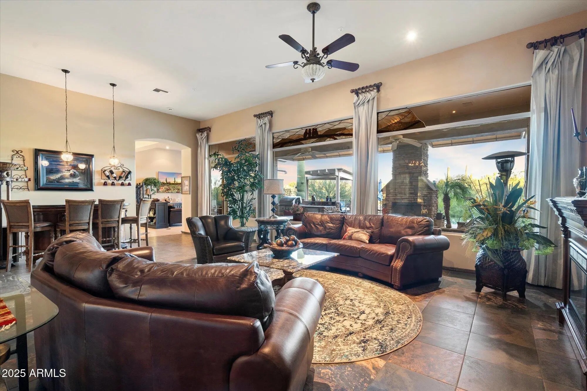 Stunning Former Model Home on the Legend Trail Golf Course! Experience luxury desert living in this exquisite former Pinnacle Builders model home, perfectly situated on a premium ¾-acre south-facing lot overlooking the pristine fairways of the Legend Trail Golf Course. Impeccably maintained, this residence showcases refined design details and timeless craftsmanship throughout. A striking custom art glass entry door and windows set the tone upon arrival, complemented by remote-control blinds and a split floor plan designed for both comfort and entertaining. The expansive great room seamlessly flows into the gourmet kitchen, featuring newer stainless appliances, updated cabinetry, a large center island, and a spacious walk-in pantry. The dedicated office offers custom built-in cabinetry, shelving, and window seating. The primary suite is a serene retreat with rich reclaimed wood flooring, a generous sitting area, and an oversized walk-in closet. Two additional guest bedrooms share a stylish Jack-and-Jill bathroom. Enjoy the ultimate indoor-outdoor lifestyle with a covered patio featuring a cozy fireplace, built-in BBQ with mini fridge, and breathtaking Sonoran Desert views. The backyard is an entertainer's dream, complete with a negative-edge pool and pergola, perfect for relaxing or hosting guests. Additional highlights include an air-conditioned and insulated three-car garage with tiled flooring and a 220V outlet for EV charging. Residents of Legend Trail enjoy resort-style amenities including a community center, pickleball and tennis courts, a fitness facility, heated pool and spa, plus access to endless hiking and biking trails.