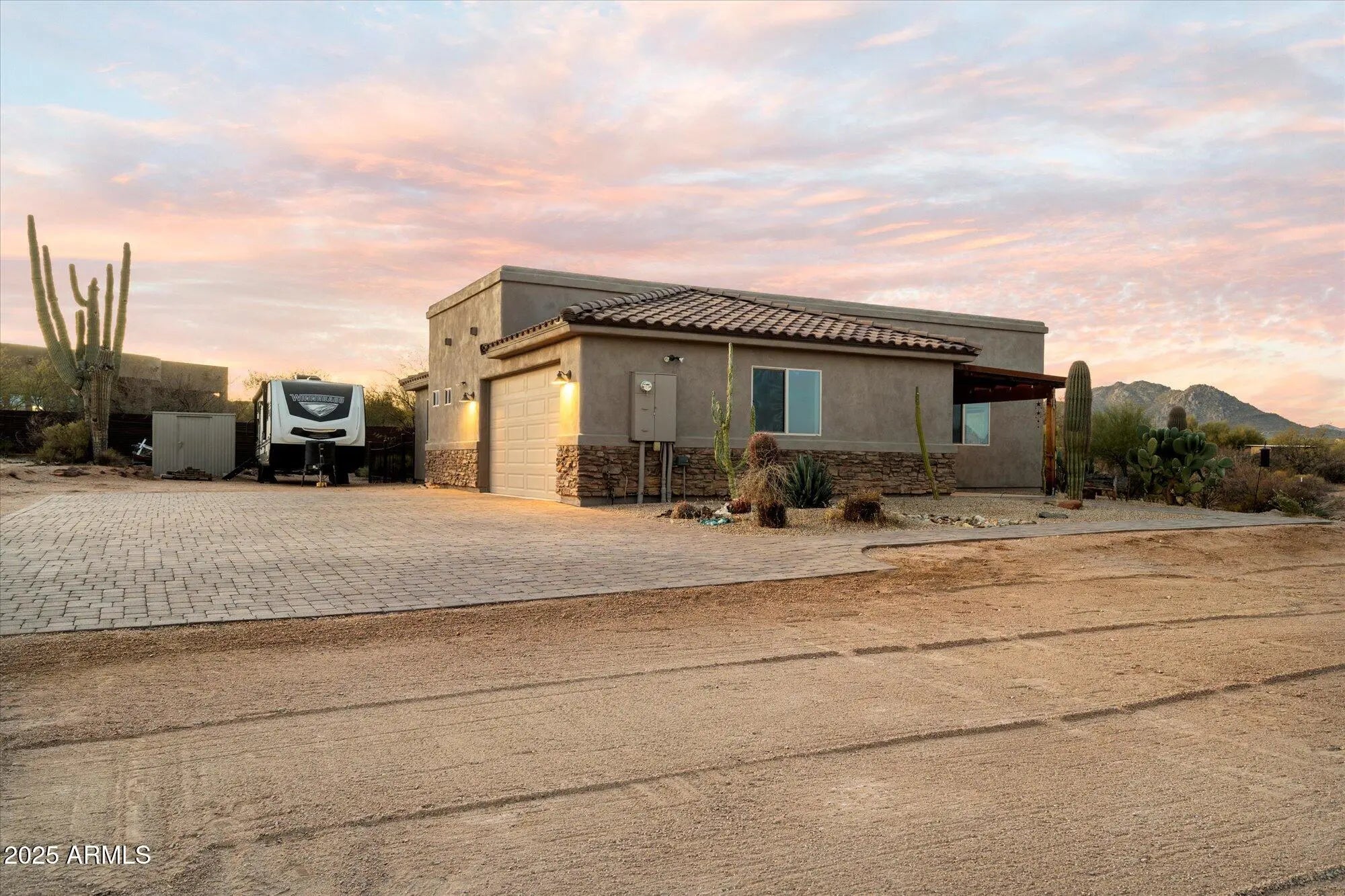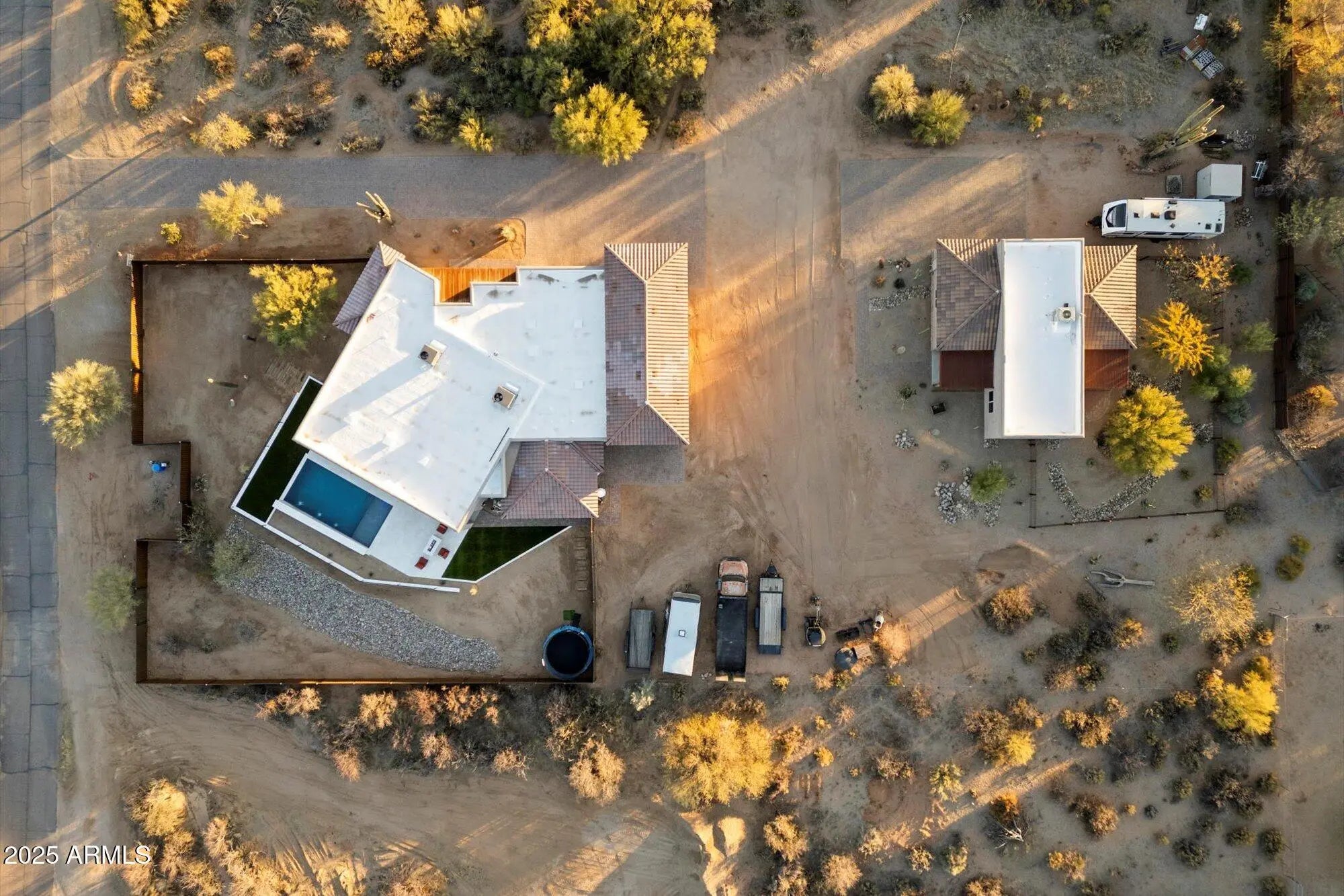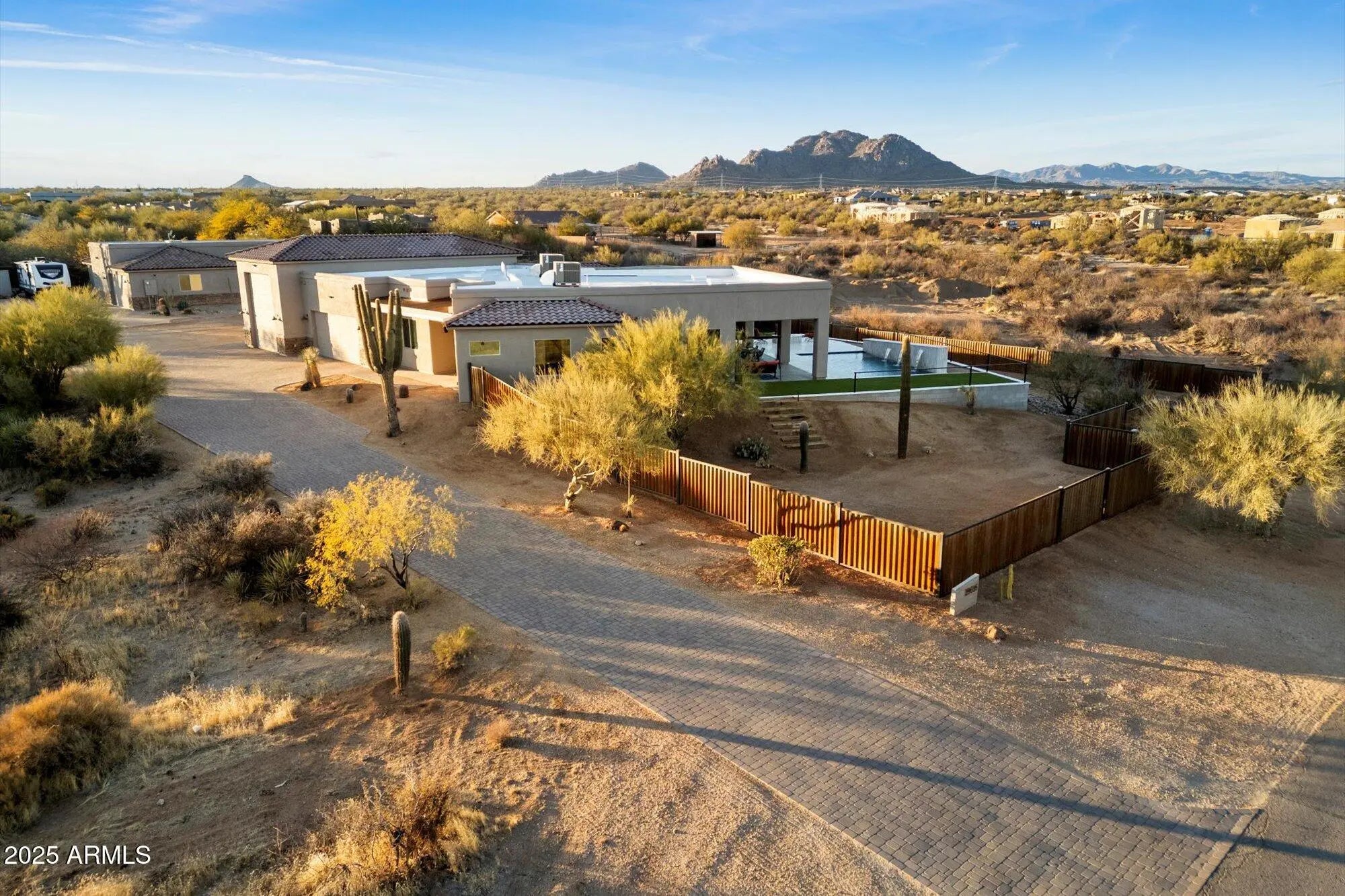 Experience Luxury Desert living in Rio Verde Foothills with breathtaking views. This stunning 1.1 acre property features a 2,882 SF custom home, modern play pool with RV garage PLUS a 1,166 SF custom guest house with two car garage for multi generational living, guests or rental income. Situated on a low-traffic paved road, the spacious paver driveway leads to a 3 bedroom, 3 bath primary residence newly built in 2024. An open floor plan provides abundant natural lighting with 10' ceilings throughout. The gourmet kitchen is truly a chef's dream, complete with quartz countertops, gas range, a massive 5x10 island with bar seating, custom cabinetry and a walk in pantry. The master suite offers a private retreat with gorgeous sunrise views of Four Peaks, a walk through closet thoughtfully designed with built in drawers and shelving, a spa-like bathroom featuring a soaking tub, walk in shower and dual vanities. The outdoor space is equally impressive with a large, covered patio ideal for entertaining. Enjoy views of Granite Mountain from your modern play pool with Baja shelf, water feature, travertine decking and turf. Conveniently close, yet situated far enough away from the main residence is a 1,166 2 bedroom, 2 bathroom guest home with a 2 car garage. This isn't your standard casita, boasting 9' ceilings throughout, the kitchen features stainless steel appliances, an island with seating and beautiful granite countertops. The primary bedroom in the guest home features an en suite bathroom and a serene, fenced yard with dog door access. The garage is an automotive enthusiasts dream with a 49' pull through RV garage plumbed for air and power drops from the ceiling, utility sink, built in cabinets and epoxy floors. There are full RV hookups in two locations, one outside of the main residence RV garage and also next to the guest house. The beautifully landscaped property is complete with drip irrigation and lighting. A strong producing shared well provides reliable water access for the entire property. In addition to its stunning features and amenities, this property is also conveniently located near various recreational opportunities. The nearby Granite Mountain offers a picturesque backdrop for hiking and mountain biking adventures, while the Tonto National Forest boasts OHV trails perfect for off-roading enthusiasts.