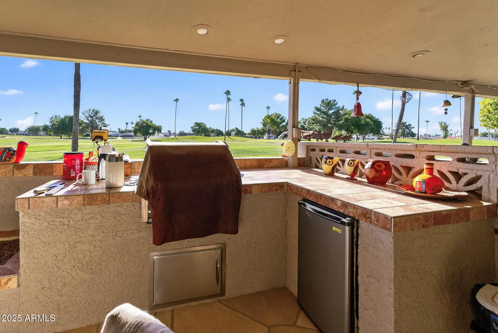 Don't miss this beautifully updated rare 3-bedroom, 2-bath Gemini home perfectly situated on the Lakes West Golf Course, offering breathtaking views of the pond and fountain. Major updates include a new roof (Feb 2021), A/C unit (Sept 2023), and partially owned solar with upgraded leased panels to keep energy costs low year-round. The original atrium has been enclosed, adding valuable additional living space, while the Arizona Room with mini-split A/C provides comfort. Enjoy Arizona living at its best with a partially enclosed back patio, complete with a built-in BBQ and firepit—perfect for entertaining or relaxing outdoors. It is conveniently located near the Sundial Recreation Center and all the wonderful Sun City amenities. This is a must-see home that truly stands out!