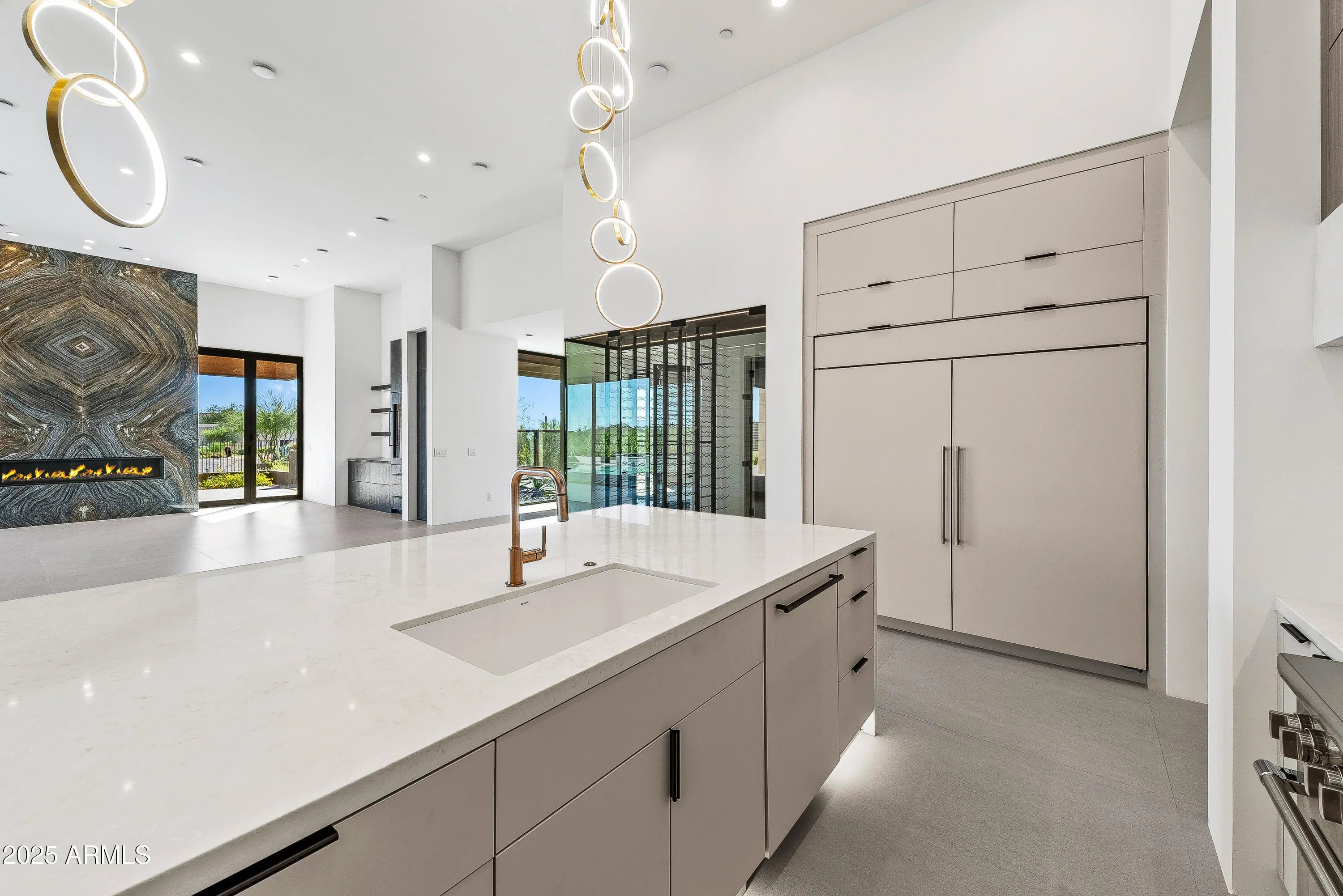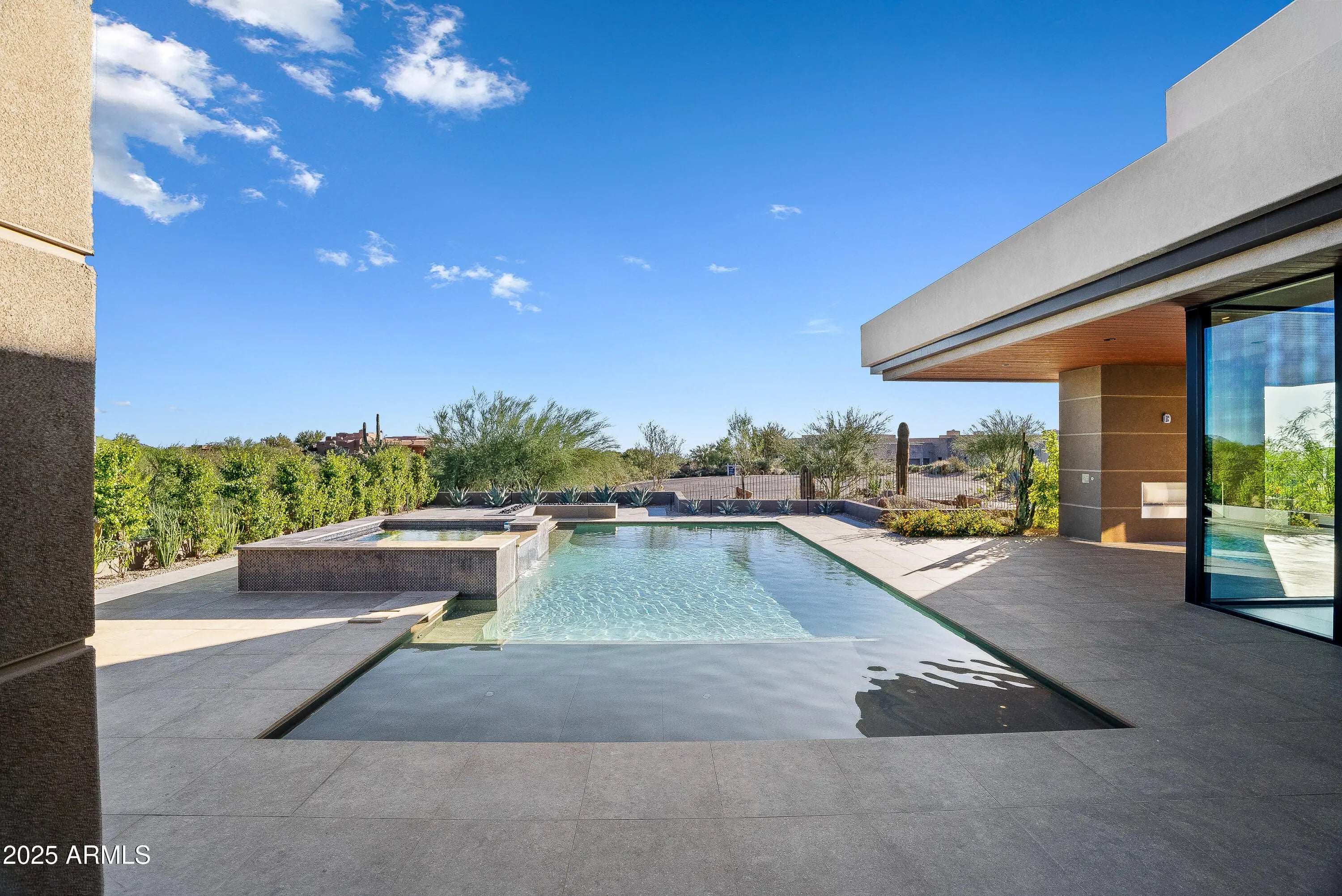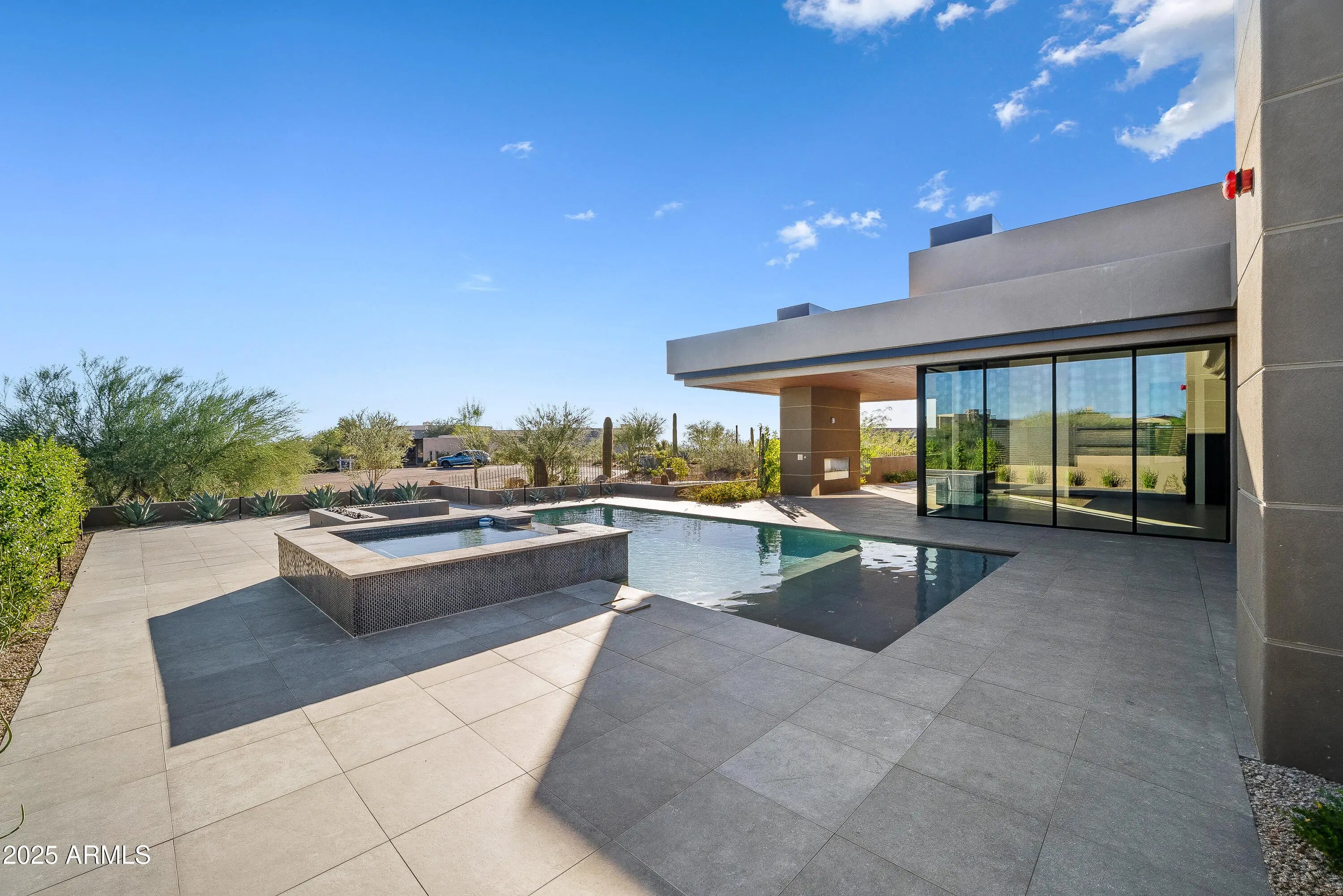 Newly completed, this 4 bedroom, 4.5 bath residence in Desert Mountain, Scottsdale, AZ embodies the art of modern living, designed for the Sonoran landscape by acclaimed architect Brian Raines. On an exceptionally private lot within one of Scottsdale's premier private golf communities. The beautifully curated landscape surrounds the home creating a stunning approach and incredible curb appeal that sets the tone for the refined experience within. As you enter through the stunning glass pivot door, the home opens into a grand yet welcoming great room, where towering floor-to-ceiling glass walls frame the mountains and the ever-shifting desert sky. The space is expansive and intimate, centered around a modern fireplace and a beautiful custom bar complete with a wine refrigerator, cooling drawer, and ice maker perfect for an elegant evening at home. At the center, a chef's kitchen tailored for the culinary purist. Outfitted with the highest-level appliance suite, it features a six-burner gas range, double ovens, integrated refrigerator and freezer, dishwasher, and a built-in Sub-Zero coffee and espresso maker. The expansive quartz island and custom cabinetry showcase the tailored craftsmanship. A fully equipped back kitchen extends the function of the main. Complete with its own refrigerator, cooling and freezer drawers, microwave, sink, dishwasher, and generous pantry storage, it provides an effortless way to host while maintaining visual serenity throughout the main space. The primary suite is a retreat of rare tranquility. A spa inspired bath features dual vanities, a freestanding soaking tub, and a glass shower. The double doors to the outdoors open to a private outdoor spa and shower, surrounded by native desert flora. The custom dressing room includes tailored storage and a built-in clothes steamer for pure luxury. Three well-appointed guest suites, each with a private ensuite bath, offer comfort for your guests. The front guest suite enjoys its own private entrance, making it an ideal space for a home office, art studio, or executive retreat, a thoughtful design detail that adapts beautifully to modern lifestyles. The laundry room mirrors that same attention to detail, with two full washer and dryer sets, another built-in steamer, and functional cabinetry designed for a clutter free environment. Outdoors, an expansive resort-style patio becomes an extension of the home itself. A large pool with a waterfall, integrated spa, and fire feature. And a covered sitting area with a fireplace, ideal for desert evenings. Every moment here feels intentional, grounded, and distinctly Desert Mountain. Completing the property is a five car garage, offering ample space for car enthusiasts or collectors, and another subtle mark of the home's thoughtful scale and refinement. Positioned within Desert Mountain's exclusive golf and lifestyle club, residents may apply for club membership to enjoy access to seven championship golf courses, private dining venues, spa, tennis courts, fitness center, private hiking, and 24-hour guard-gated security. Desert Mountain is Scottsdale's most Northern elevated community at the base of the Continental Mountains and within reach of Scottsdale's world-class restaurants, galleries, and luxury shopping.