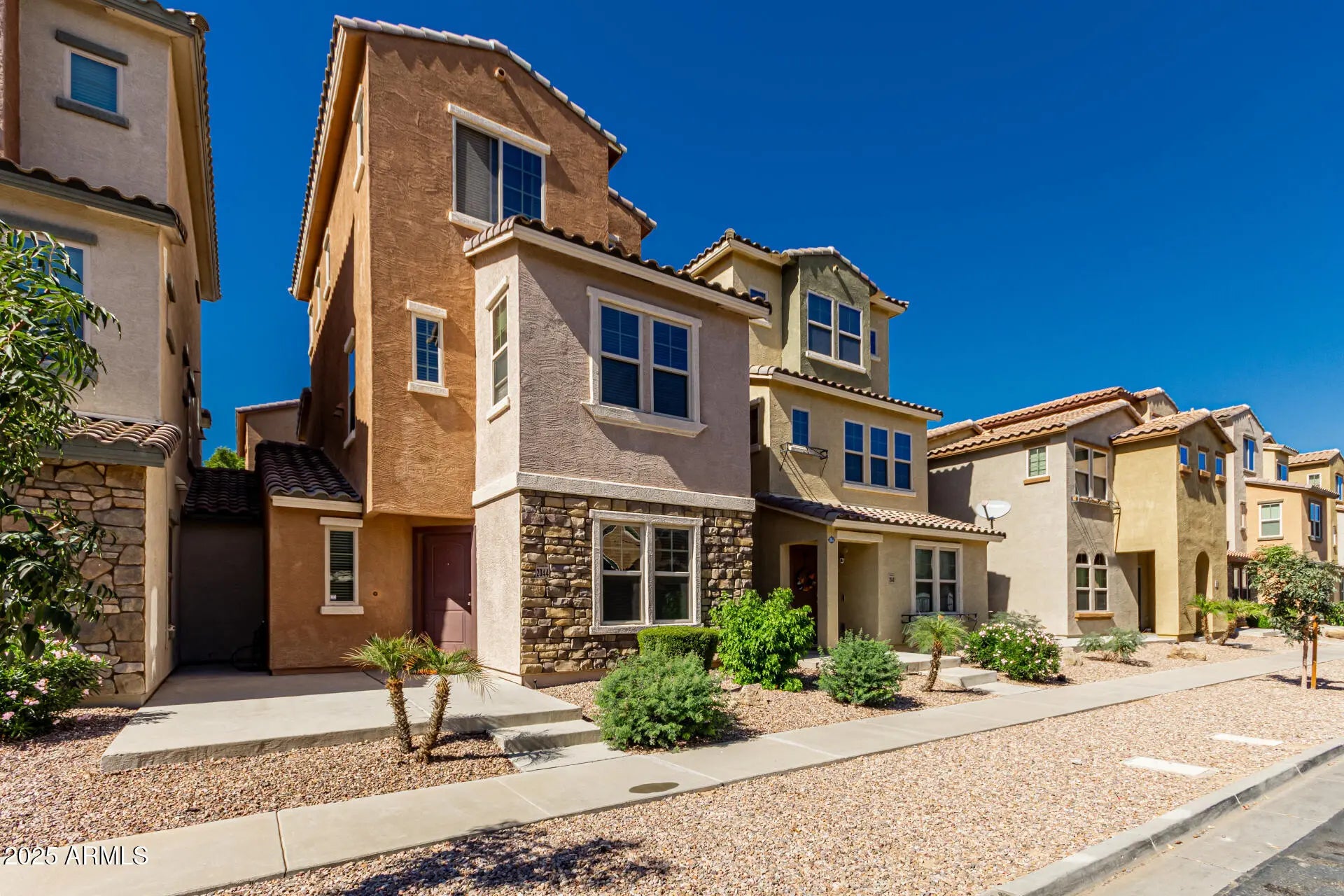 Step into one of Vinsanto's most beautifully prepared homes--freshly painted, newly carpeted, and ready for you to move right in. The entry level features a private bedroom & full bath, perfect for visiting guests, extended family, or a quiet retreat. Head upstairs to a bright and open second floor where everyday living comes naturally. A spacious great room, dedicated office nook, and large dining area flow seamlessly into a functional kitchen equipped with an island, pantry, stainless steel appliances, and plenty of storage. The top floor offers two generous primary suites, each with ample closet space. An attached two-car garage with an EV charging outlet adds modern convenience. With the HOA handling exterior landscaping, you can spend more time enjoying the community's two pools, park Ideally located with excellent freeway access, this home is just 20 minutes from downtown Phoenix, minutes from premier shopping and dining, and only 15 minutes from the Cardinals' entertainment complex.