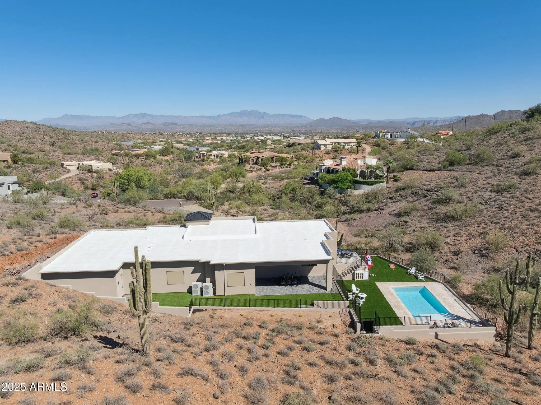 Perfect for an active family! This 2025 custom home sits on 1.28 acres with big Four Peaks views in front and peaceful Sonoran Desert beauty behind and so many beautiful Saguaros! Entertain easily in the resort-style backyard with turf, a beautiful pool, multiple patios, stunning views and room for games galore! Inside, the chef's kitchen dazzles with a Cafe 6-burner gas range, double ovens, quartz counters, and a massive center island, plus a 130-bottle wine cooler. Enjoy 3 full suites, each with spacious closets. The Primary offers a freestanding soaking tub, walk-in shower, elegant closet, and a private patio ideal for morning coffee or reading. A large den and oversized 4-car garage complete the package. There is no HOA or NPOA fees.