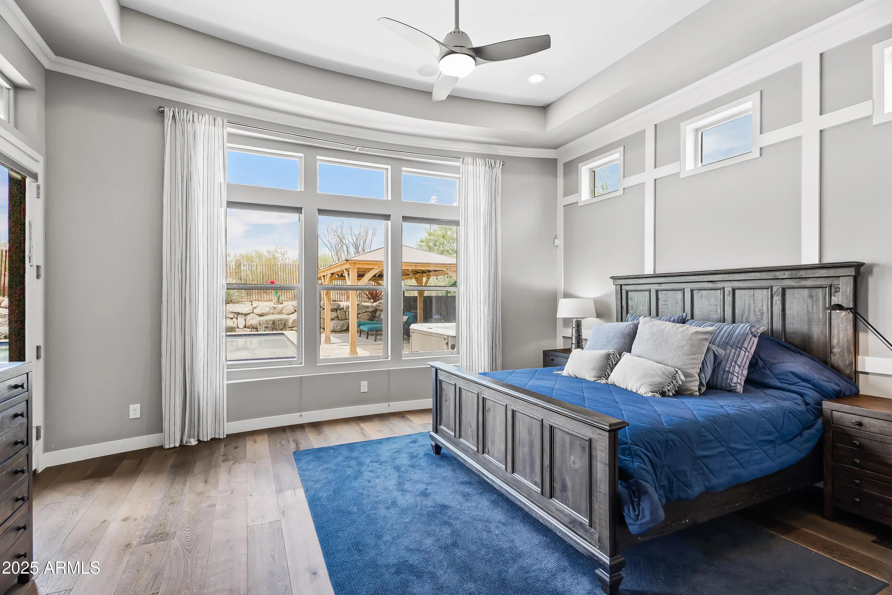 Stunning former model home with builder upgrades in Copper Sky! This modern single-level residence offers premium finishes and a sophisticated open split floor plan. Includes 3 spacious bedrooms, 3.5 baths, and a 3-car garage with detached single bay. The Chef's kitchen features high-end stainless-steel appliances, multiple ovens, oversized island, custom ceiling-to-floor cabinetry, back kitchen, walk-in pantry, and formal dining areas indoors and out. The great room showcases cornerless bifolding doors, wood floors, a wet bar, and Sonos surround sound—perfect for Arizona's indoor/outdoor lifestyle. Enjoy mountain sunsets from the resort-style backyard with heated pool, Sundance spa, fire pit, cedar canopy, built-in BBQ, full poolside bath, artificial turf, and lush landscaping. The luxurious primary suite offers backyard access, private den, spa-style bath, and custom walk-in closet with direct laundry access. Move-in ready and impeccably maintainedScottsdale living at its finest!
