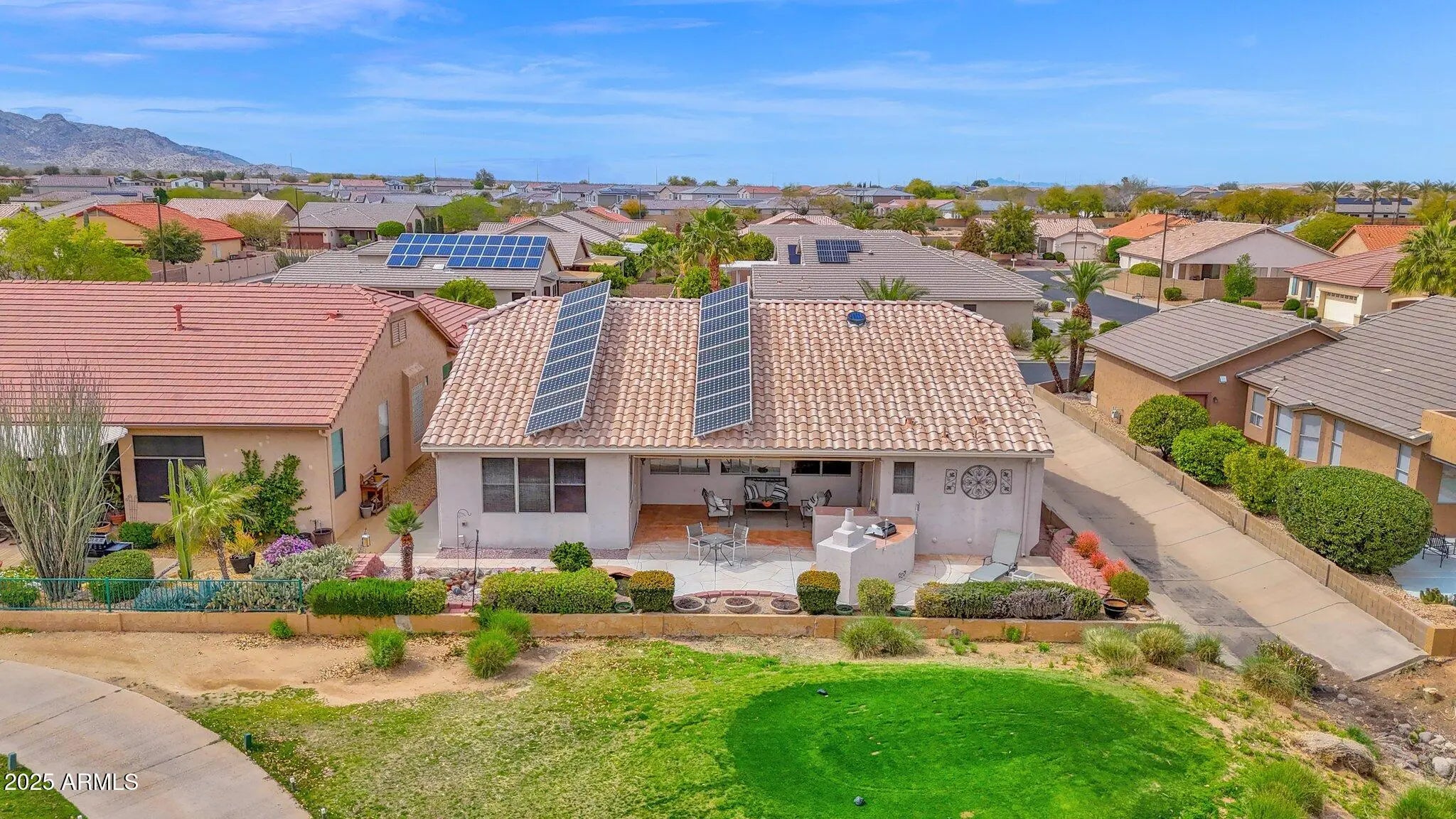 Experience resort-style golf course living in the guard-gated Arizona Traditions community! Perfectly positioned on a premium fairway lot, this beautifully maintained 2-bedroom + den, 2.5-bath home showcases open-concept living, elegant tile flooring throughout, and panoramic views of the lush course. Enjoy seamless indoor-outdoor living with a covered patio, built-in BBQ, and peaceful water feature—ideal for entertaining or unwinding. Inside, granite countertops, plantation shutters, and designer touches enhance every room. Arizona Traditions offers a clubhouse, heated pools, golf, pickleball, tennis, fitness, and endless social events—all in a secure 55+ setting. Located on one of Arizona Traditions' most desirable golf course lots, this single-level home blends style, comfort, and resort amenities in perfect harmony. The open-concept floor plan welcomes you with bright natural light, tile floors throughout, and a spacious kitchen with granite counters and upgraded cabinetry. Enjoy relaxing evenings on the covered patio with its built-in grill, tranquil fountain, and panoramic golf views. Inside, two large bedrooms and a versatile den provide flexibility for guests or home office space. The primary suite features dual sinks, a walk-in shower, and generous closet storage. Beyond the home, Arizona Traditions offers resort-style living with an 18-hole golf course, fitness center, pickleball and tennis courts, swimming pools, walking trails, and a full calendar of social eventsall within a friendly, gated 55+ community.