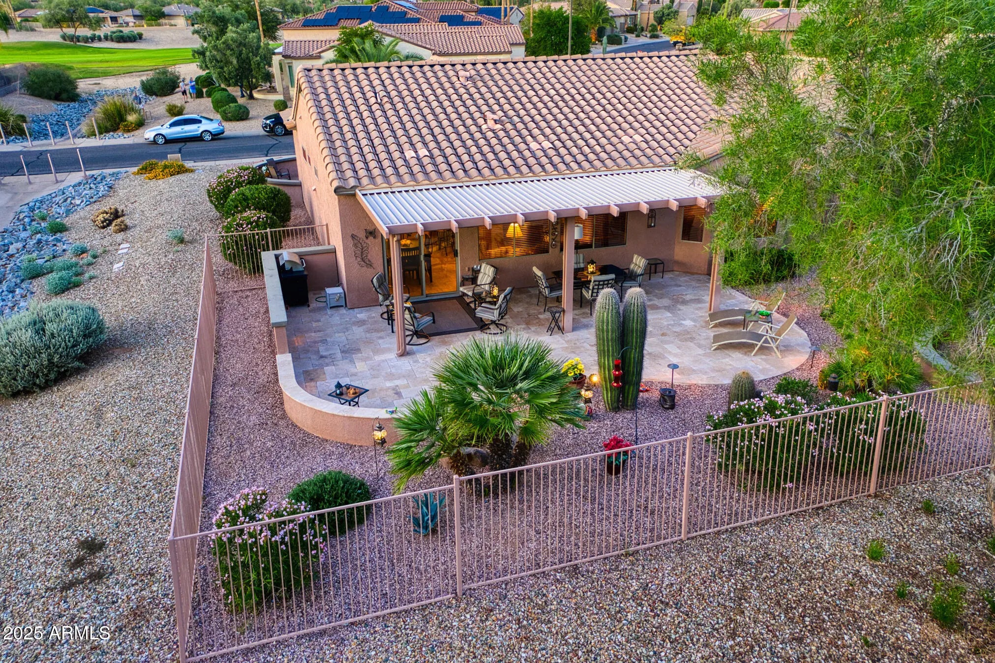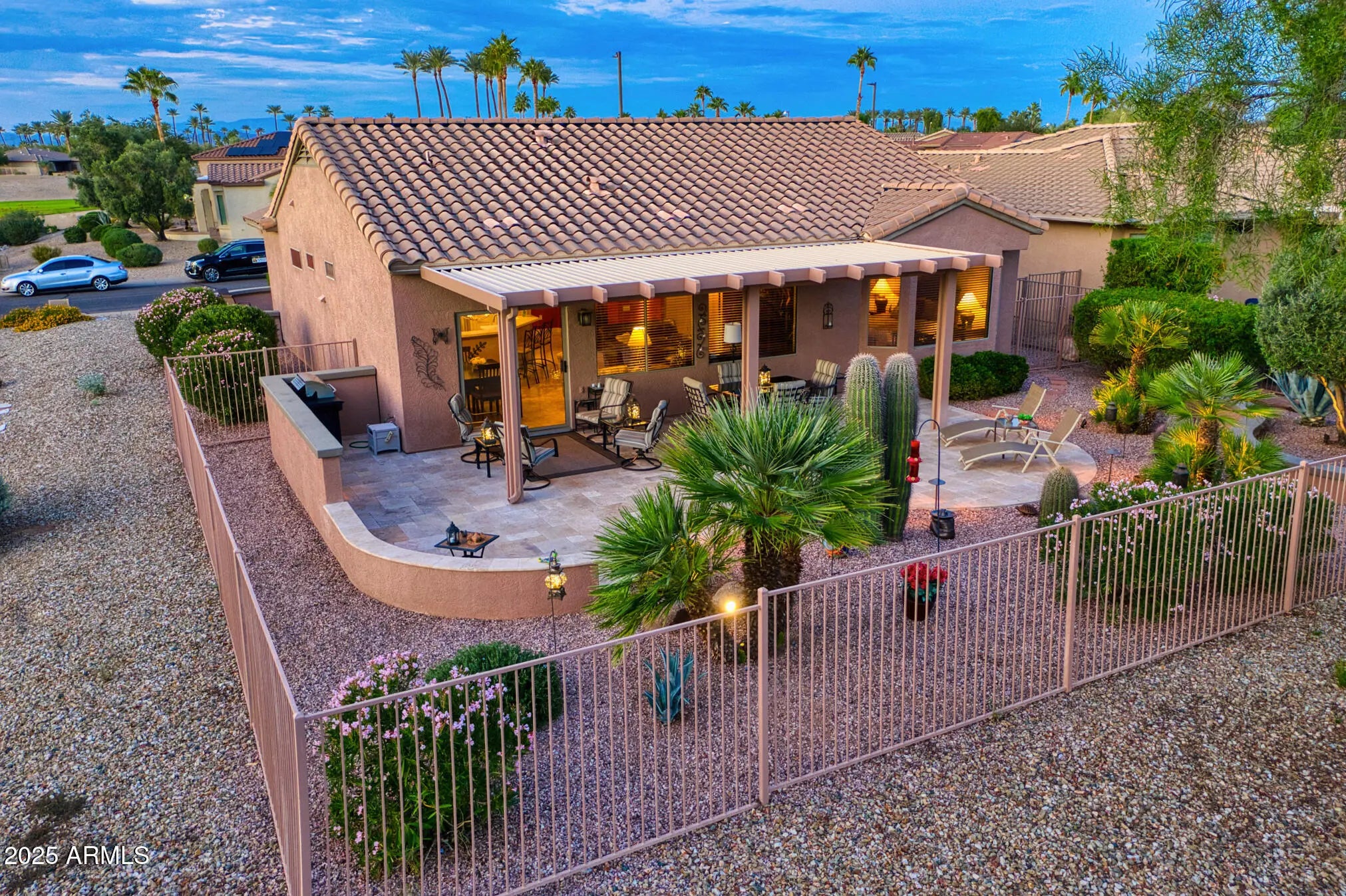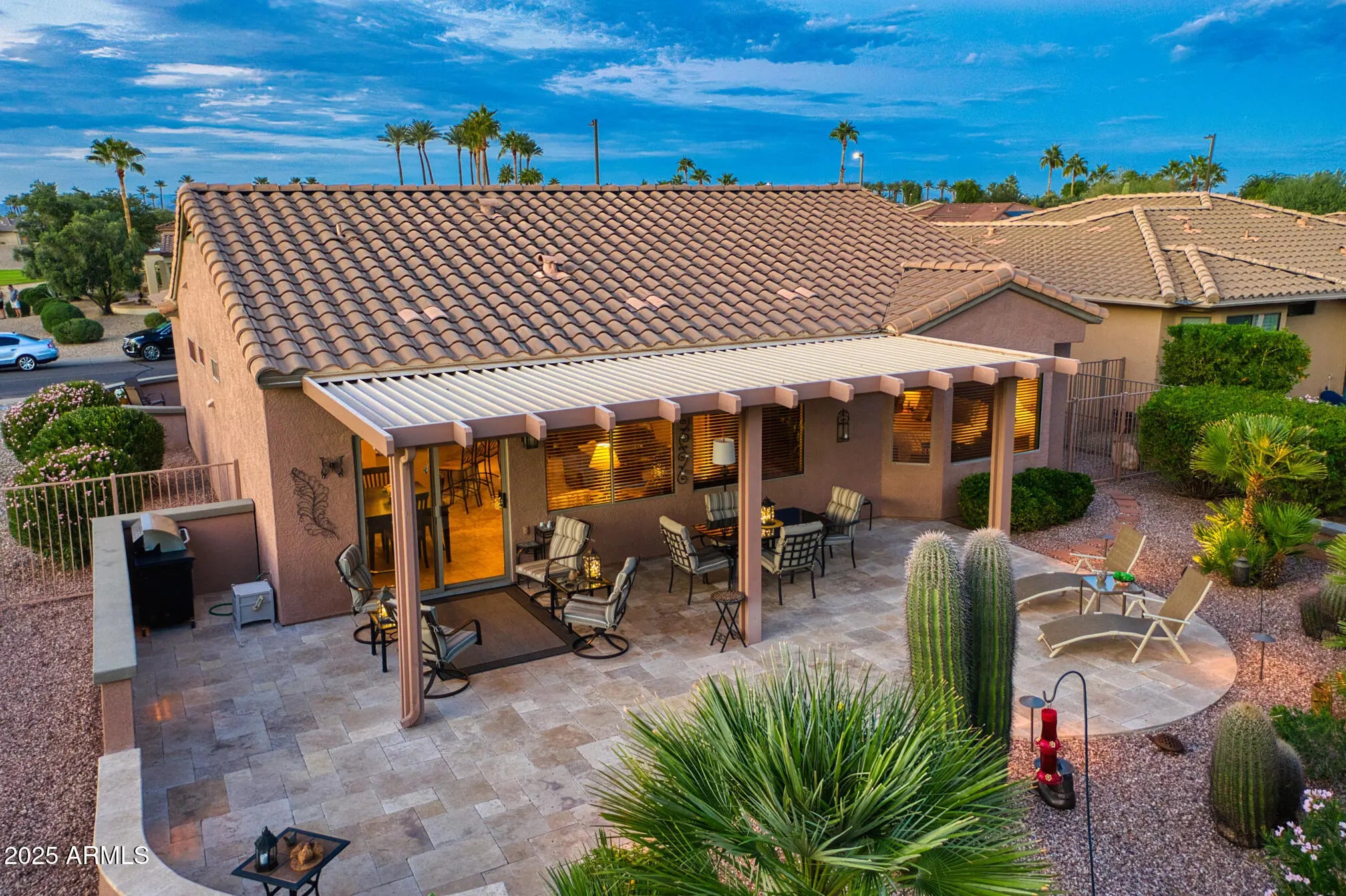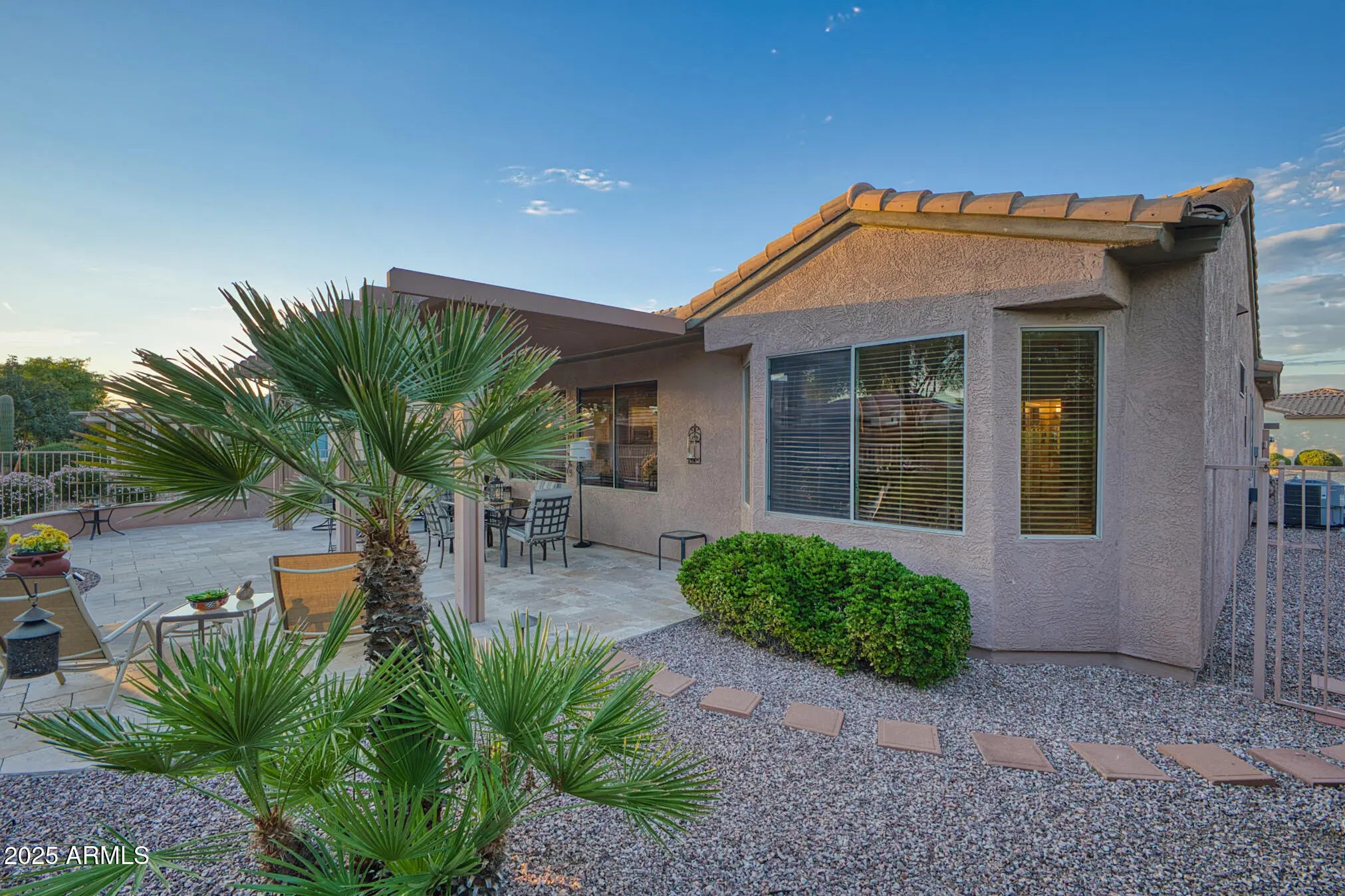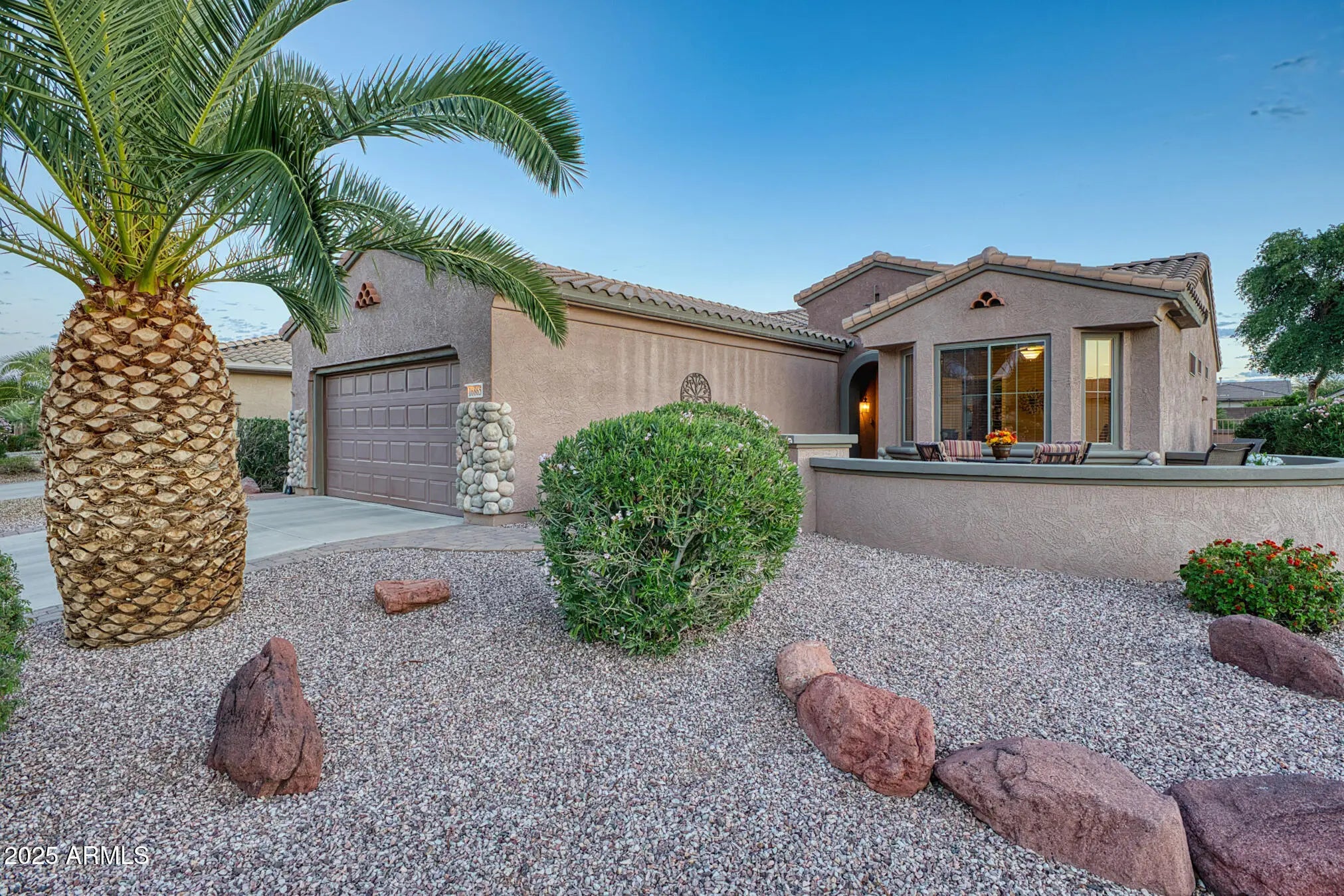 This beautifully updated and appointed AZALEA is truly turn-key! Situated on a desirable lot w/ a peek-a-boo view of the golf course in front & a natural desert wash to the side. Stunning curb appeal, a charming pavered courtyard framed by low walls & a river-rock stone facade offer a warm, inviting entry. The tastefully remodeled kitchen complete w/new white cabinetry, quartz countertops, glass tile backsplash, stainless steel appliances, including a range w/both convection & conventional ovens. Neutral tile flooring thru-out, custom paint tones & stylish finishes add warmth & style. Bathrooms feature updated cabinetry and quartz countertops, while the primary suite and one guest room each boast bay windows for added space and abundant natural light. The fenced backyard overlooks a tranquil natural desert preserve and walking traila perfect setting for Arizona sunsets. Additional highlights include a 2021 HVAC system, extended 2-car garage & a brand-new smart electric garage door opener. Enjoy comfort, style, & privacy in this move-in ready homea blend of beauty and function inside and out.