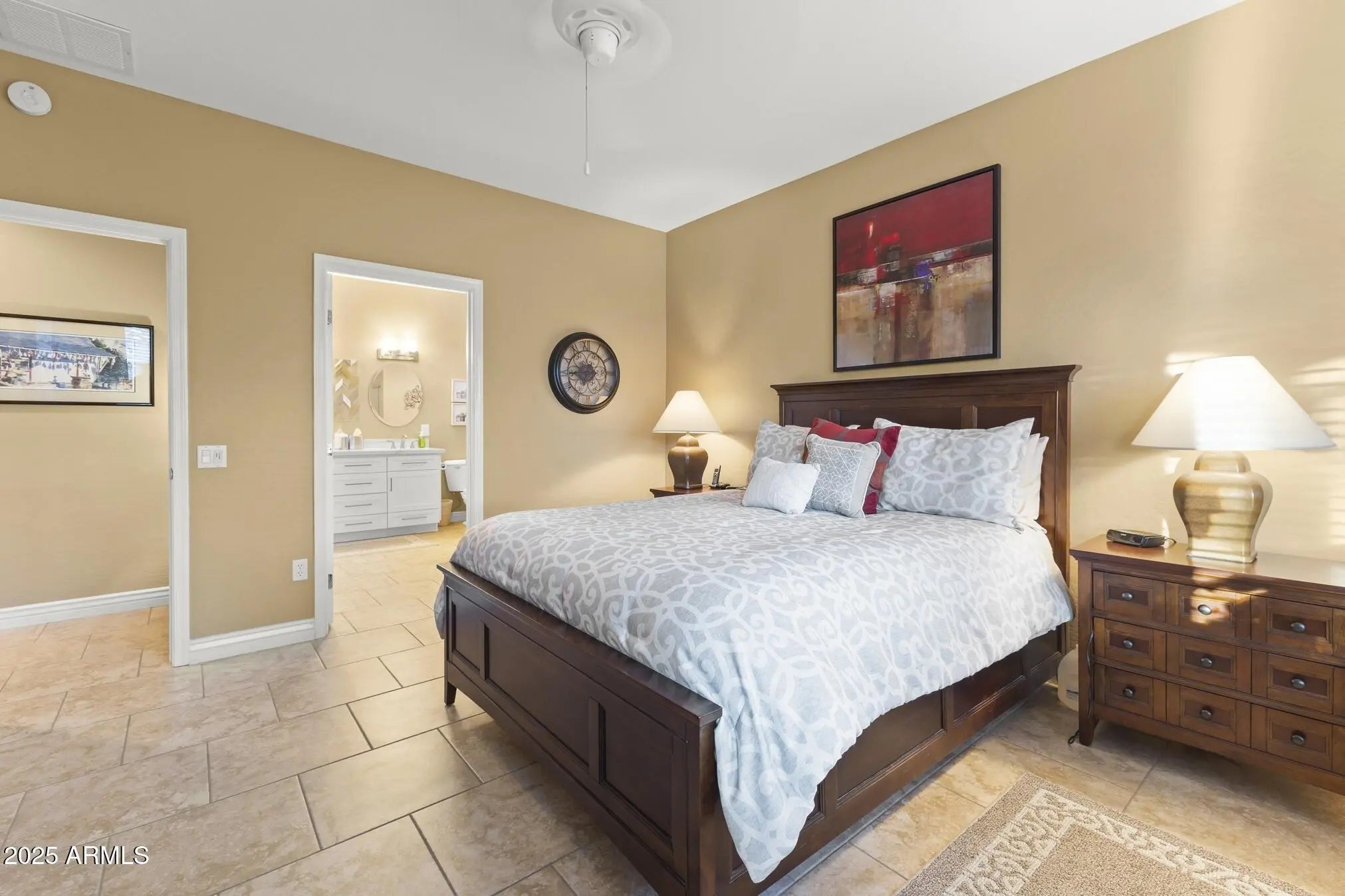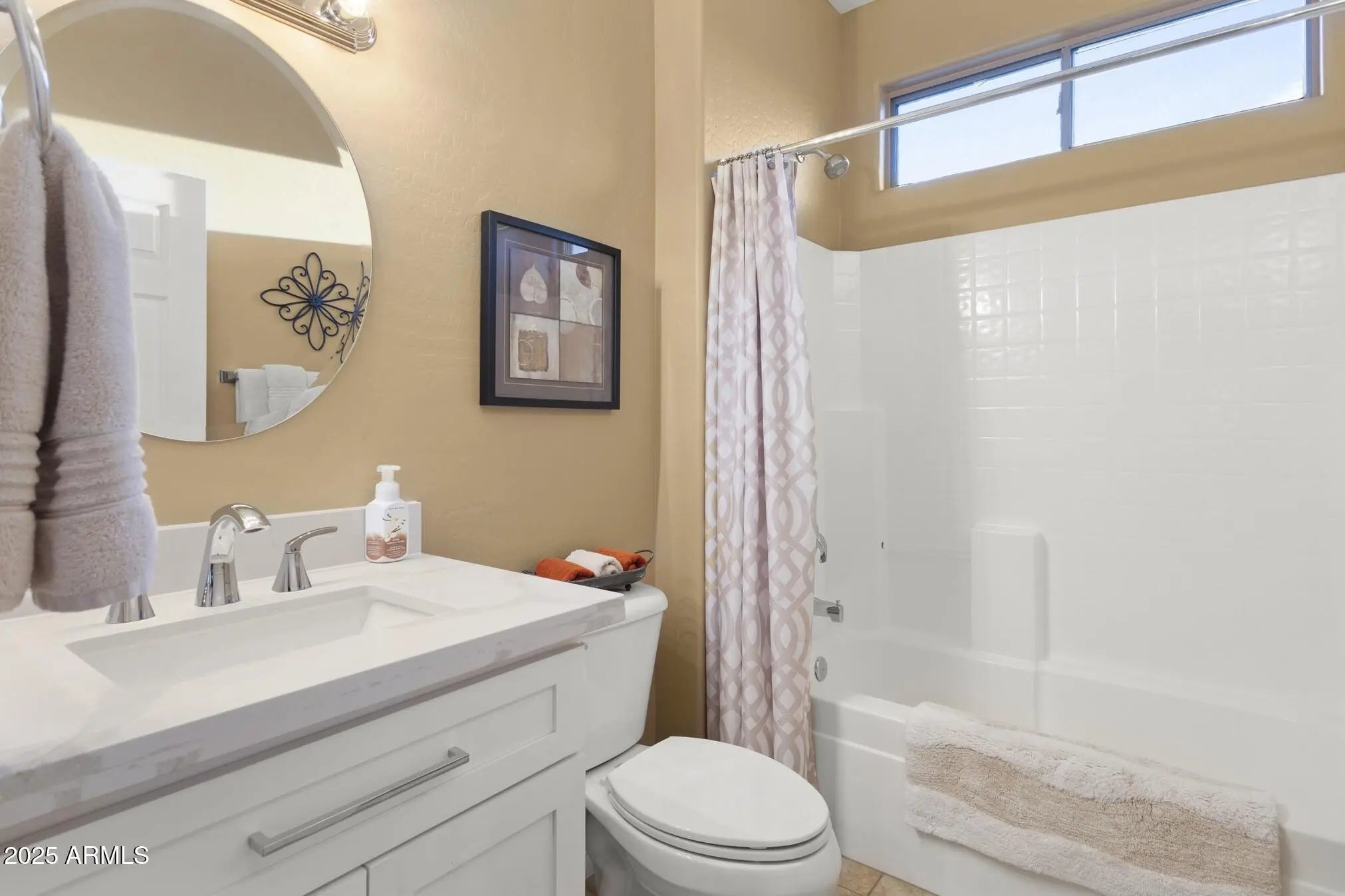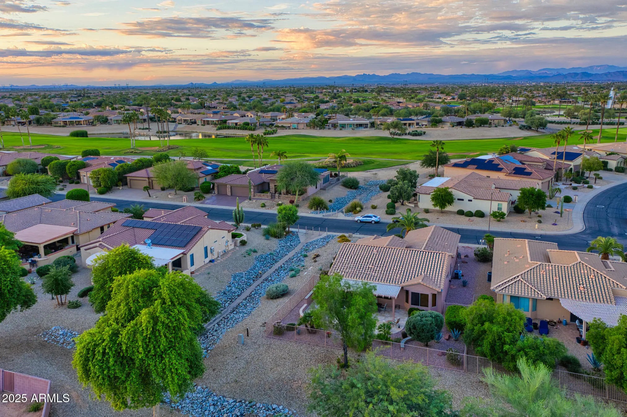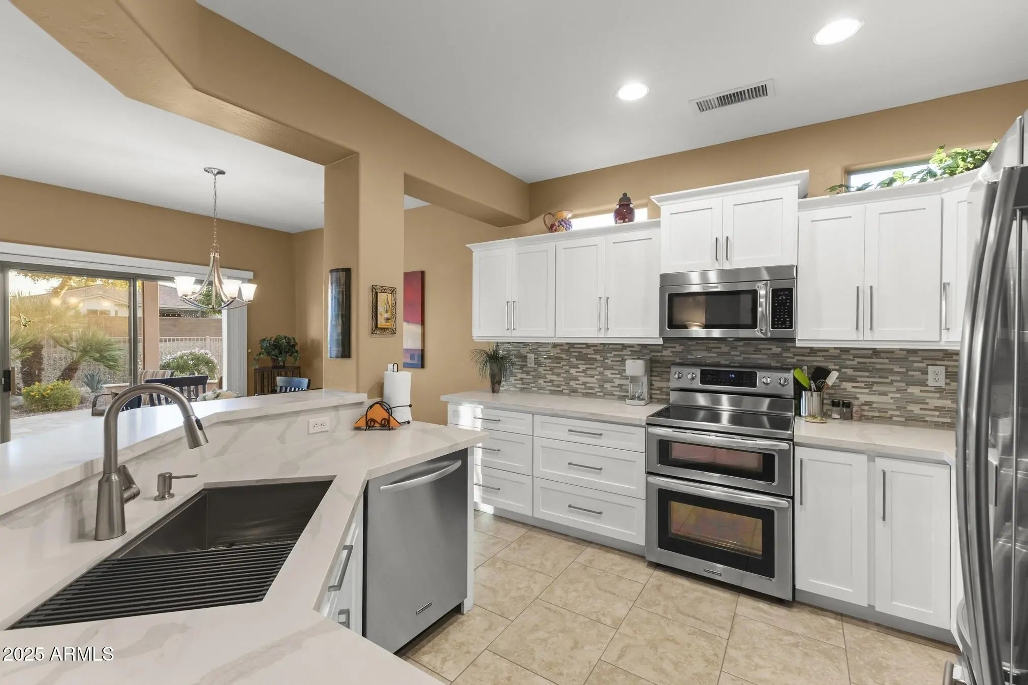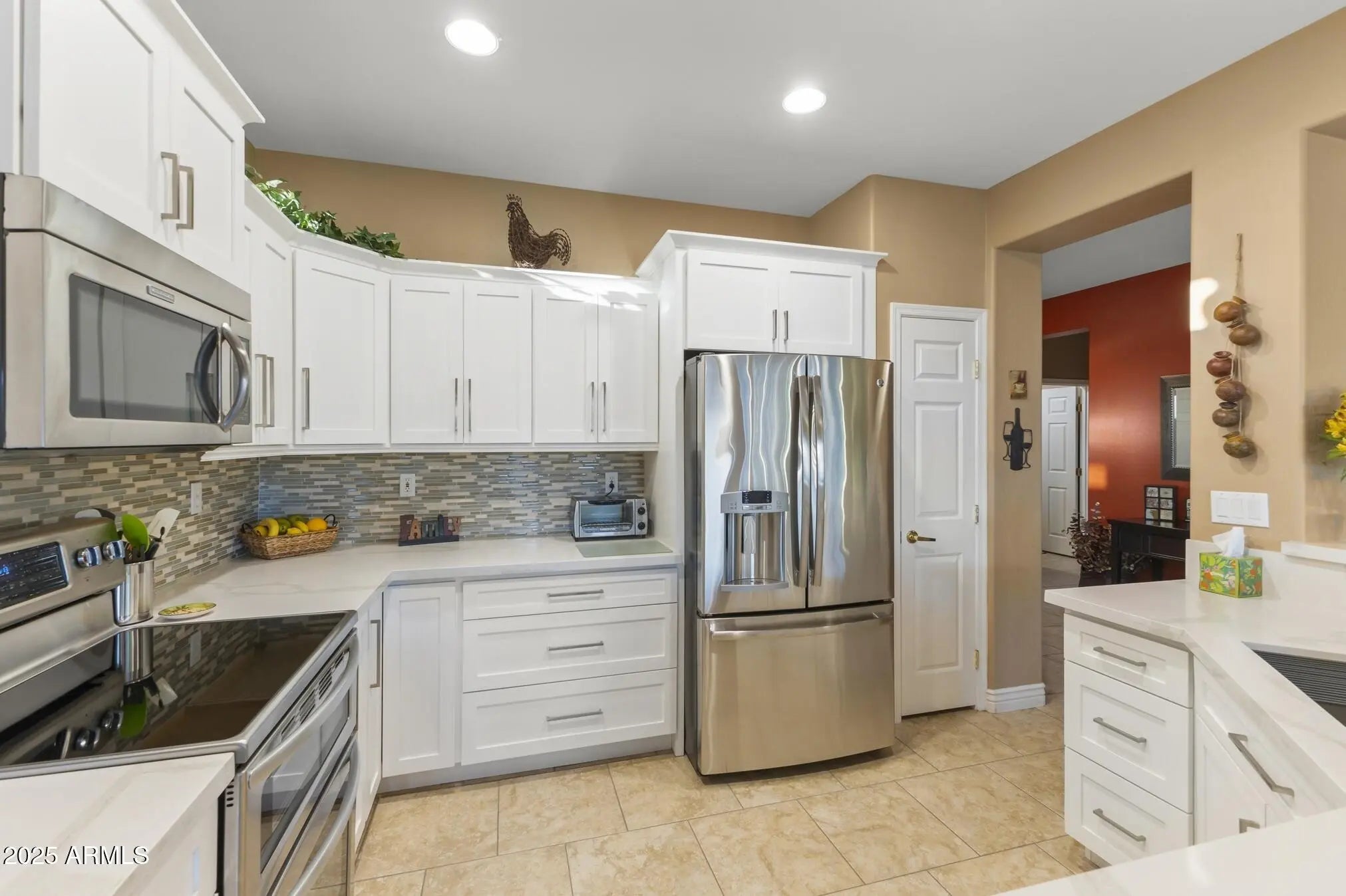 This beautifully updated and appointed AZALEA is truly turn-key! Situated on a desirable lot w/ a peek-a-boo view of the golf course in front & a natural desert wash to the side. Stunning curb appeal, a charming pavered courtyard framed by low walls & a river-rock stone facade offer a warm, inviting entry. The tastefully remodeled kitchen complete w/new white cabinetry, quartz countertops, glass tile backsplash, stainless steel appliances, including a range w/both convection & conventional ovens. Neutral tile flooring thru-out, custom paint tones & stylish finishes add warmth & style. Bathrooms feature updated cabinetry and quartz countertops, while the primary suite and one guest room each boast bay windows for added space and abundant natural light. The fenced backyard overlooks a tranquil natural desert preserve and walking traila perfect setting for Arizona sunsets. Additional highlights include a 2021 HVAC system, extended 2-car garage & a brand-new smart electric garage door opener. Enjoy comfort, style, & privacy in this move-in ready homea blend of beauty and function inside and out.