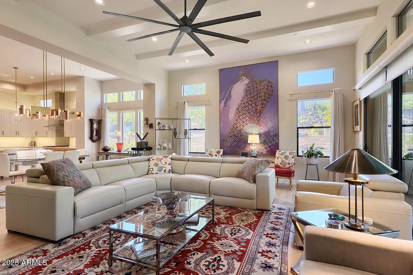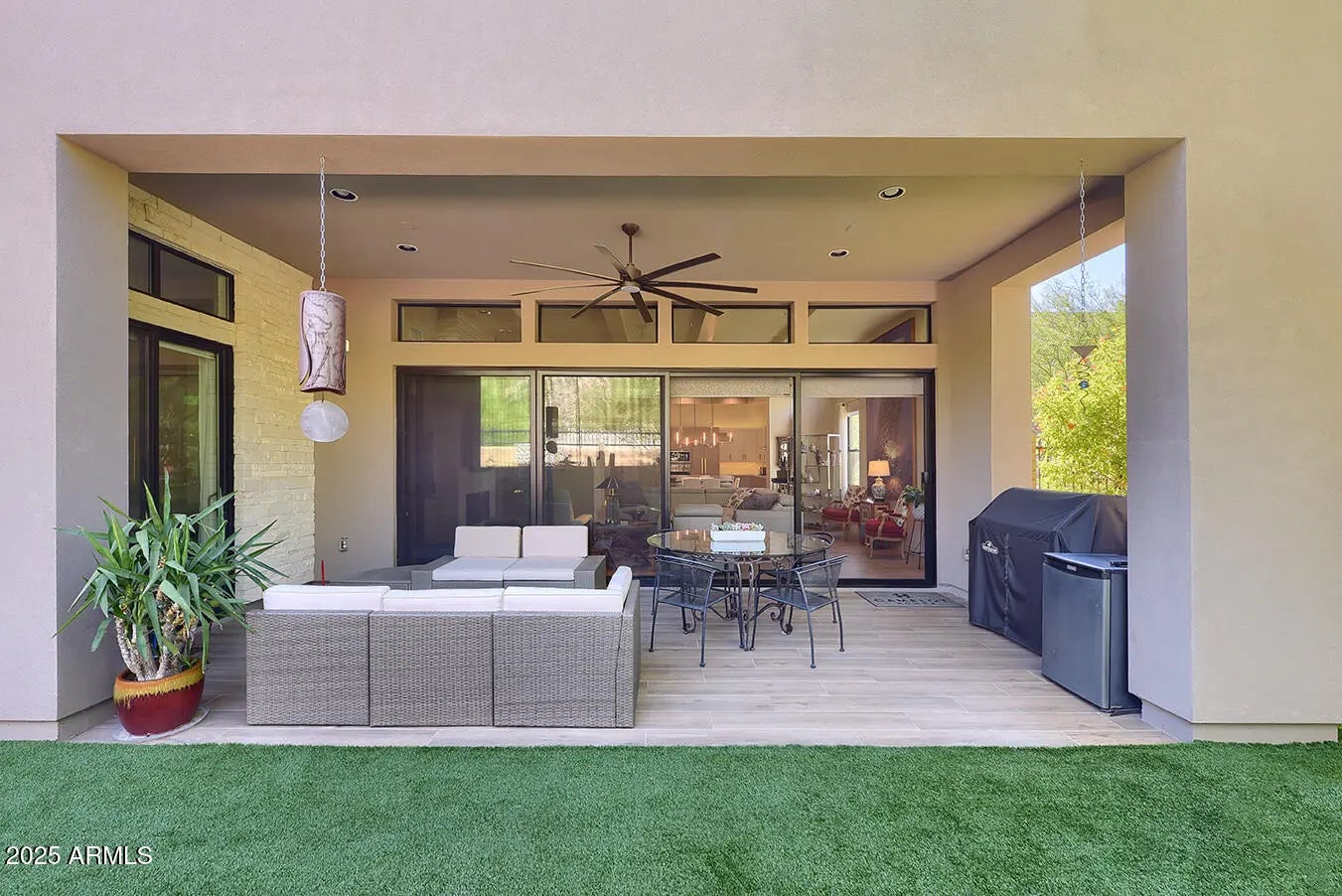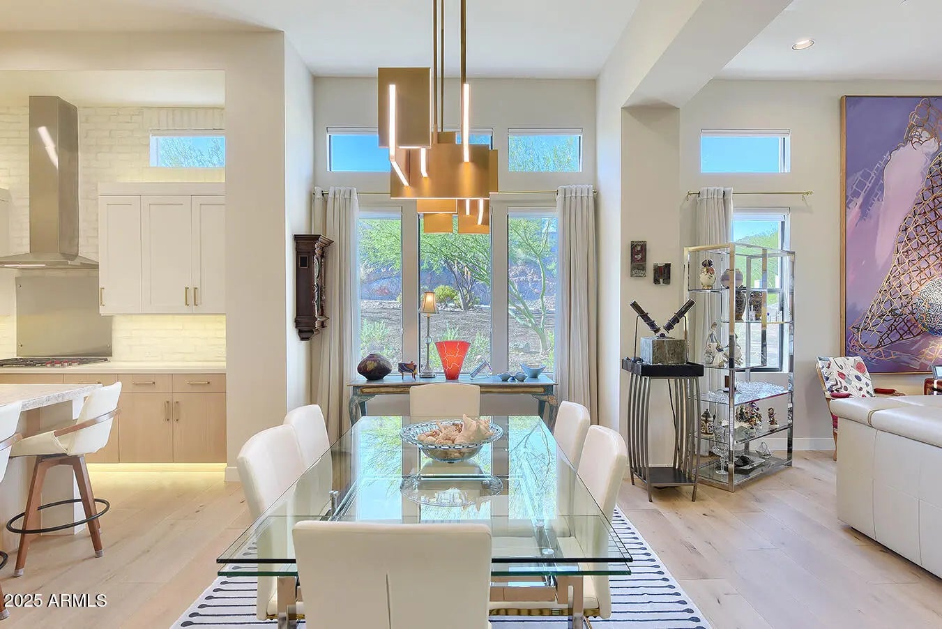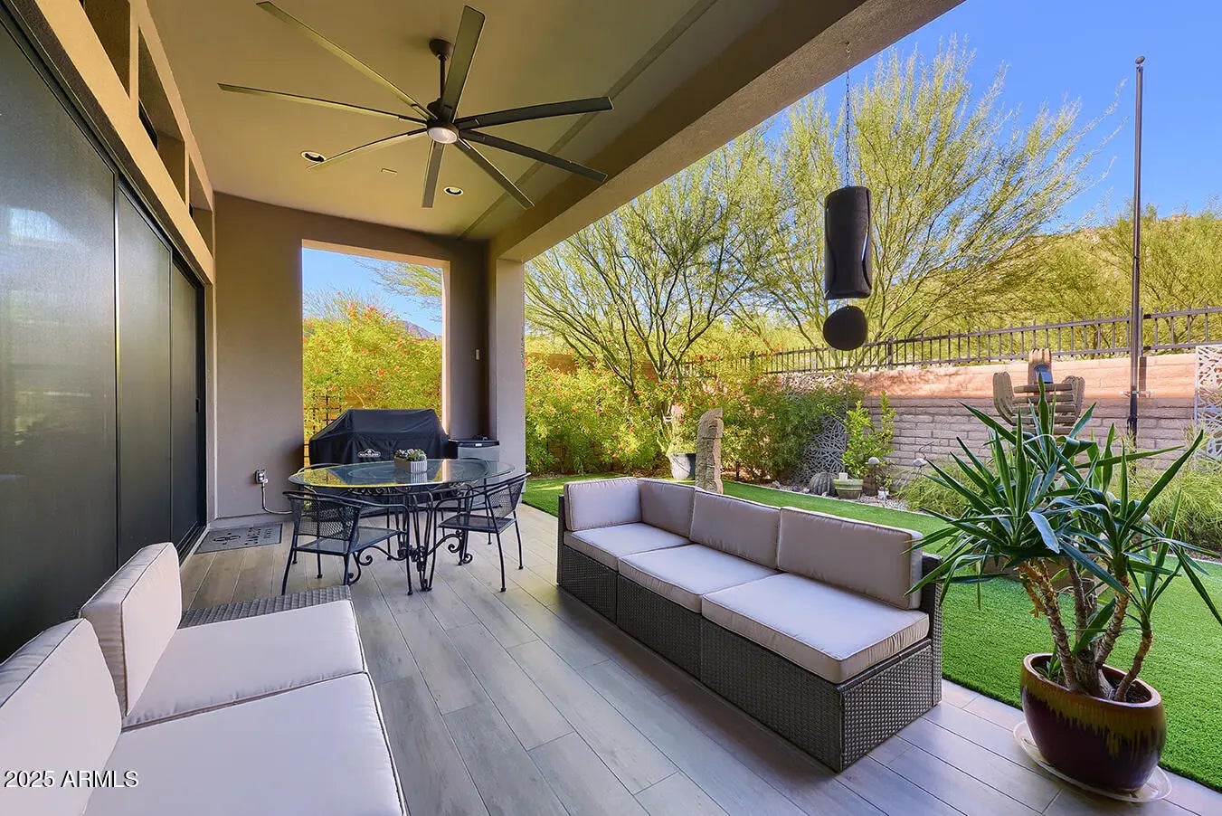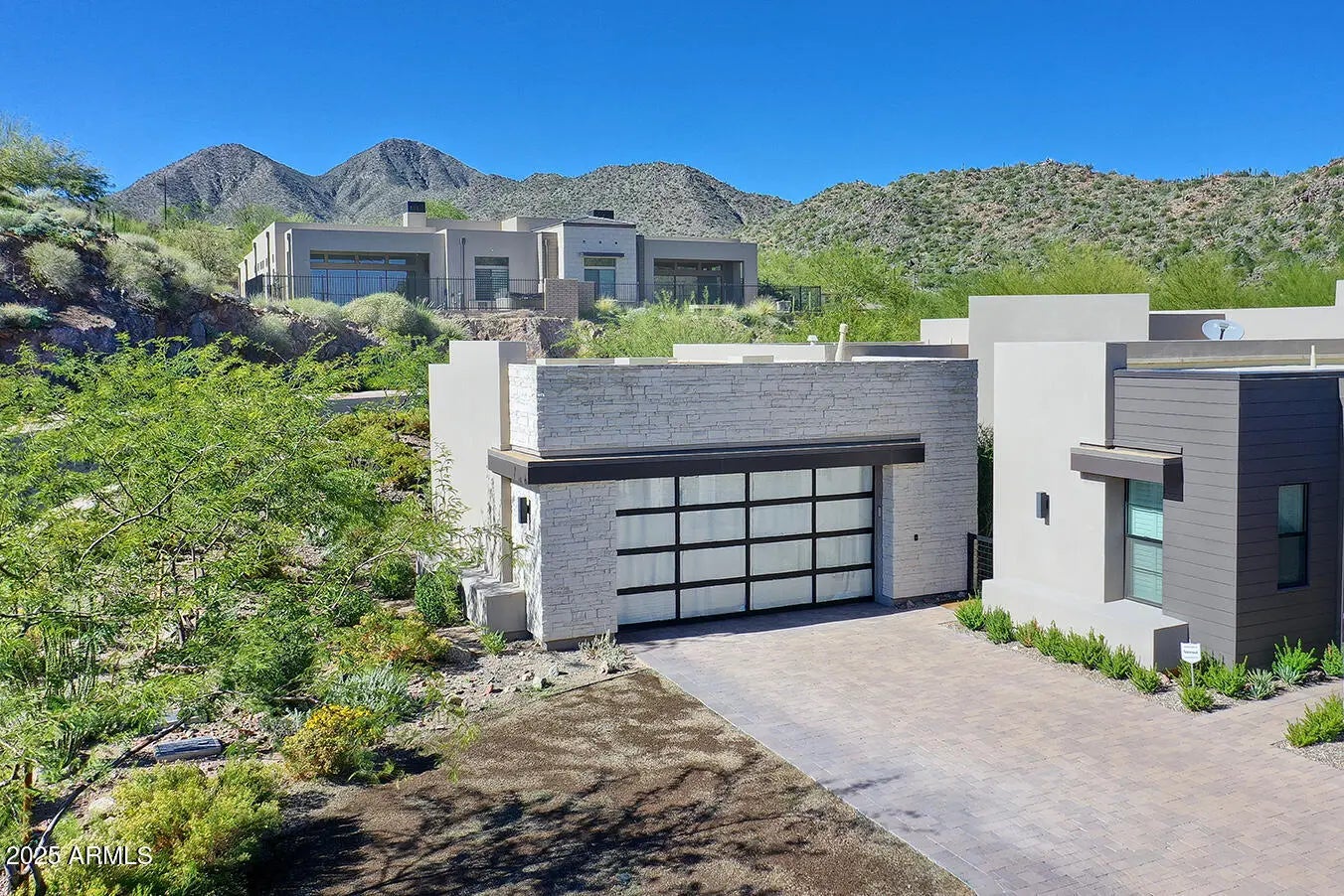 A rare opportunity to enjoy majestic Mountain views inside and out! Modern luxury single level home impresses in every way. 2 bdrm plus den, 2-1/2 bath villa w/3+ car garage is centered around indoor/outdoor living w/an open great room, 12' ceilings - impressive contemporary architecture. A rotunda entry welcomes guests w/ custom iron door. Gourmet Chef's kitchen features upgraded gas Wolf/Sub Zero SS appliance package w/an oversized kitchen island w/upgraded countertops and generous walk-in pantry. 8 ft. solid core interior doors throughout and hardwood flooring. Exquisite lighting, clerestory windows enhance the light in the kitchen w/automated window coverings. Panoramic windows in living/dining area w/floor to ceiling gas fireplace. Escaping wall of pocket doors in living room make entertaining so easy! Retreat to an oversized romantic primary bedroom w/special lighting, spacious sitting area and exit to outdoor patio. A spa-like bathroom w/dual raised vanities, oversized seamless walk-in shower, make-up area, generous walk-in closet which is a MUST! Split private spacious guest suite features an en-suite bath with walk-in shower and glass enclosure. Elegant powder room with exquisite floor-to-ceiling designer tile. Spacious den offers a work-from-home space or whatever your needs may be. Step out back and enjoy a tranquil private oasis offering a spacious covered patio, BBQ, fountain, artificial turf for easy maintenance, lush landscaping and beautiful AZ mountain views. Car lovers will appreciate the oversized epoxy 3.5 car garage with cabinets galore. This could be a rare 4 car garage if you remove the front cabinets. Too many upgrades to mention - ONE NOT TO BE MISSED!