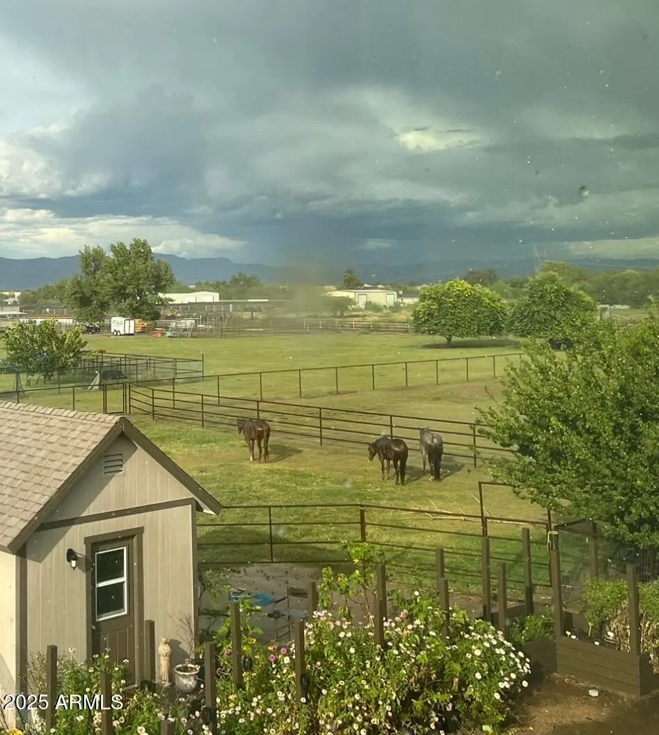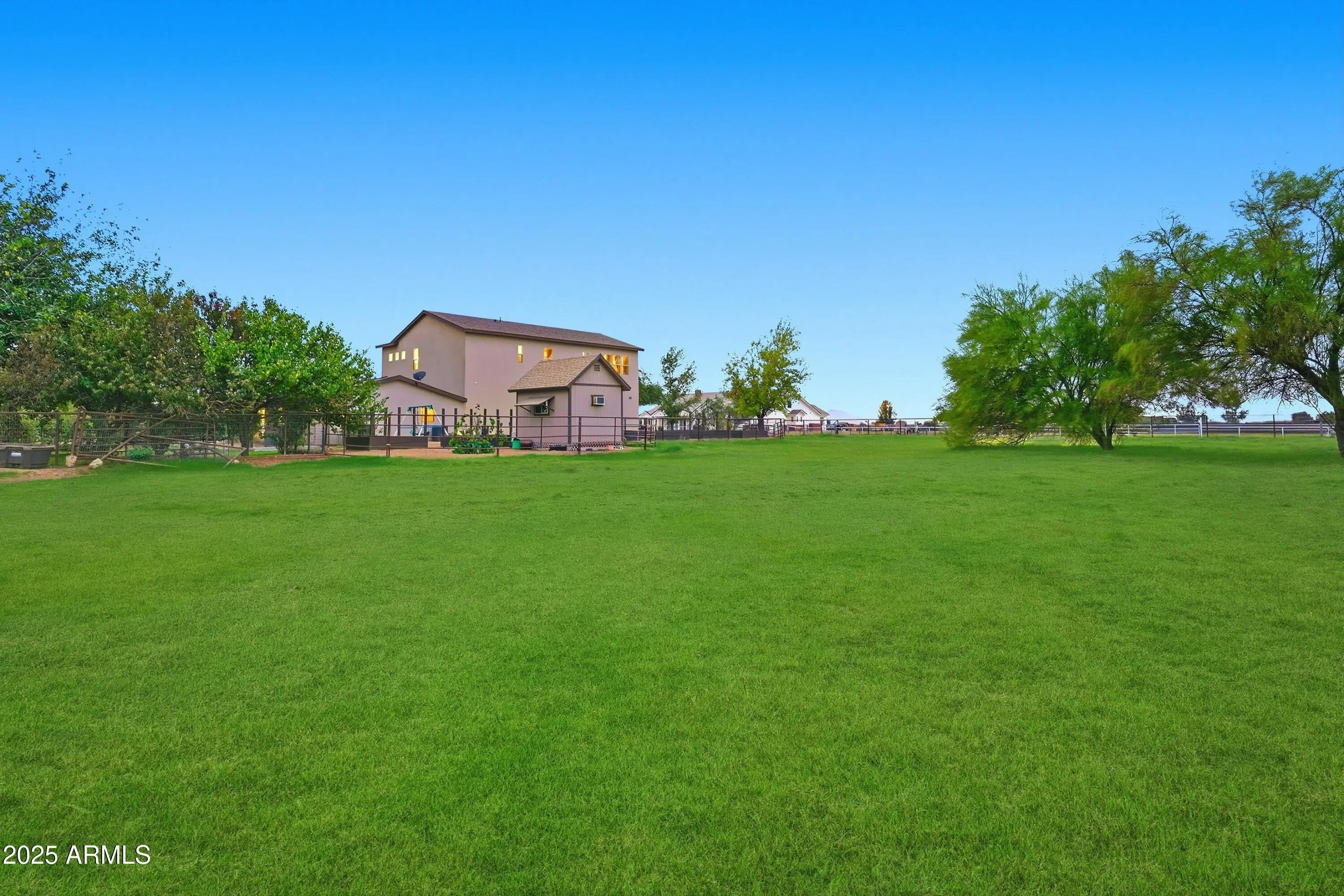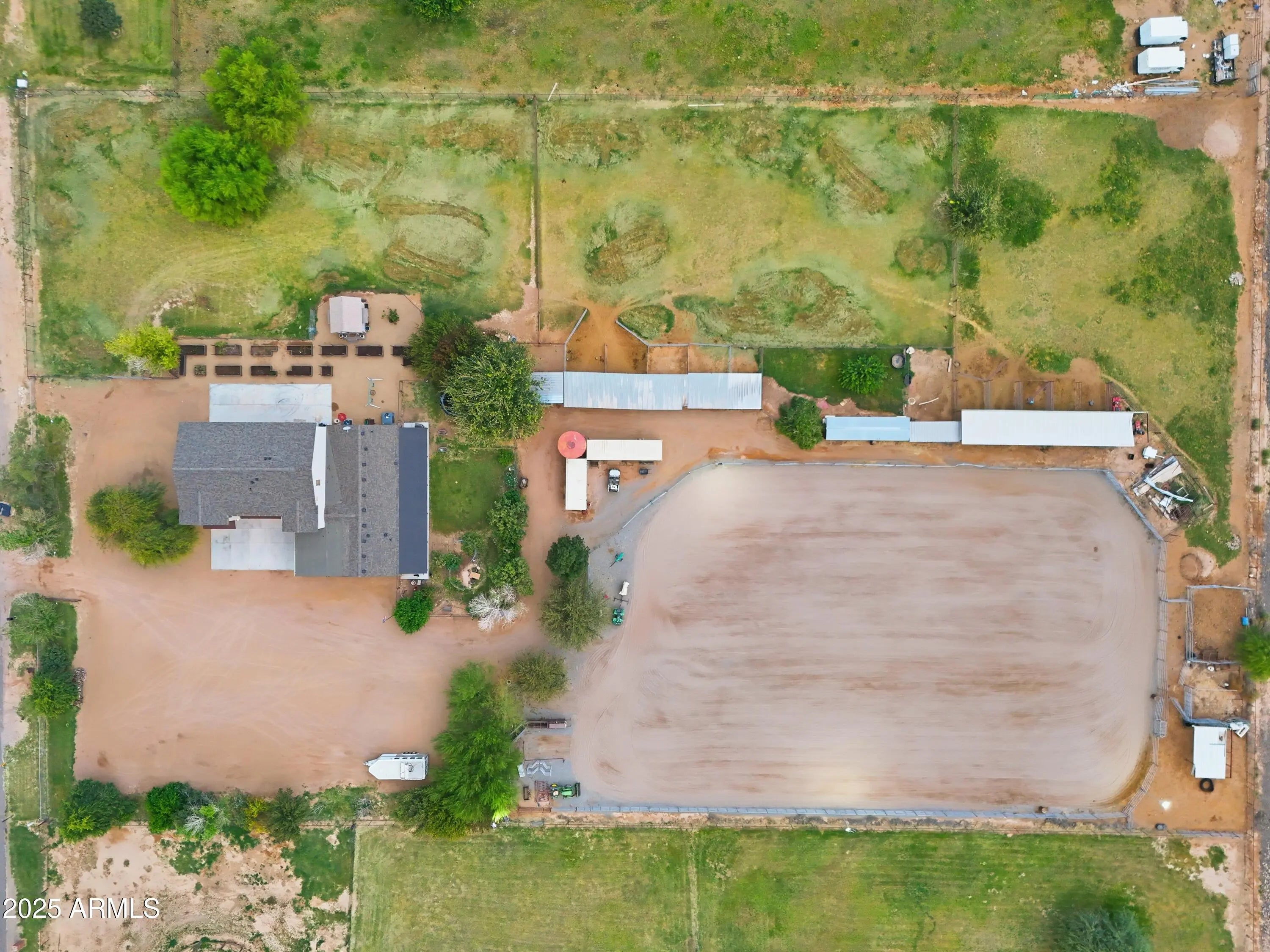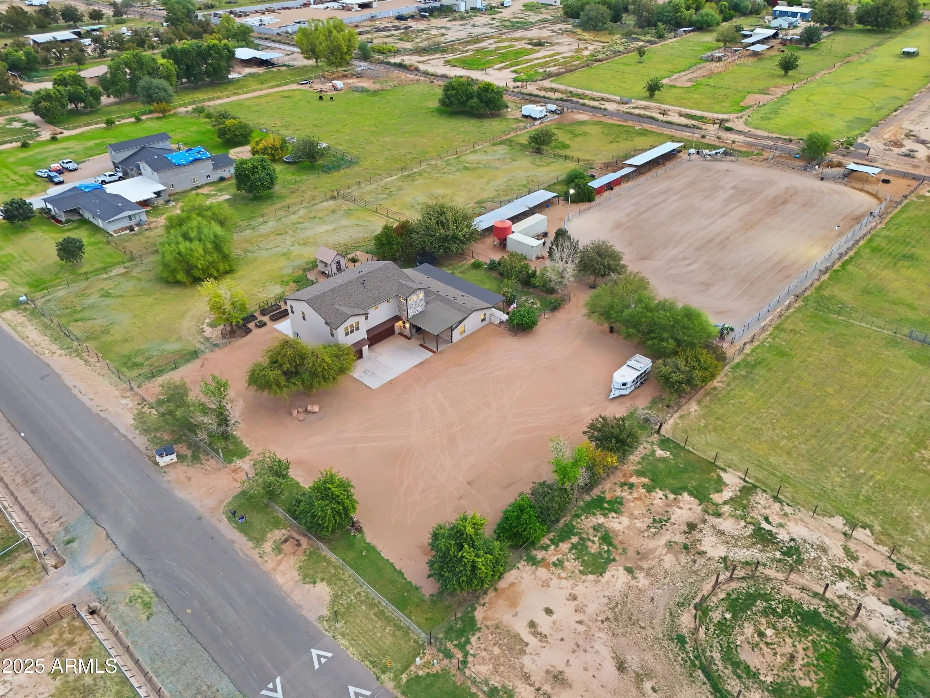 The perfect blend of fine living and true country charm on this exceptional 3.33-acre horse property. Thoughtfully designed and impeccably maintained, this property offers over an acre of flood-irrigated, cross-fenced pastures—ideal for horses or livestock—plus a beautifully updated 5-bedroom home with two full master suites and four well-appointed baths. Step inside to a gorgeous recently remodeled kitchen featuring a 36'' gas range with convection oven, oversized sink, modern finishes, and plenty of workspace. The split floor plan provides privacy and multigenerational living options, while the relaxing primary suite includes dual sinks and two spacious custom his-and-hers closets. The home also features a safe/gun room, two laundry rooms, and an oversized 1,280 sq. ft. three car garage with a full chip epoxy floor and built-in cabinets. The property includes 10 stalls with direct pasture access, a 150' × 250' LED-lit roping arena, separate tack and feed sheds, automatic waterers, a 15-ton steel feed silo, wash rack, cattle and livestock pens, and even a 320sf chicken coop with fenced run. The garden area features a charming finished she-shed/artist studio, and extensive irrigated raised garden bedsperfect for gardening enthusiasts. Mature fruit trees are planted throughout the property. An RV pad with full hookups adds convenience to the avid traveler, or guests. Enjoy the peaceful rural setting that is still just minutes from schools, shopping, and dining.