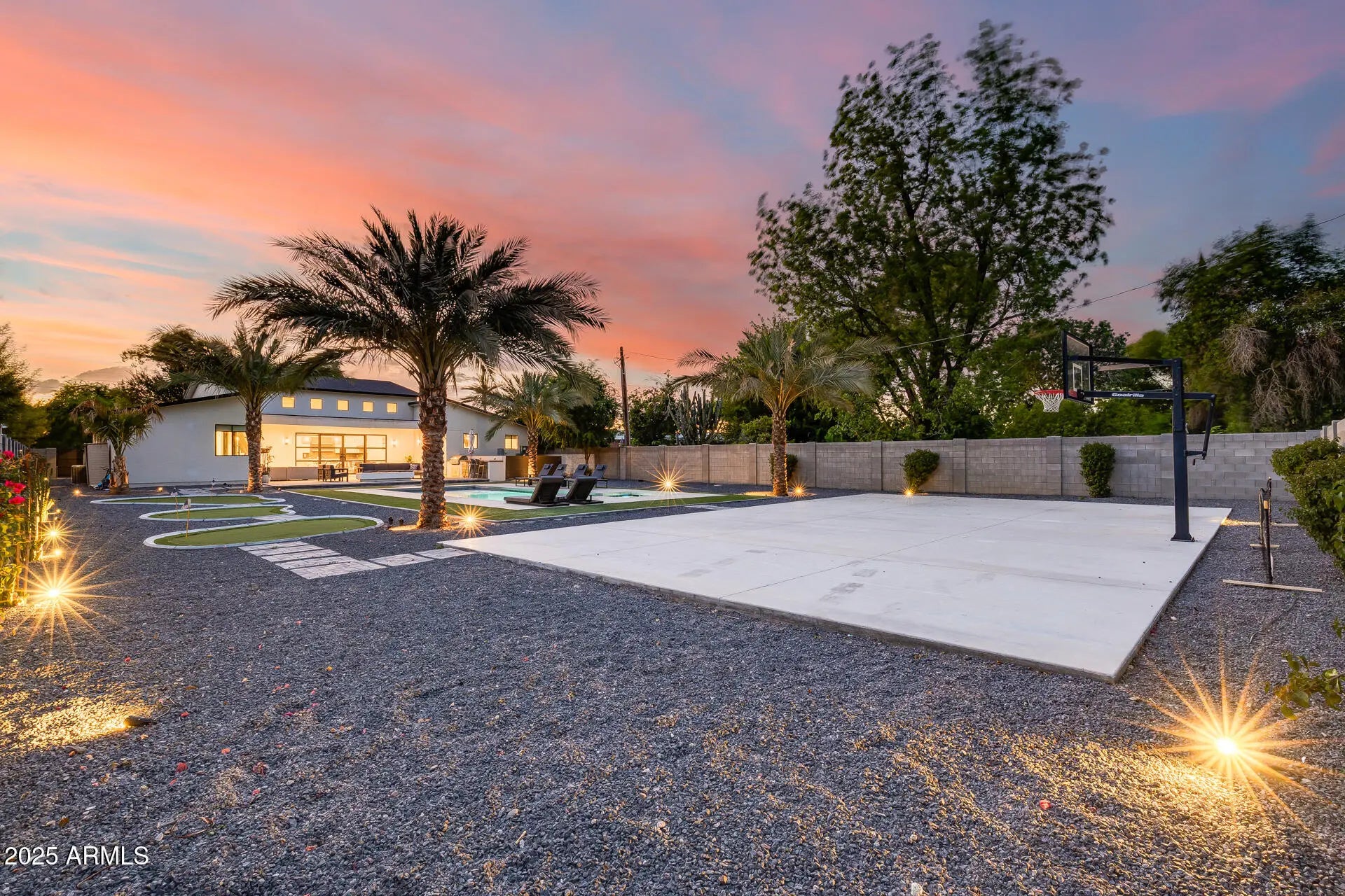 Experience Elevated Living on a Grand Corner Lot. Nestled on an expansive 16,888 sq. ft. corner lot, this exceptional 4-bedroom, 4.5-bath residence showcases 3,095 sq. ft. of refined luxury and contemporary comfort. Step inside to discover a light-filled great room with dramatic vaulted ceilings, statement lighting, wide-plank French oak floors, and a sleek fireplace that sets the tone for modern elegance. The gourmet kitchen is a showpiece, featuring stunning stone countertops, a waterfall island, designer cabinetry with open shelving, and premium stainless steel appliances—perfect for both everyday living and effortless entertaining. Each spacious bedroom offers spa-inspired bathrooms with custom vanities, while one en-suite includes its own private entrance, ideal for guests or extended family. Step outside to your personal retreat: a resort-style backyard complete with a covered paver patio, built-in BBQ and fire pit, sparkling pool and spa, putting greens, and a basketball courtoffering endless opportunities for relaxation and play. Additional highlights include a two-car garage and convenient RV parking, completing this luxurious blend of sophistication and functionality.