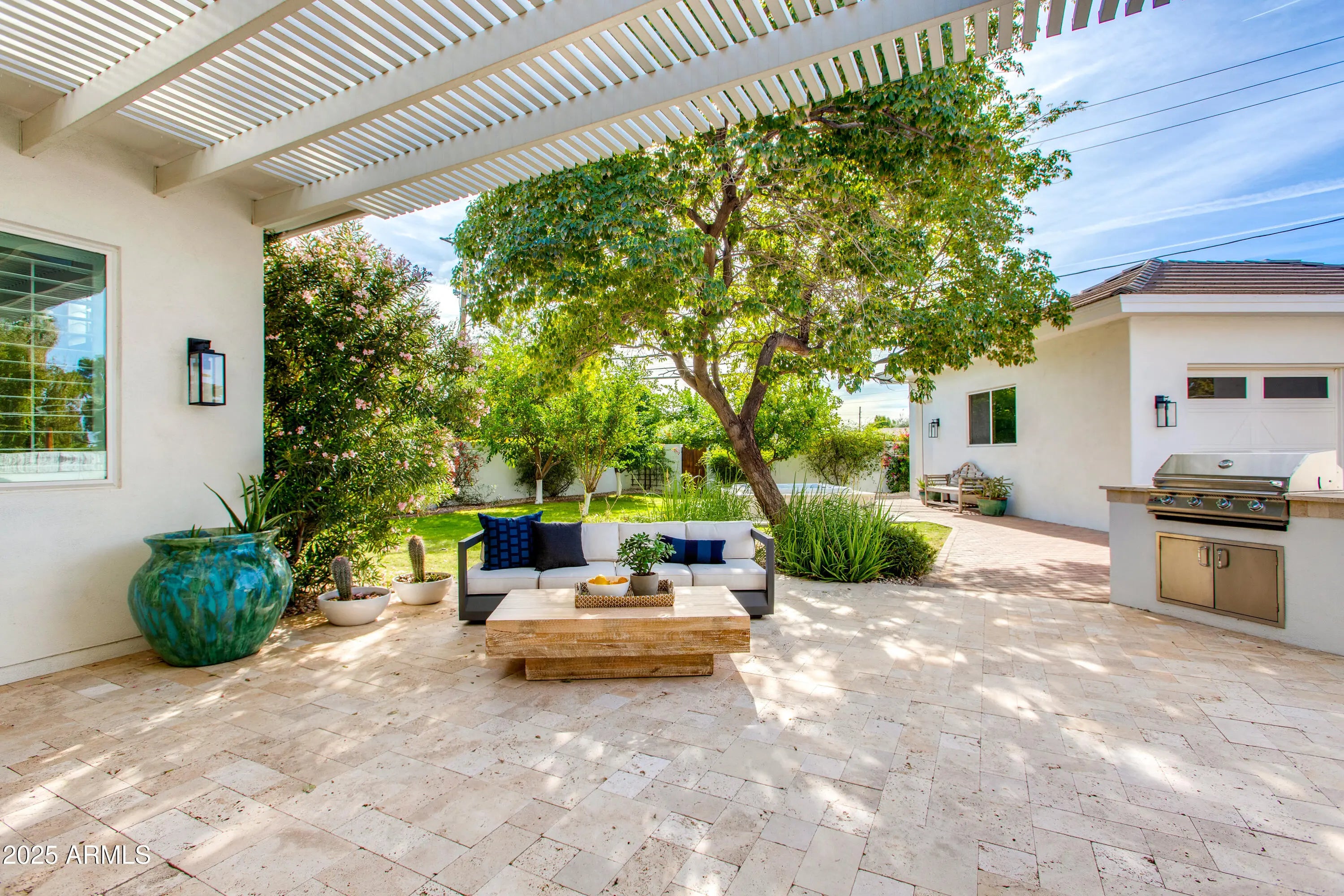 Beautiful custom built 4 bed, 3 bath home in the highly sought-after Arcadia Osborn neighborhood. This 2,625 sqft residence features a split floorplan, formal dining room, and a versatile flex space for a home office or family room. Tile floors flow throughout, while the well-appointed kitchen opens to a living room anchored by a fireplace. Step outside to an expansive covered patio with fireplace, a spa, lush landscaping, and built-in BBQ, perfect for entertaining. Two master suites, each with direct patio access, provide ideal space for guests or in-laws, while additional bedrooms offer flexibility. Complete with a 2 car detached garage, this home blends thoughtful design, modern comfort, and the ideal Arcadia lifestyle, just minutes from top-rated schools, Arcadia hot spots, and more!