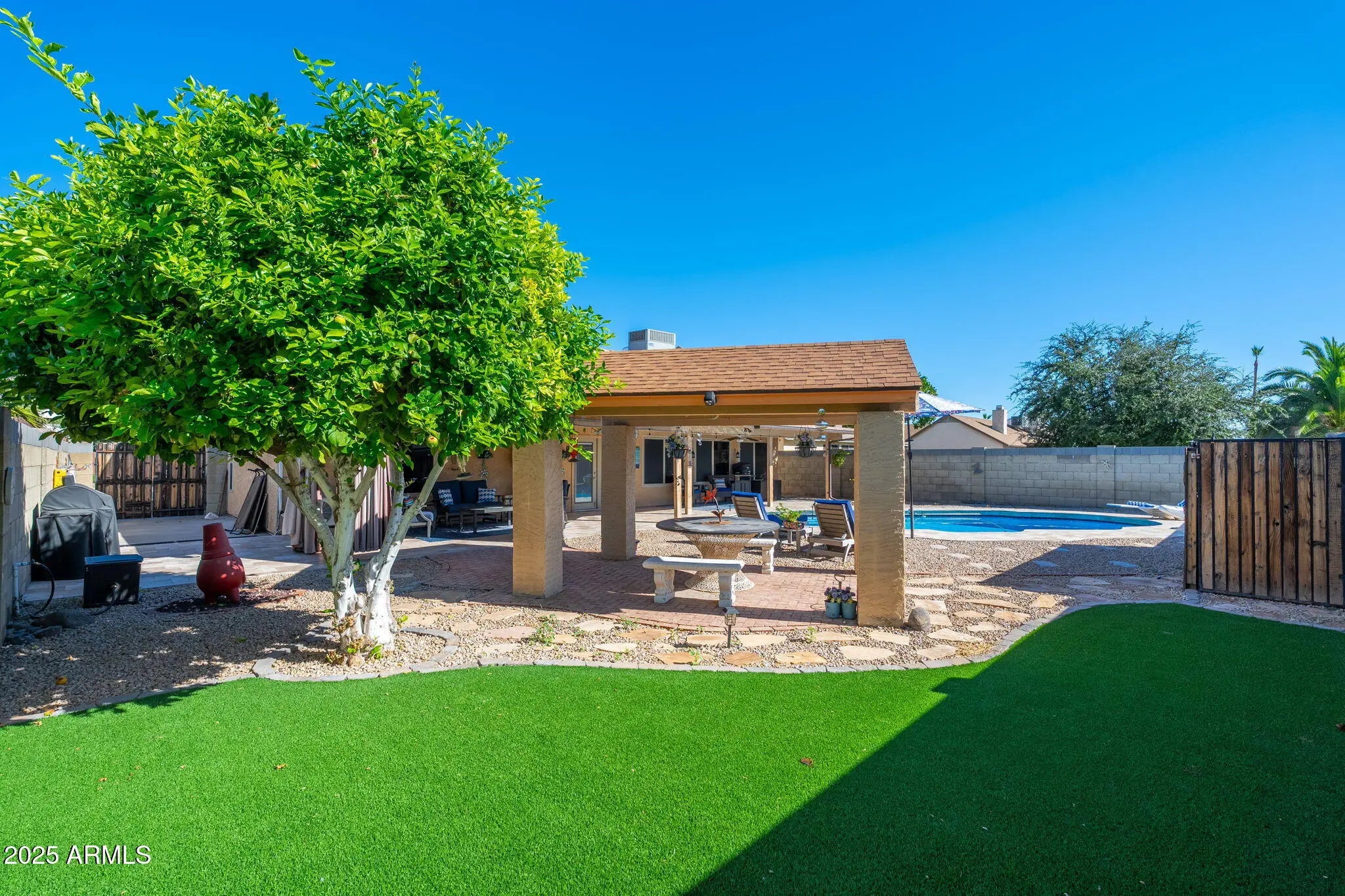 Beautifully updated home featuring spacious living areas with vaulted ceilings, a cozy fireplace, and a desirable split floor plan. The open layout flows into a stunning upgraded kitchen with granite countertops, newer cabinets, abundant storage, island/breakfast bar, wet bar area, and stainless steel appliances. Enjoy over $100K in landscaping upgrades, including a charming new front patio for added curb appeal. The private backyard oasis offers a sparkling pool, covered patio, gazebo, and elegant turf and stone design—perfect for entertaining or relaxing in total privacy. Newer AC, pool pump and hot water heater. Pool was refinished in 2024 along with the landscaping updates.