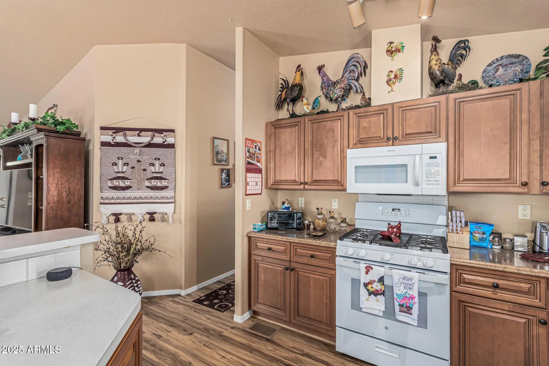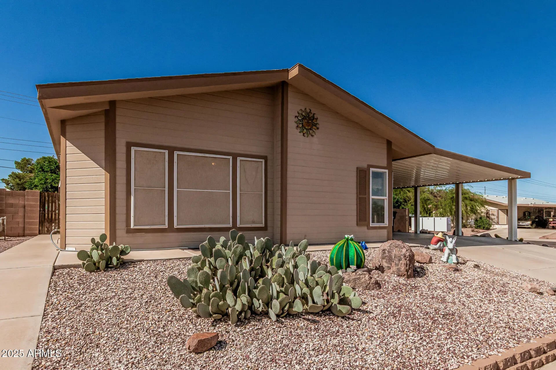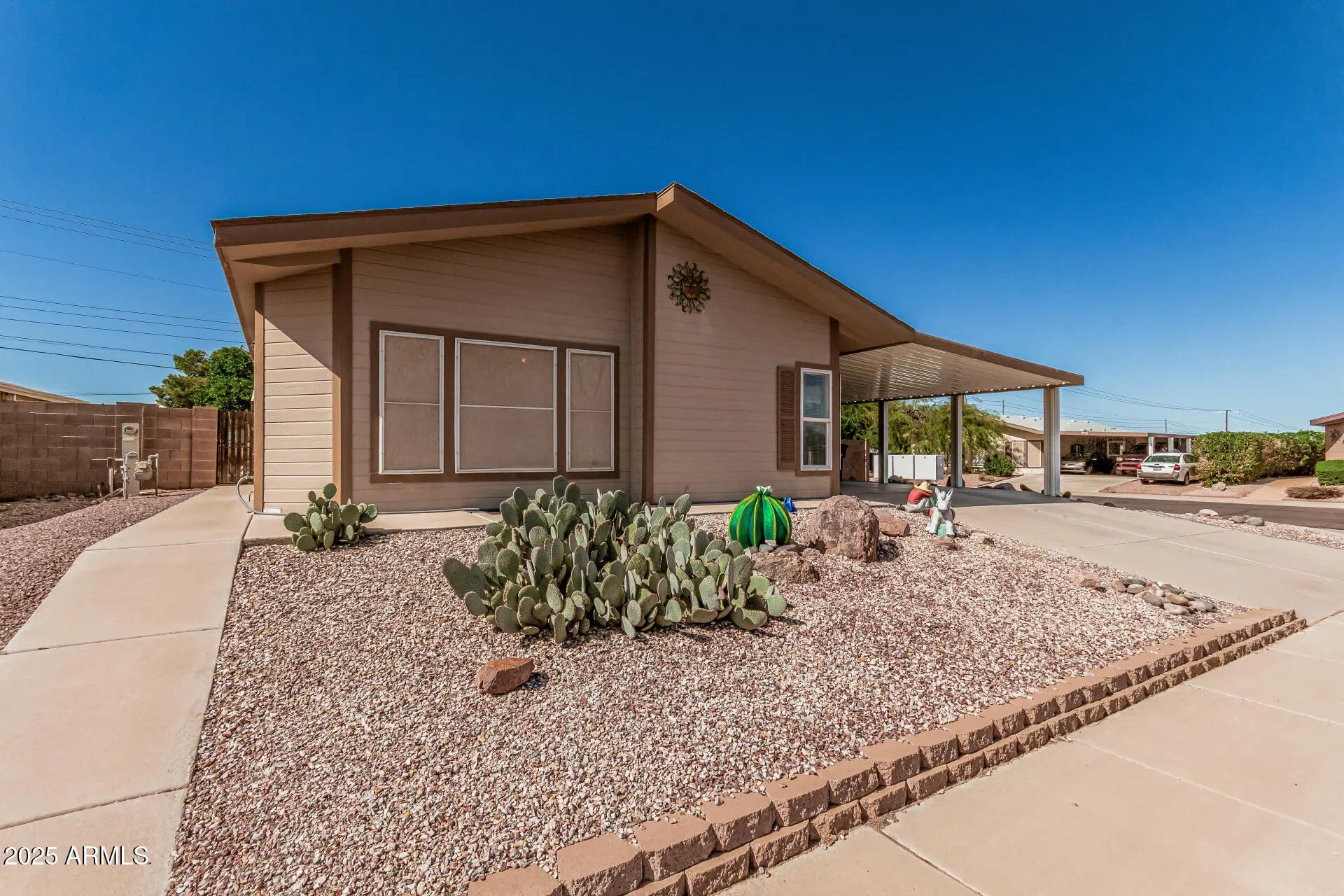 No HOA! RV Parking w/ hook-ups included & new RV gate! Your 2-bedroom, 2-bath home is on a spacious corner lot! 2x6 construction, $78/m solar lease, HVAC annual service, 2025 new roof, 2-car carport with storage shed & low-maintenance desert landscape. Inside, enjoy an open great room filled with natural light, vaulted ceilings, lots of storage & gorgeous floors. The kitchen offers ample cabinetry with soft-close drawers, built-in appliances with a 2025 new gas stove/oven, 2024 new microwave & a 2-tier island with breakfast bar. The primary suite includes a walk-in closet & private bath. Relax year-round in the bright Arizona room perfect as an office or studio. Outside, find two pergolas, a covered patio, & a 2nd larger storage unit. Near Dave White park & golf course.