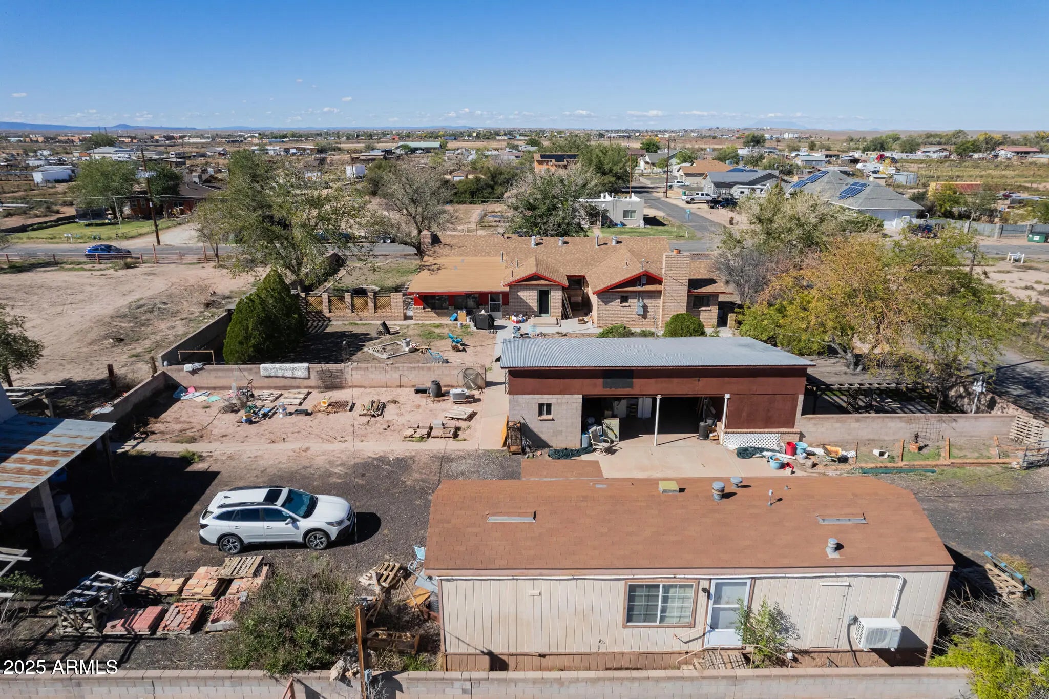 ** Realtors please reference Semi-Private Remarks for more features ** Spacious corner-lot property on county not city limits with Chevelon water rights and no deed restrictions, featuring a charming brick home plus a separate mobile home on own septic for guests or rental income! Main home is fully block fenced and land is fully pipe and wire fenced. Offers 3 beds, 2 baths, kitchen cabinets made from real wood, Renewal Windows by Anderson, new doors with 23 year transferable warranty, 2 fireplaces ( primary bedroom which is 18 by 20 & family room which 22 by 30 ), and covered porch. Includes workshop, custom built detached oversized 2 garage w/ metal roof (2 10 by 10 & 1 25 ft long by 11 ft wide with shelves) built out of block, outbuildings, and ample parking.