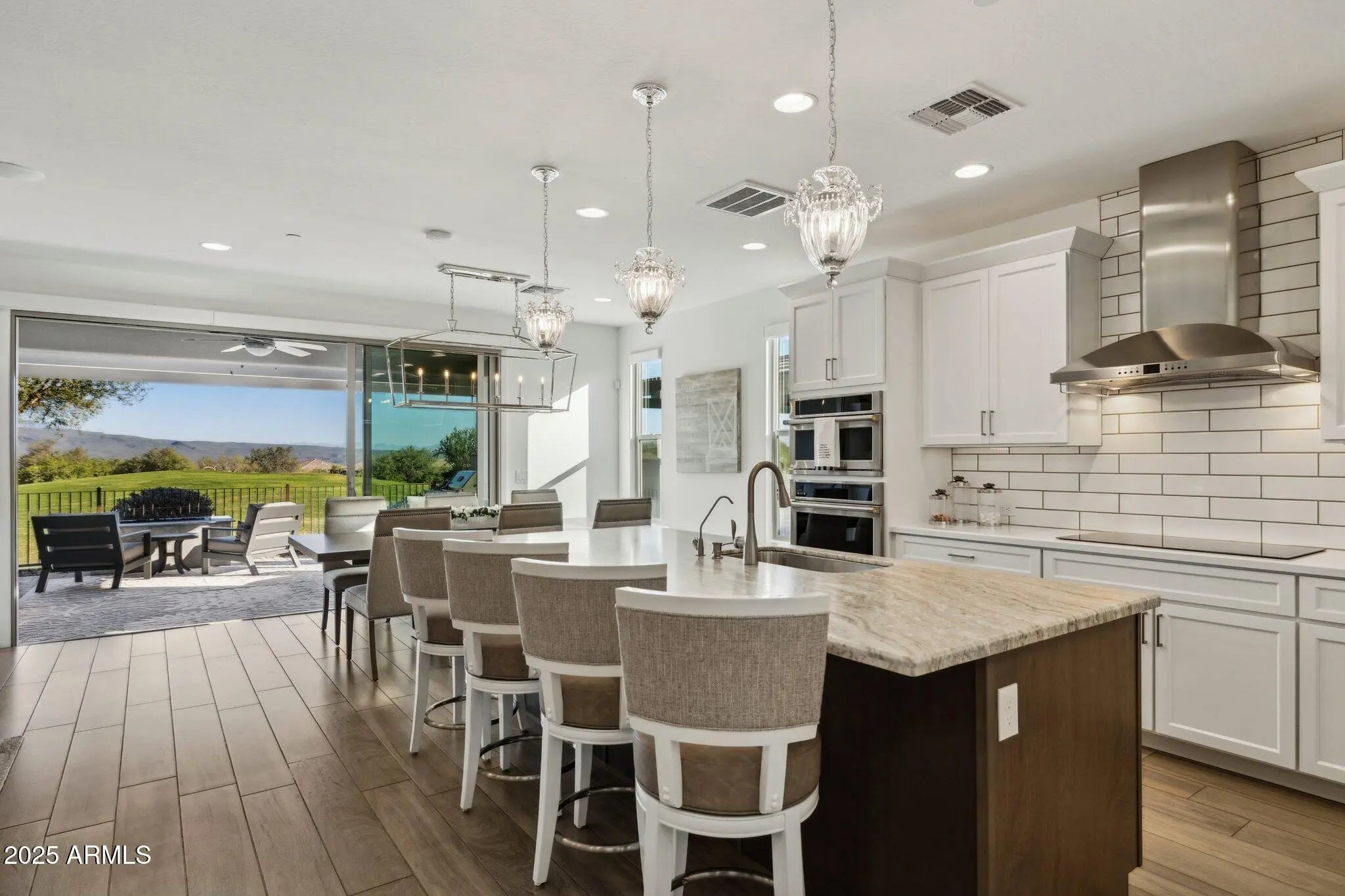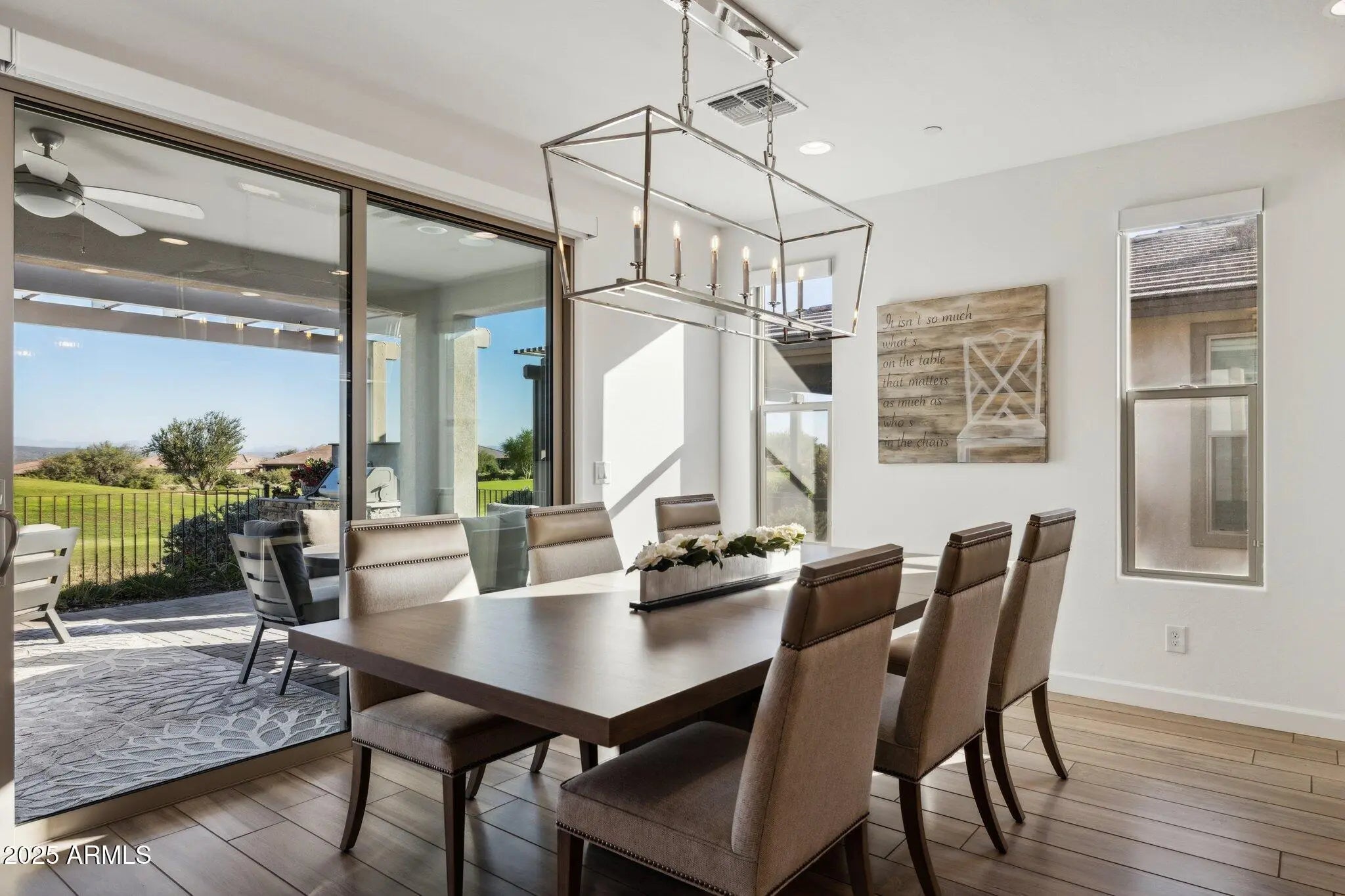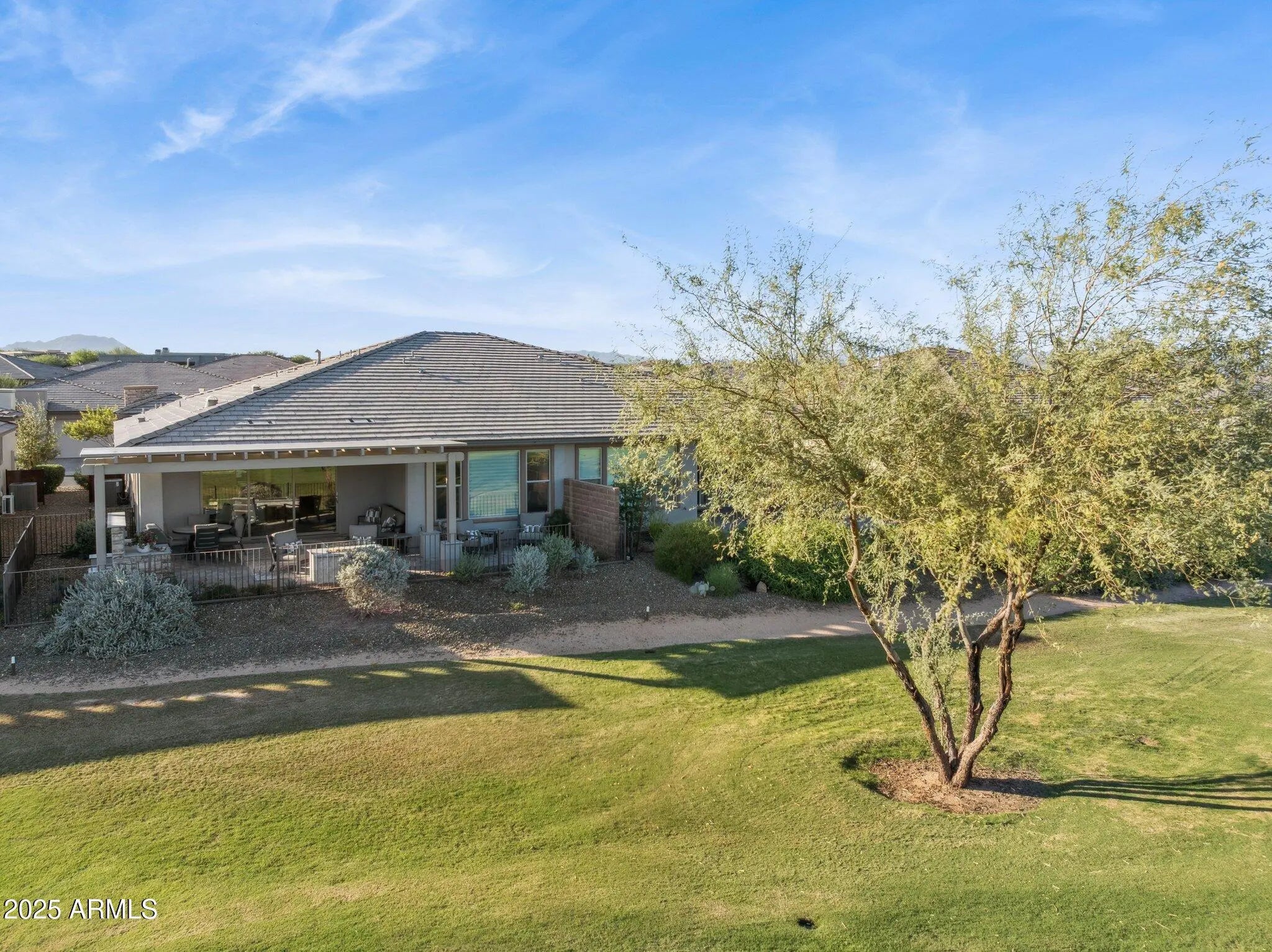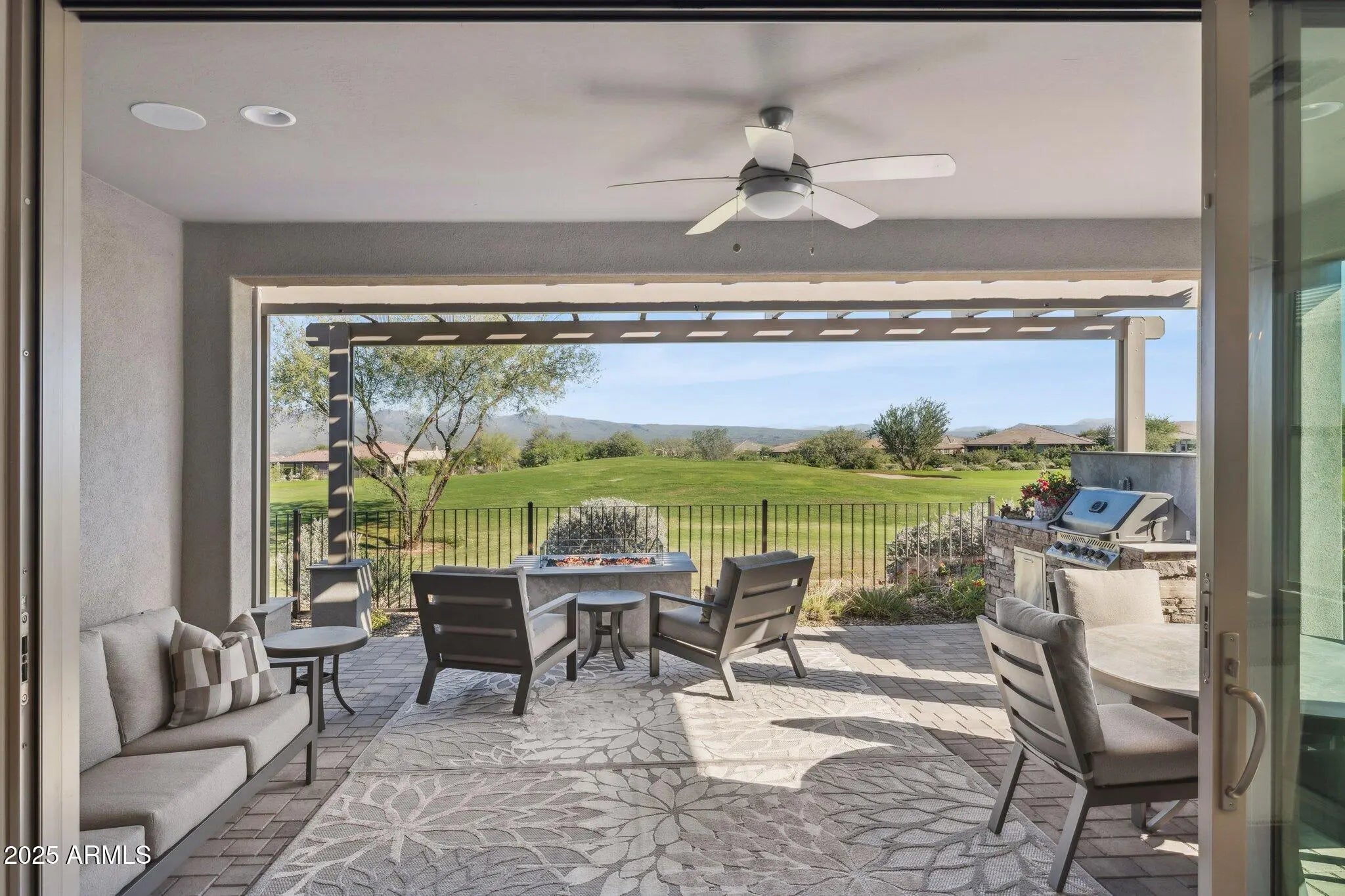 Experience luxury desert living in this stunning home located on a premium golf course lot in Trilogy at Verde River. Boasting 1,679 sq. ft. of thoughtfully designed living space, this home showcases breathtaking Four Peaks and Mazatzal Mountain views from your private backyard oasis. The gourmet kitchen features a designer package with leathered granite countertops, GE Monogram appliances, induction cooktop, and pantry. Enjoy elegant wood-look tile throughout, custom designer lighting and tile accents, and a seamless indoor-outdoor flow with a multi-slide patio door leading to your built-in BBQ, pergola, and fire pit -- perfect for entertaining under Arizona skies. The den/office offers versatility with custom barn doors and Hunter Douglas remote shades, while the primary suite impresses with custom finishes, a mirrored barn door, and spa-like bath. The guest bedroom is ensuite with plantation shutters for added privacy. Additional upgrades include a built-in bar with wine fridge, remote Hunter Douglas Silhouette shades, epoxy-finished garage with built-in cabinets, and sophisticated neutral finishes throughout. Don't miss this exceptional opportunity to own one of Trilogy's finest homes where every detail is elevated by unmatched golf course and mountain views. Trilogy at Verde River is a Resort Style community featuring something for everyone! Golf, tennis, pickle ball, bocce ball, heated lap pool and swimming pool, hot tub, fitness center, demonstration kitchen and a 7.5 acre dog park. The community center has casual and fine dining, luxury spa and events center. Trilogy at Verde River is adjacent to the Tonto National Forest and is situated in the middle of miles and miles of hiking and biking trails. Live like you're on vacation