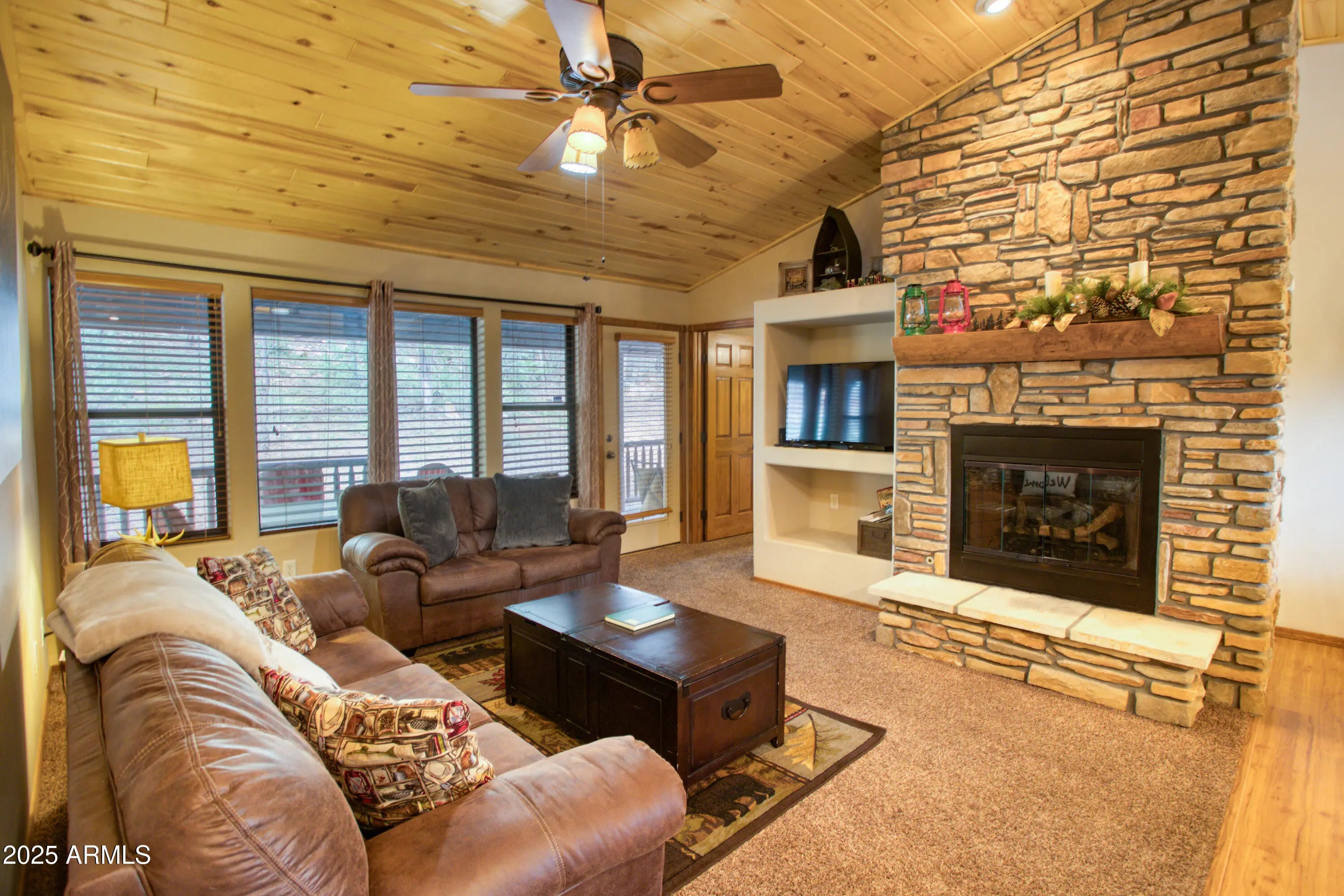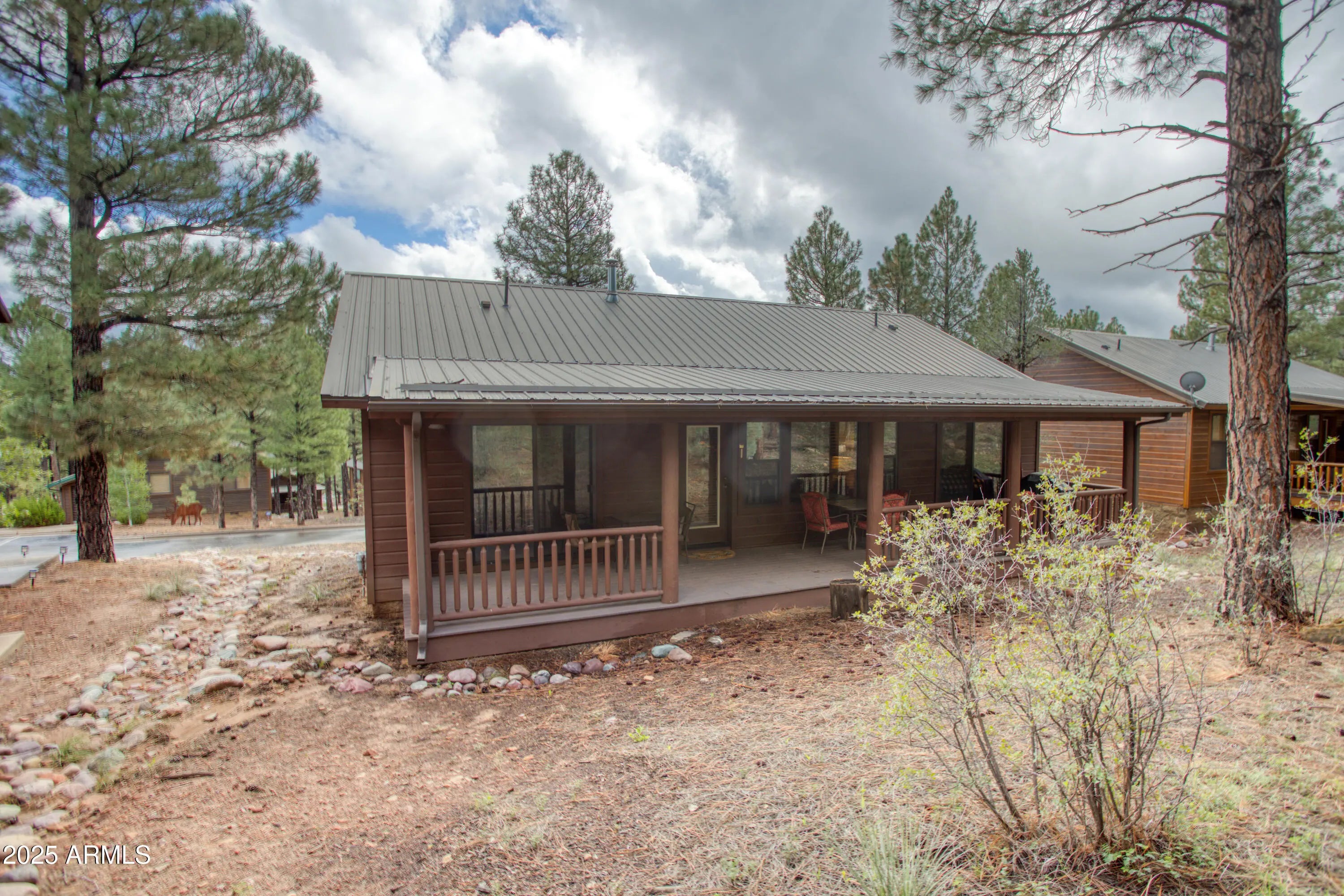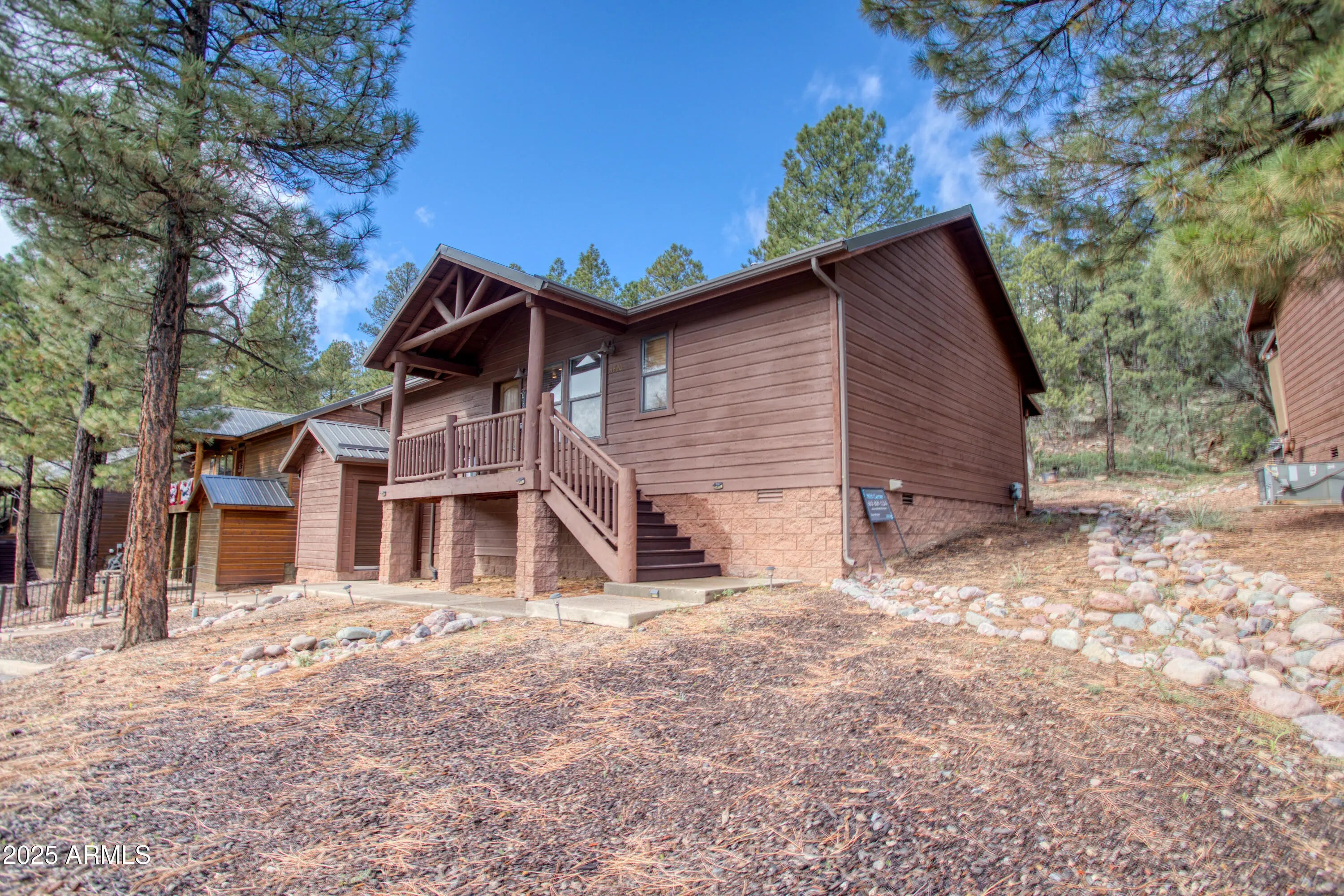 You'll fall in love with this adorable 2-bedroom, 2-bath cabin nestled among the tall pines in the highly desirable Bison Ridge neighborhood. This cozy retreat offers a split floor plan with spacious bedrooms and inviting living spaces perfect for relaxation or entertaining. Step inside to a beautiful great room featuring vaulted T & G ceilings and a stacked-stone gas fireplace that creates a warm and welcoming atmosphere. The primary suite includes double vanities, a private shower/water closet, and direct access to the extended covered back deck, the perfect spot to unwind or enjoy the sights and sounds of nature. The guest bedroom also opens to the deck, offering guests their own private retreat. HOA takes care of the landscaping and snow removal. As an added bonus there is private access to the National forest! Enjoy the serenity of mountain living while being close to everything; golf courses, hiking trails, Show Low Lake, shopping, restaurants, and even Sunrise Ski Resort for winter fun. This home is a fantastic rental, second home, or primary residence. Don't miss this opportunity to own your mountain getaway in one of Show Low's most popular communities!