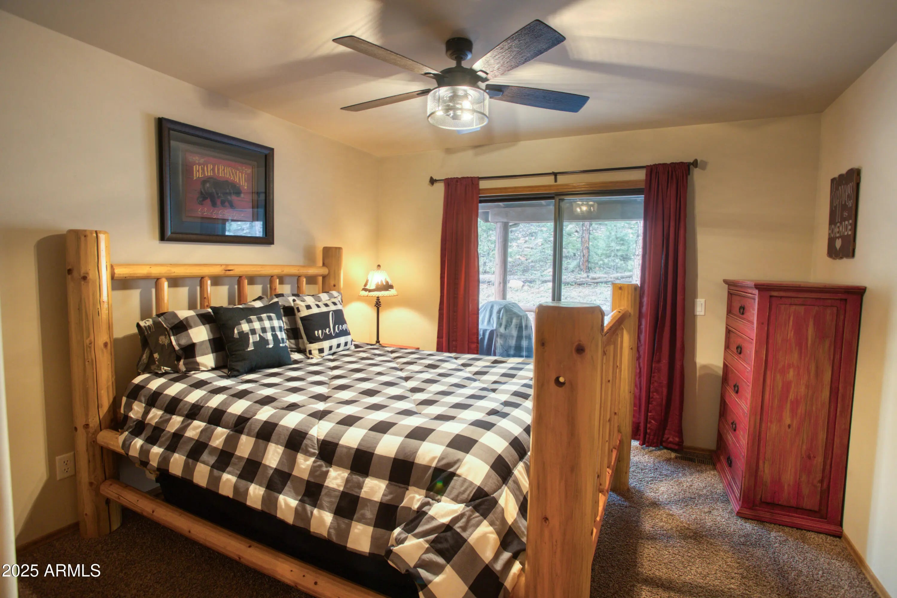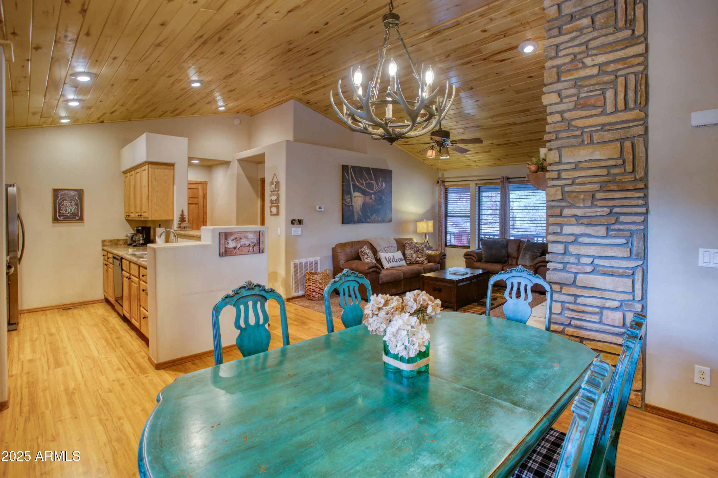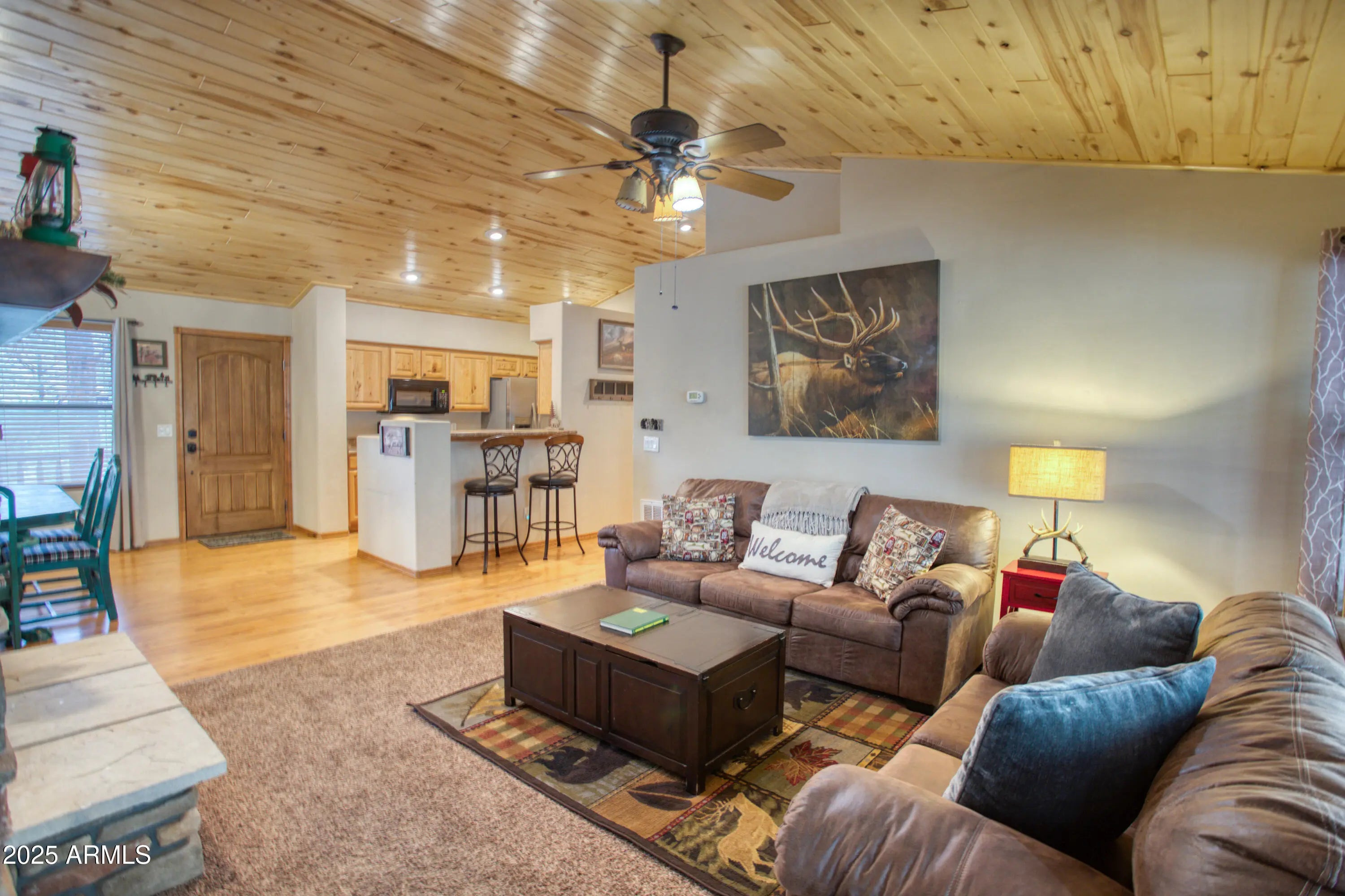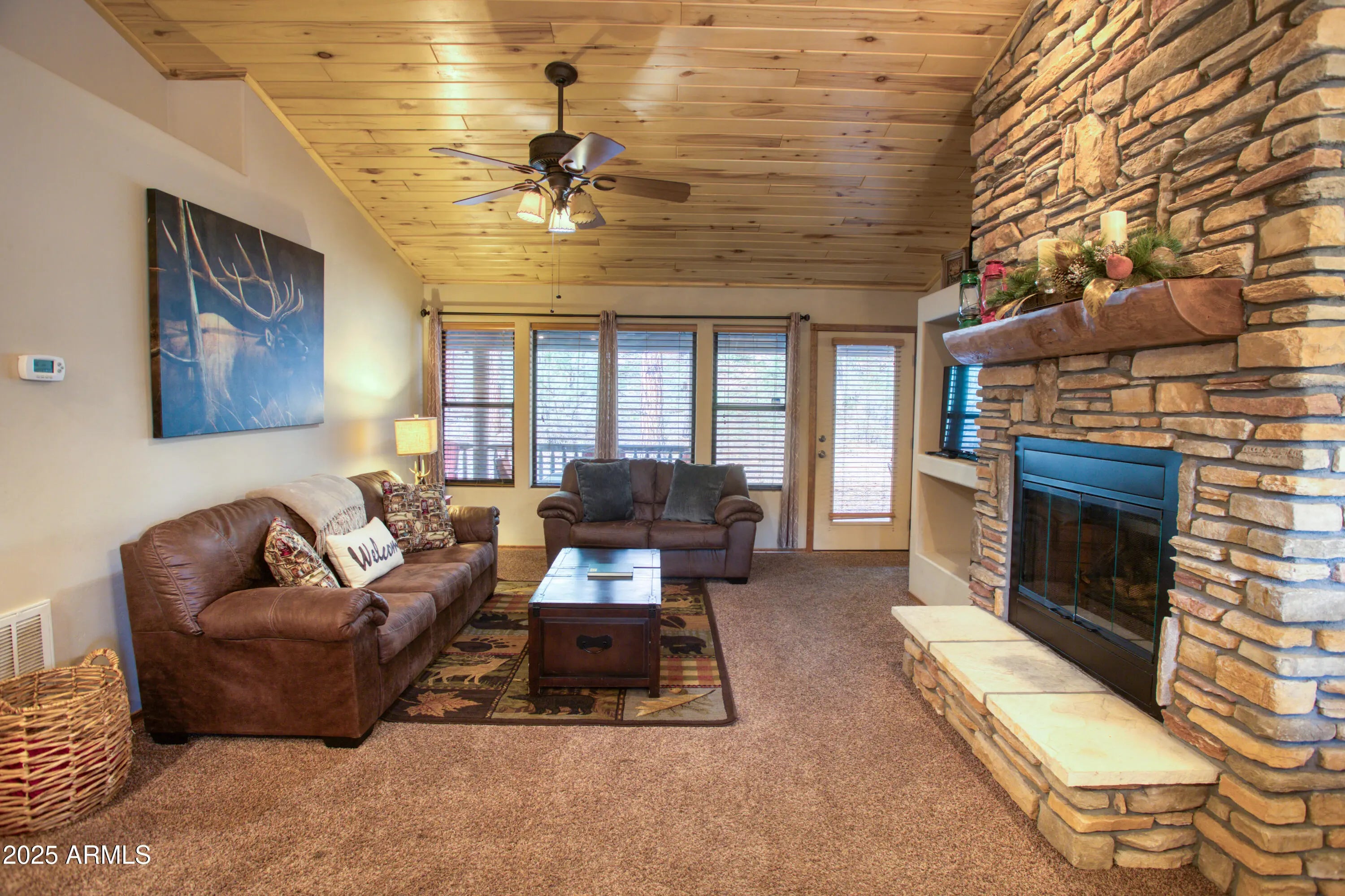 You'll fall in love with this adorable 2-bedroom, 2-bath cabin nestled among the tall pines in the highly desirable Bison Ridge neighborhood. This cozy retreat offers a split floor plan with spacious bedrooms and inviting living spaces perfect for relaxation or entertaining. Step inside to a beautiful great room featuring vaulted T & G ceilings and a stacked-stone gas fireplace that creates a warm and welcoming atmosphere. The primary suite includes double vanities, a private shower/water closet, and direct access to the extended covered back deck, the perfect spot to unwind or enjoy the sights and sounds of nature. The guest bedroom also opens to the deck, offering guests their own private retreat. HOA takes care of the landscaping and snow removal. As an added bonus there is private access to the National forest! Enjoy the serenity of mountain living while being close to everything; golf courses, hiking trails, Show Low Lake, shopping, restaurants, and even Sunrise Ski Resort for winter fun. This home is a fantastic rental, second home, or primary residence. Don't miss this opportunity to own your mountain getaway in one of Show Low's most popular communities!