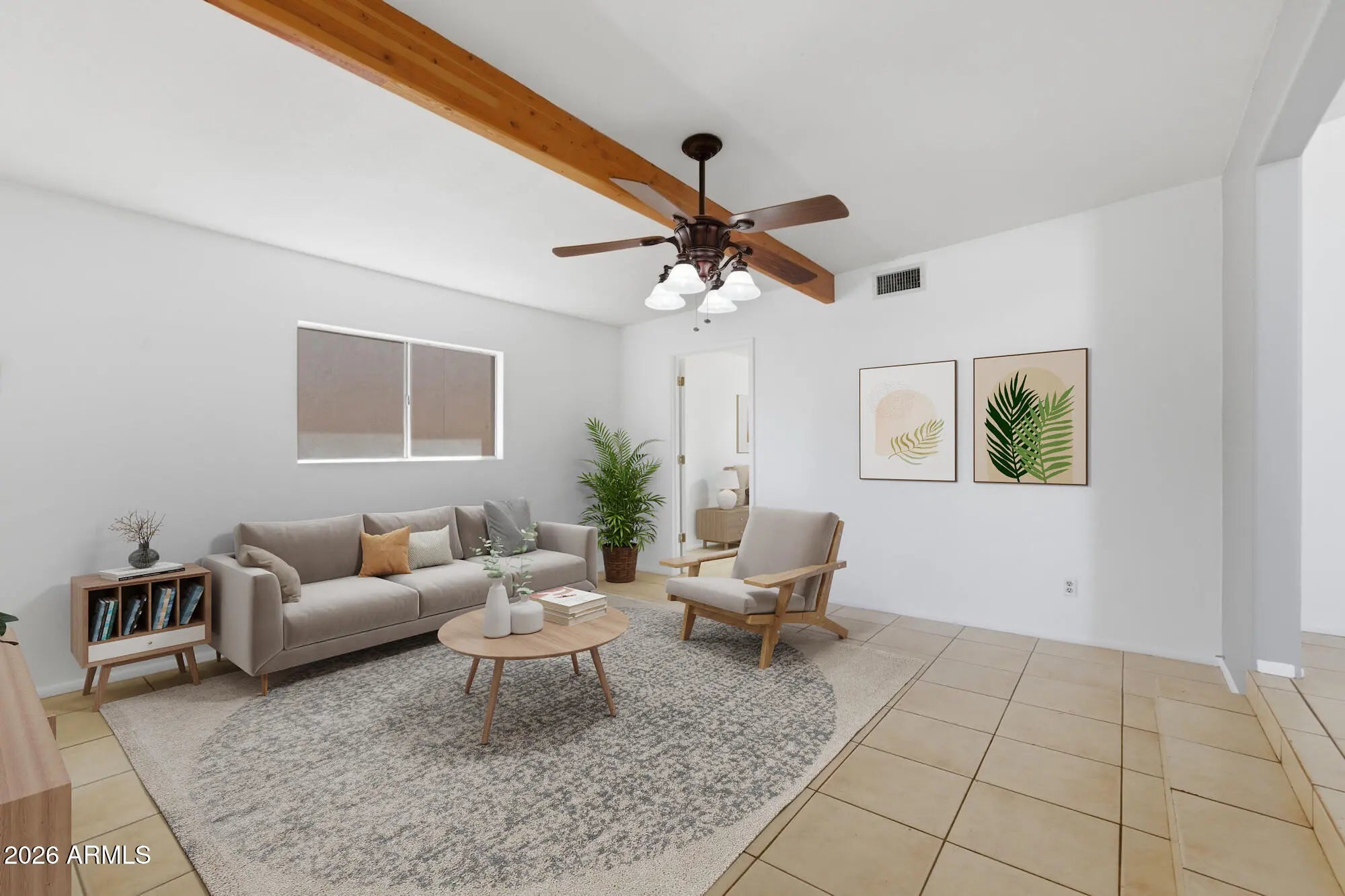 Seller providing $5,000 towards buyers closing costs. Move in ready, and minutes away from the Cardinals Stadium, Westgate and downtown. Mid-Century style opportunity in Villa De Paz community. This 3-bedroom, 2 bath home features ceramic tile throughout the entire floor plan. Upon entry, a formal living leads to a family room with soaring vaulted ceilings and natural light. Open kitchen concept with wood cabinets, neutral counter tops and dining area replete with breakfast bar. This home has many large improvements, New Roof, New AC, New Paint throughout, New Counter tops, and more, with room for improvements and equity building. Villa de Paz is a once-thriving golf course community, now ready for redevelopment! Great opportunity and priced to sell
