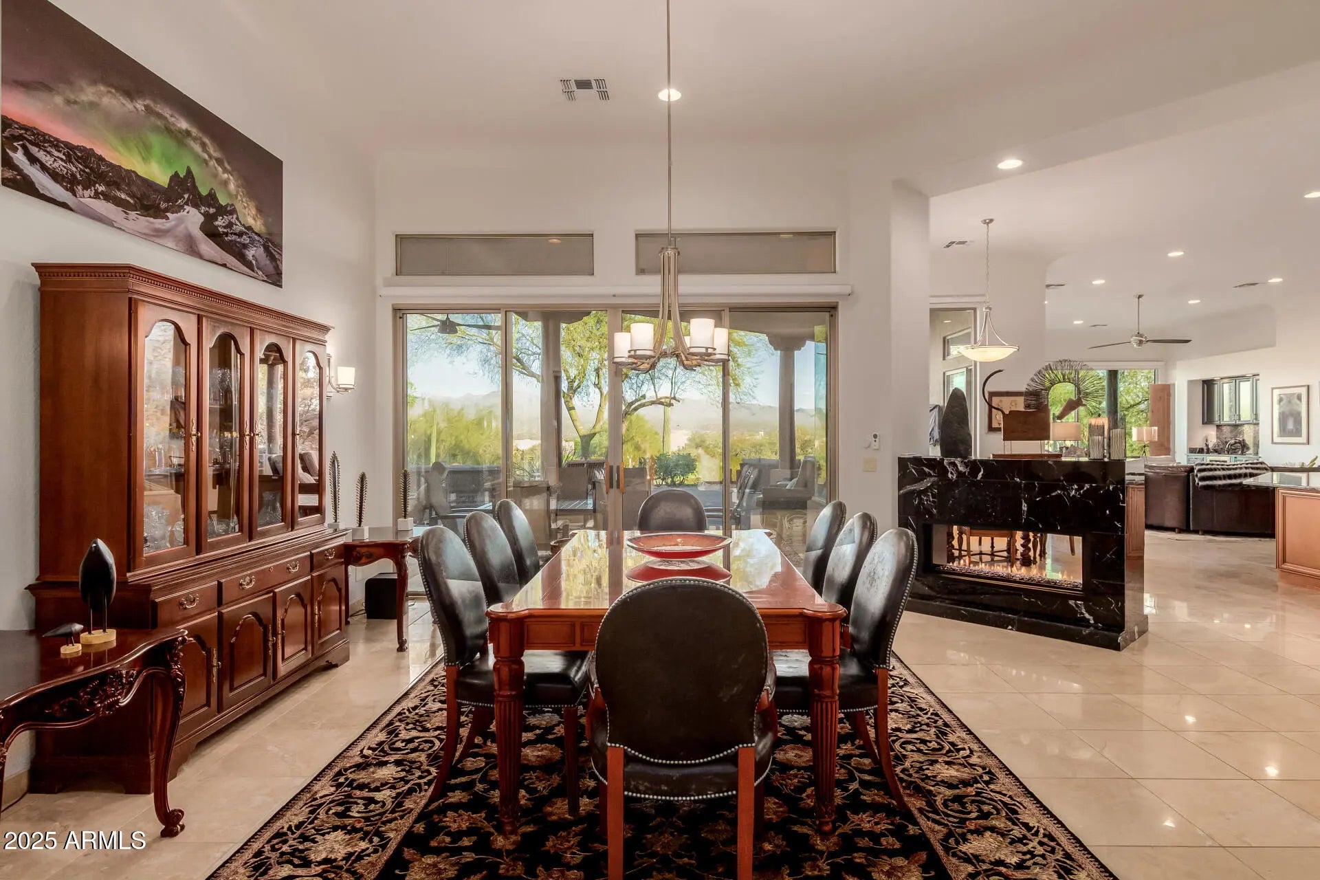 Looking for the million dollar view in Tonto Verde? This almost 4200 square foot home, located on the 4th green of the Ranch Course, features spectacular mountain and golf course views from almost every room in the house. Showcasing great curb appeal, manicured desert landscaping, climate controlled 3-car garage with storage cabinets & storage room. The welcoming front porch is protected by an automatic sunscreen. As you enter the front foyer, you can see the McDowell Mountains, the desert, and the 4th green. Inside you will find an open floor plan that has a spacious formal dining room with a see-through gas fireplace between the dining room and the breakfast nook with butted glass for unobstructed mountain & golf course views. The kitchen/great room features dramatic granite counters, custom tile backsplash, KitchenAid black stainless steel appliances, coffee counter, quiet close cabinets with hardware, huge island, convection cooktop, Travertine floors & baseboards, 12 ft.high cove ceilings, recessed lighting, trending palette. The kitchen is open to the great room with its wall of glass to the East end, to take advantage of those mountain views. The great room also features an elegant wet bar, with wine cooler, and access to the huge covered patio. In addition, there are His and Her offices, with double french doors & custom cabinetry. . Primary suite showcases stylish wood floors, remote controlled Hunter Douglas shades, access to to the hot tub just steps away, walk in closet, and a lavish ensuite bath w/dual sinks, dramatic granite counters, heated floors tile, heater in the ceiling, soaking tub, huge walk in shower with very stylish tile, and water closet with Toto washlet toilet & bidet. Two ensuite guest rooms with newer quartz counters, stylish tile showers & Toto washlet toilets. The third ensuite has a walkin closet and a private exterior door, so it is an attached Casita. The house is sited on the property so that the views from the Primary Bedroom, dining room, breakfast nook, kitchen and the greatroom are spectacular. Lastly, the wonderful backyard includes a huge covered patio and extended seating area overlooking the Community's lush golf course! In wall pest control for carefree living and solid wood doors. What are you waiting for? 3 charming flagstone patios overlook the Bocce court with golf and mountain views. Act now!