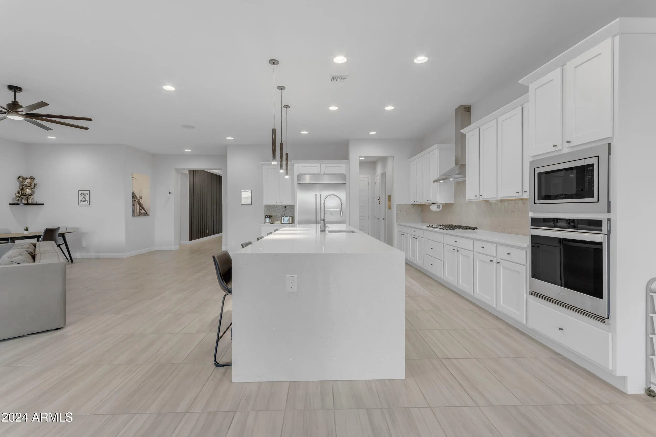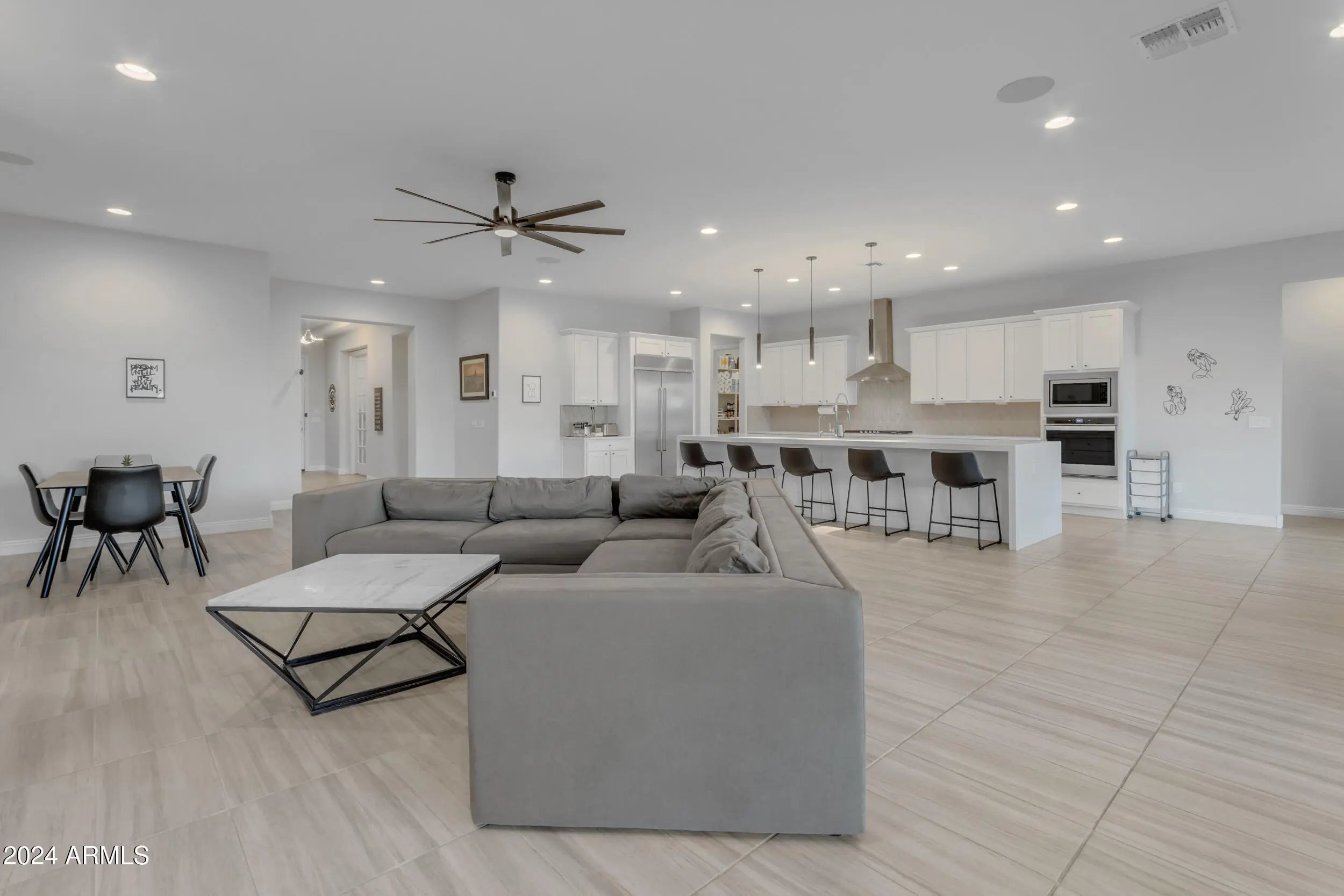 Remarkable 5-bedroom, 5.5-bathroom estate, featuring private entrance casita w/custom kitchenette! Nestled in the prestigious gated community of Harvest in Queen Creek. With exquisite design and top-tier resort style amenities, this home offers an unparalleled living experience. **Elegant Interiors and High-End Upgrades** From the moment you step through the door, you'll be captivated by the attention to detail and breathtaking design. The main living areas are adorned with 1x2 ft tile flooring, seamlessly integrated with upgraded carpeting in all bedrooms for added comfort. The expansive living space is accentuated by a large double slider wall and a sliding glass door in the dining room, creating a harmonious indoor-outdoor flow.