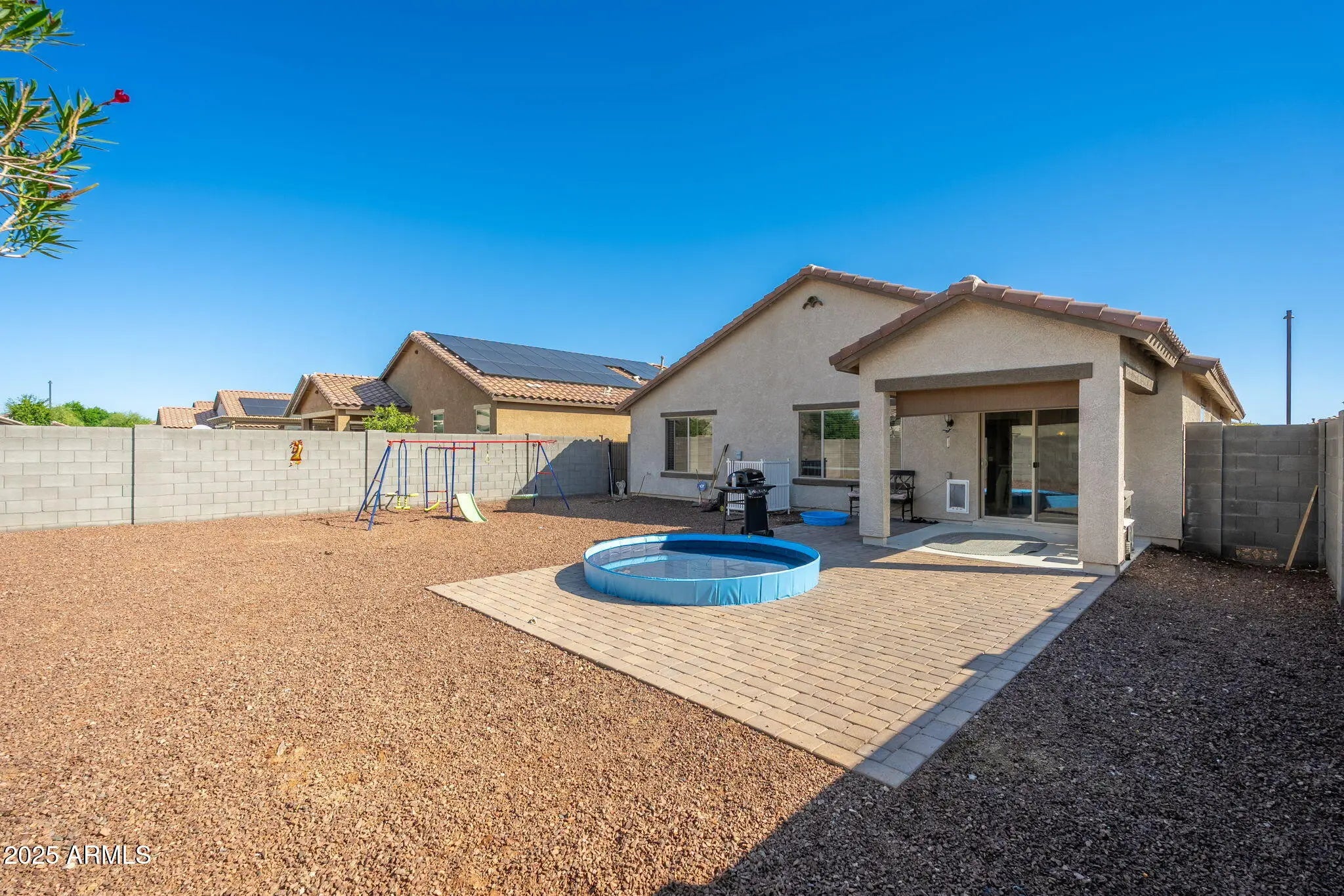 Discover this beautiful Desert Oasis home on a quiet interior street! The inviting floor plan features light wide-plank tile throughout the main living areas. The open concept kitchen boasts white quartz countertops, stainless steel appliances, and overlooks the great room with backyard views. Enjoy stunning sunsets from the extended paver patio. The split bedrooms offer privacy, with plush carpet and a spacious primary suite featuring a walk-in shower and closet. Low-maintenance landscaping front and back plus an epoxy-coated garage floor. Community amenities include a huge resort-style pool, splash pad, basketball courts, BBQ areas, covered gazebos, and multiple lush grassy parks!