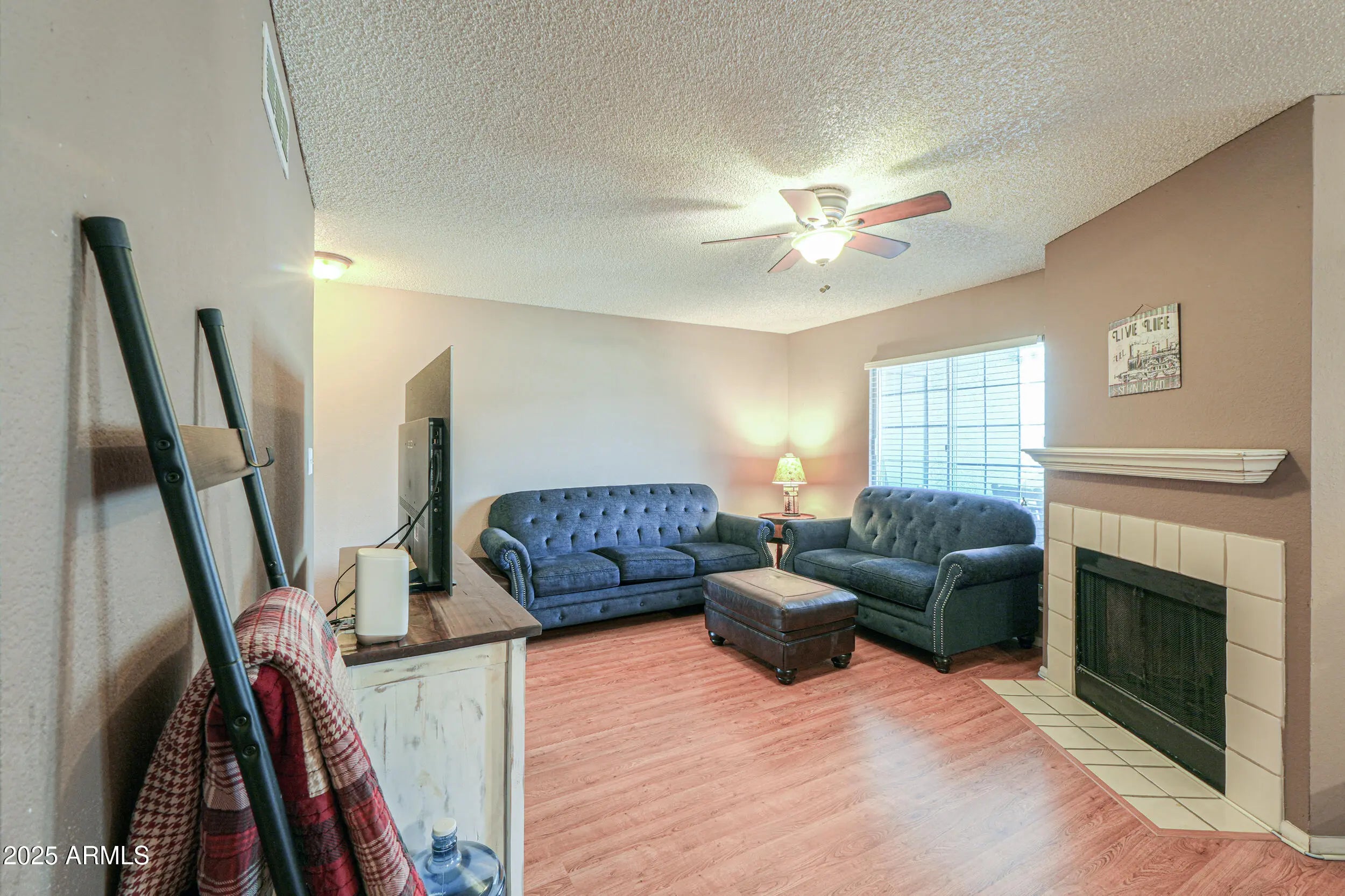 Welcome home to a charming 2-bed/2-bath condominium nestled in desirable Crestview Chateaux community in Chandler. Ground-level unit offers thoughtfully laid-out living space and a terrific location with resort-style amenities just steps away. Inside is a light-filled interior featuring laminate wood flooring, tasteful accent paint, and an inviting real fireplace that adds warmth and character. Open concept layout connects the living and dining areas to the eat-in kitchen with convenient breakfast bar and pantry storage. Both bedrooms are well sized, with the primary suite with bathroom and walk-in closet. Outside is a covered patio for relaxing or entertaining, and about 20 steps leads you to the community pool. Complex features assigned parking, mature landscaping plus more!