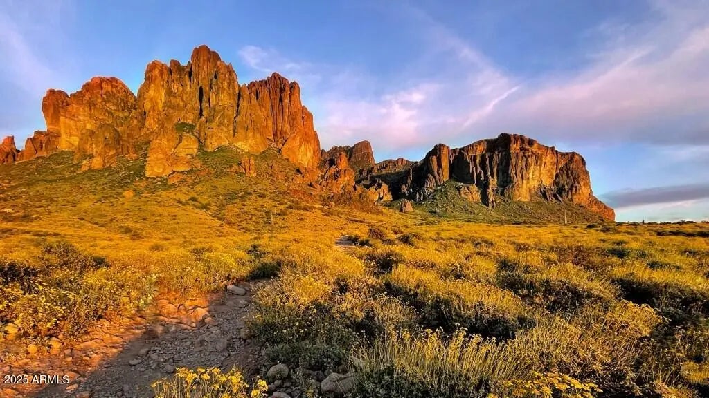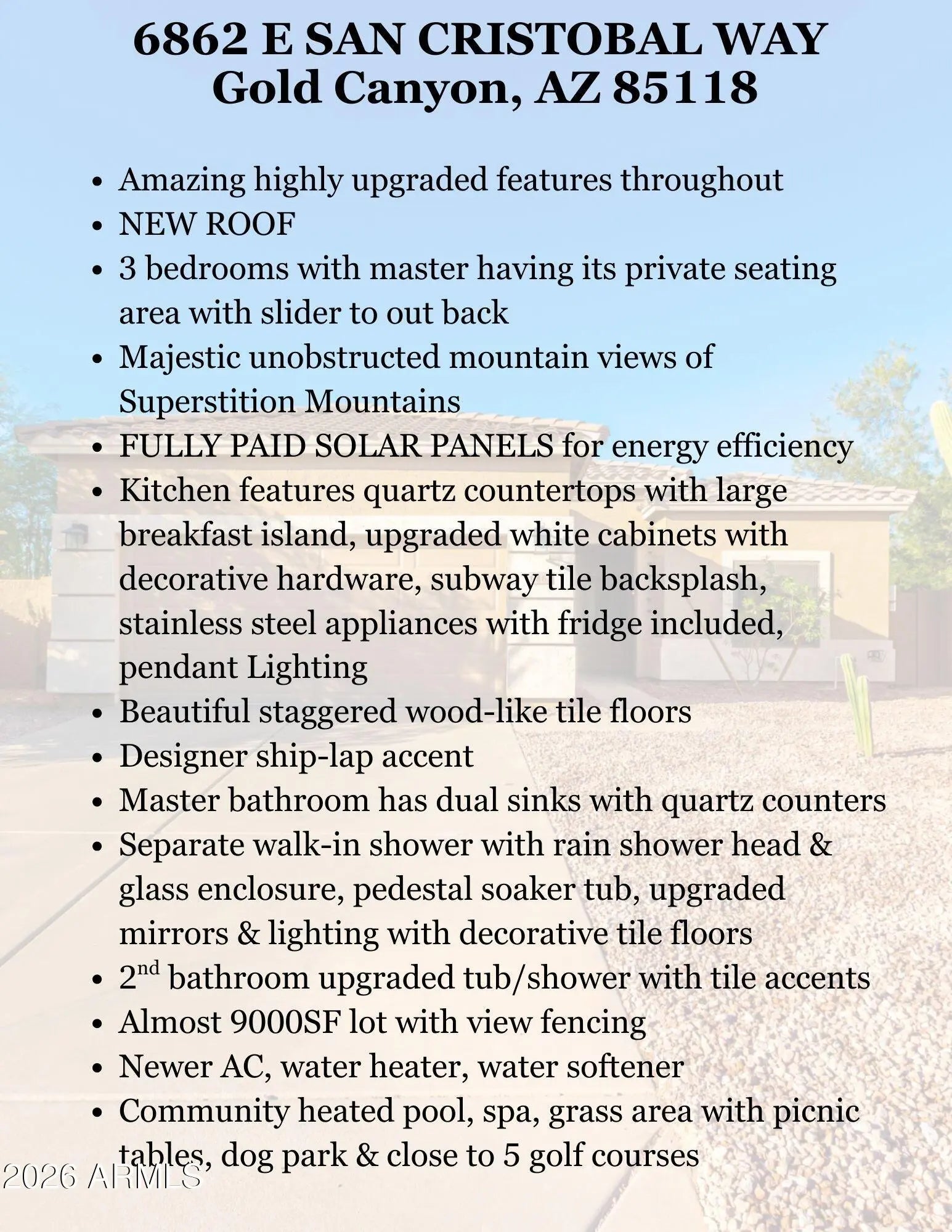 Welcome to your dream home in the heart of the Superstition Foothills with incredible mountain views! This stunning FULLY UPGRADED 3 bedrooms, 2 bath, sits on an expansive 8,385 SF lot with absolutely jaw-dropping views of the Superstition Mountains, NEW ROOF & FULLY PAID SOLAR PANELS for serious energy savings. Amazing highly upgraded chefs kitchen has beautiful quartz countertops, white shaker cabinets, stainless steel appliances, designer touches, pendant lighting, large walk-in pantry & oversized kitchen island with plenty of seating. Open concept layout with 10' ceilings, spacious family & dining area with windows overlooking your mountain views. The primary suite is a true sanctuary with its own seating area and private slider to your backyard oasis. The bathroom is truly your own private spa with dual sinks & quartz counters, large walk-in shower with glass enclosure, & a large pedestal tub to feel like a luxury retreat. Out back, enjoy the majestic, unobstructed views of the Superstition Mountains, with view fencing for the perfect setting for quiet mornings or sunset gatherings. Fully landscaped with large paver patio & grassy area. Some upgrades include a newer A/C unit & water heater, whole-home water softener, upgraded lighting, ceiling fans & window coverings, Truly move-in ready. Located in a sought-after neighborhood with no rental restrictions, this home is ideal for primary residence or investment. Enjoy a wealth of amenities including a heated community pool, hot tub, dog park, & 52 breathtaking walking trails woven throughout the foothills. Close to golf, easy access to freeways, shopping, & endless outdoor recreation, this home is your gateway to the Arizona lifestyle. Don't miss the opportunity to own this rare gem with million-dollar views!