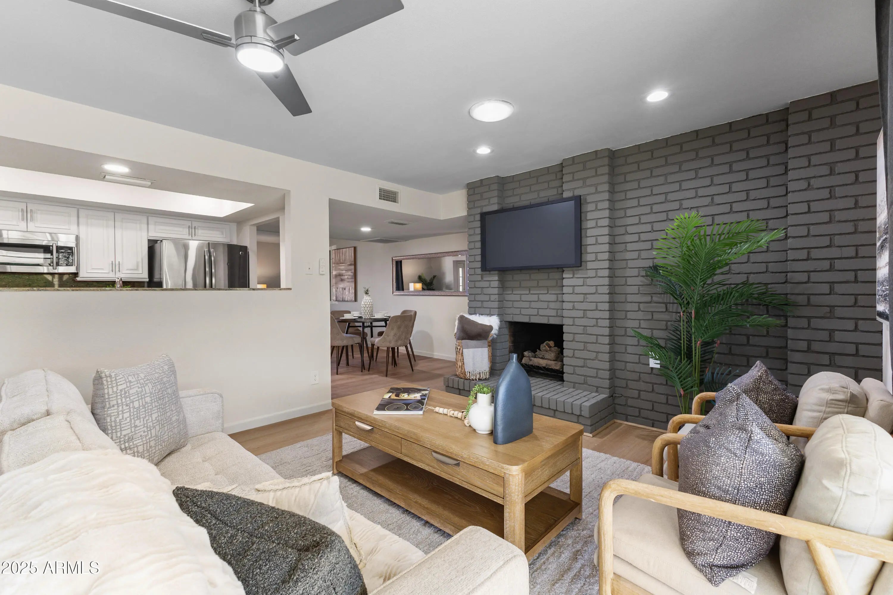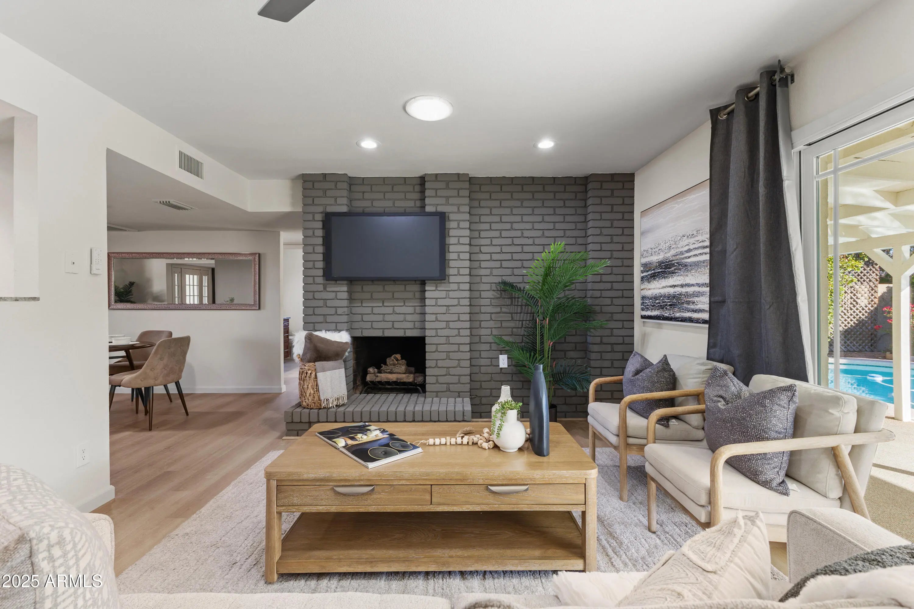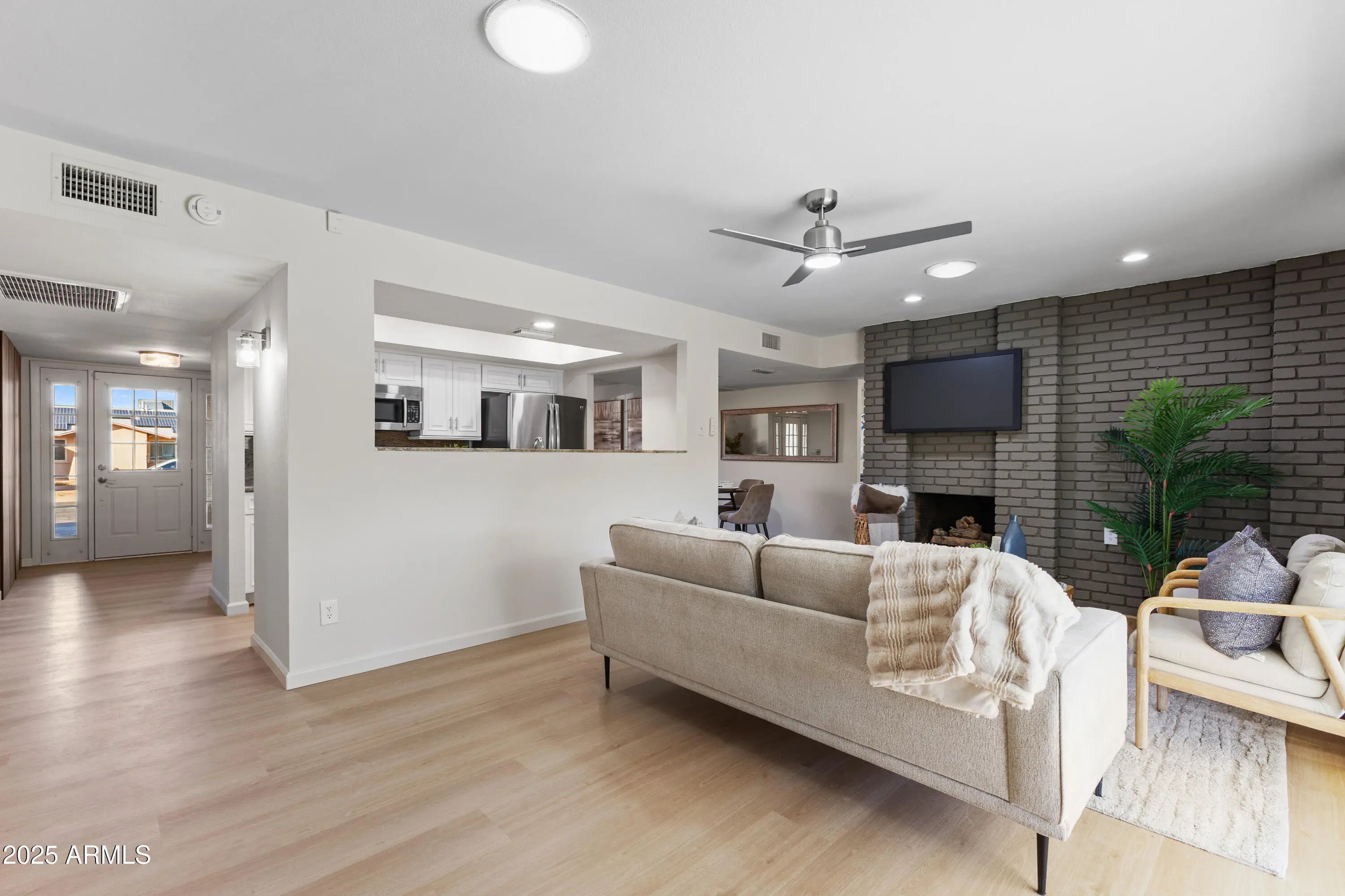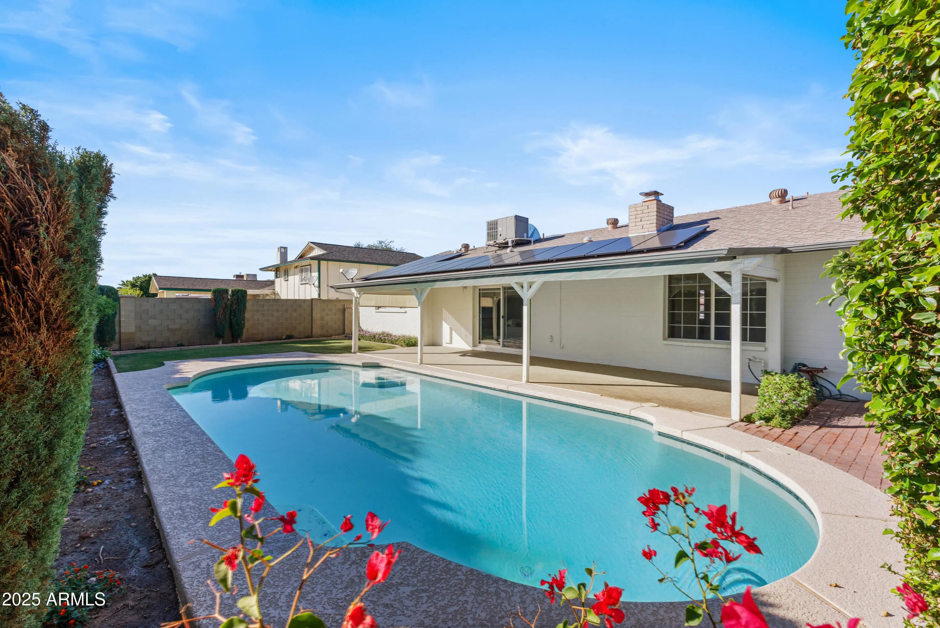 Every now and then a home comes along that truly stands out—and this is one of them. Nestled on a north-facing lot in a peaceful, non-HOA neighborhood, this beautifully refreshed home feels brand new! Enjoy new interior and exterior paint, updated flooring, trim, lighting, and fans plus designer touches throughout. The kitchen and baths feature granite counters and tiled surrounds. 3 bedrooms plus an oversized bonus room—perfect for an office, hobby space, or extra storage. No stairs or steps. Charming gray brick fireplace adds warmth and character. The backyard feels like an English tea garden—lush, private, and serene. Solar panels included for energy efficiency.