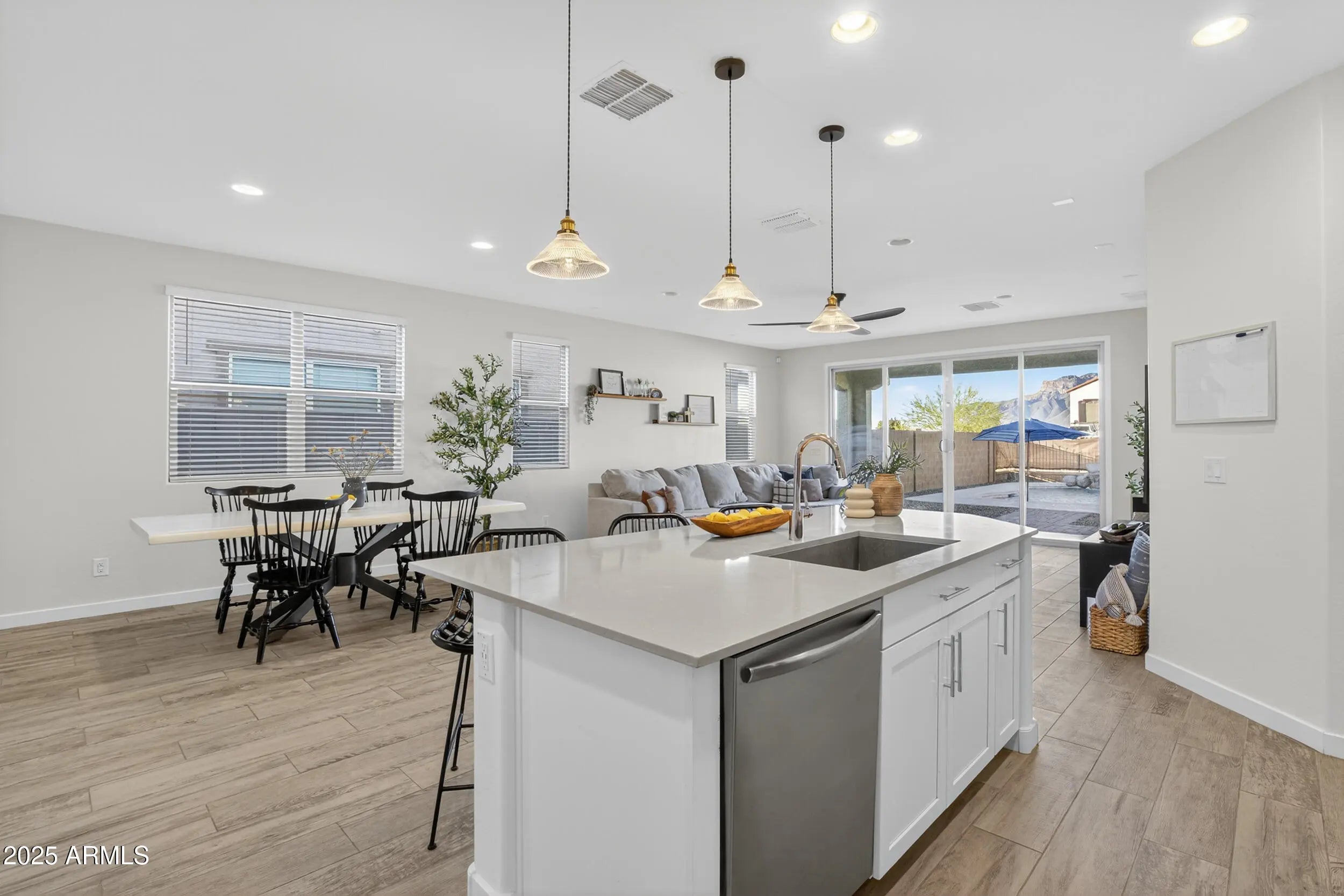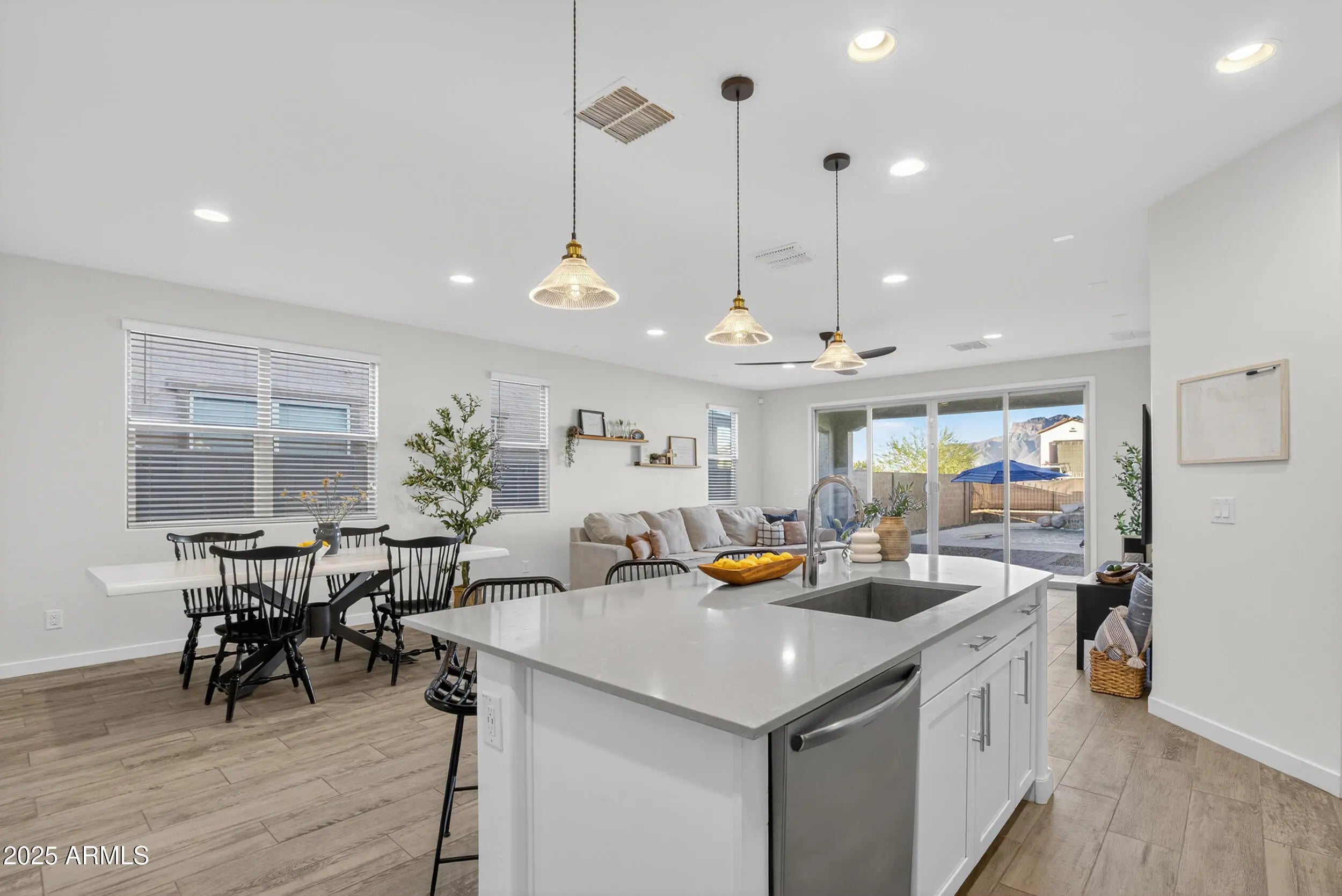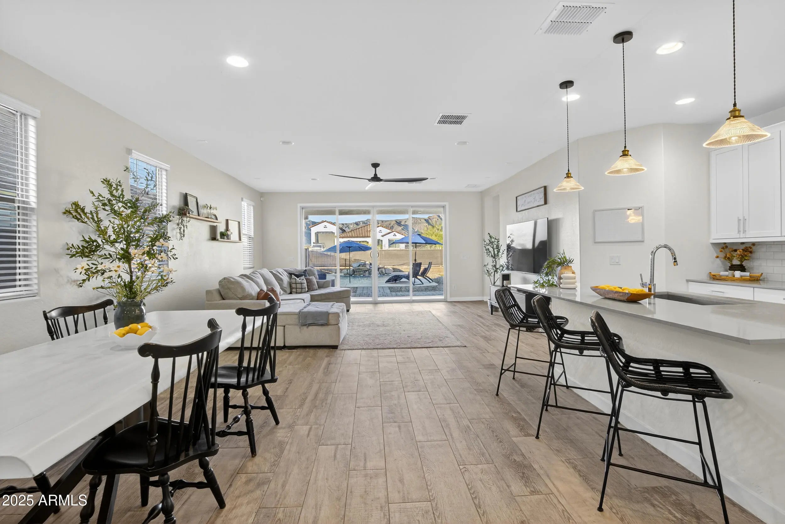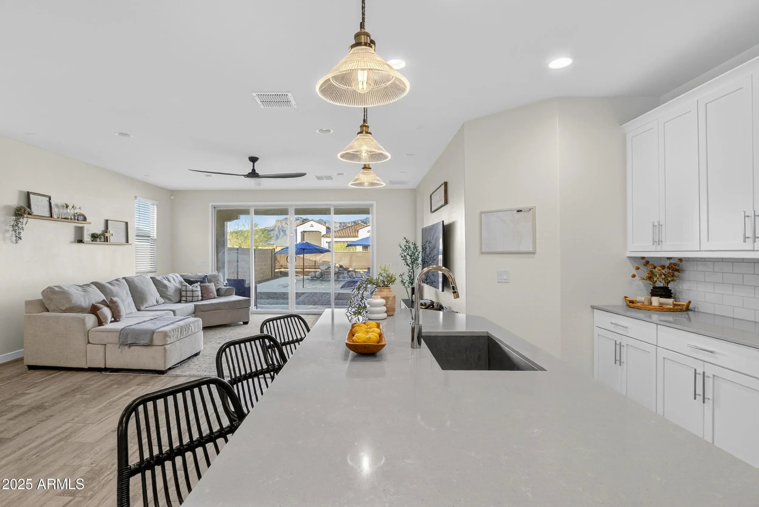 This stunning 4-bedroom, 2-bathroom home offers luxury upgrades and smart home technology in a breathtaking desert community. Enjoy 8''x34'' tile flooring, 8' raised panel doors, chrome hardware, and energy-efficient features throughout. The stylish kitchen boasts quartz countertops, subway tile backsplash, stainless steel appliances, and Timberlake cabinetry. The home features smart home automation including a Ring doorbell, WiFi-enabled lock, smart thermostat, and Flo by Moen water sensing. Relax in the sparkling pool with a Paramount Clear O3 Ozone Generator. Don't miss this incredible home! Make it yours today!