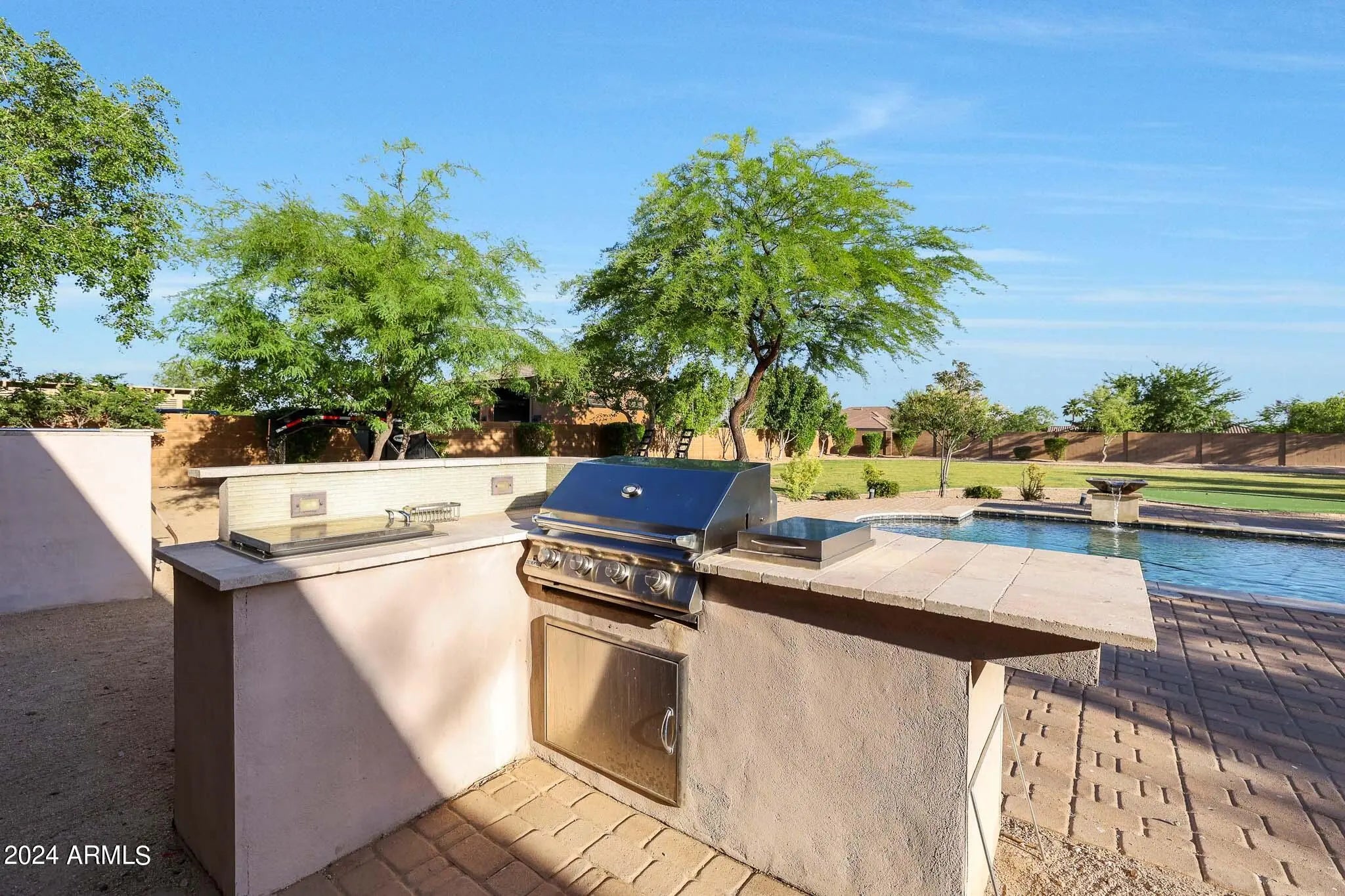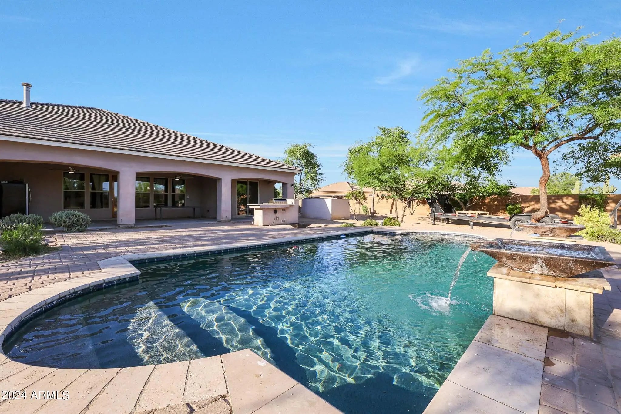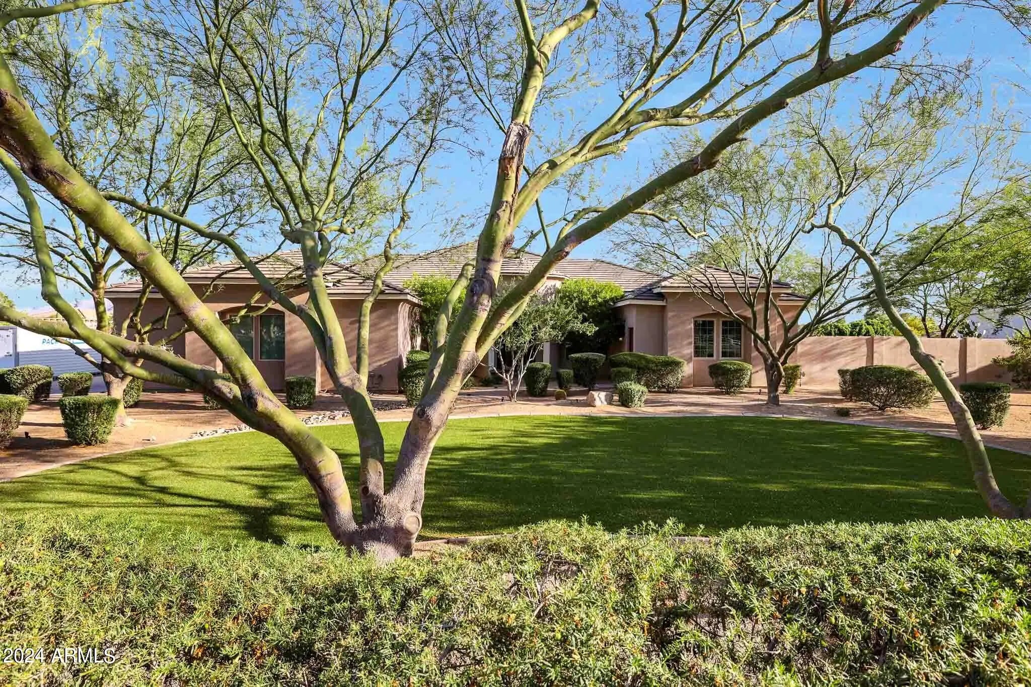 Luxury Redefined: 5 Bedroom Custom Estate with Pristine Features. Located on a sprawling lot of over an acre, this exquisite custom home blends sophistication with practicality, offering the perfect sanctuary for families and entertainers alike. Boasting 5 generous bedrooms and 3.5 lavish bathrooms, including a self-contained casita with its own full bathroom, this residence ensures comfort at every turn. Step inside to discover a grand open-concept kitchen featuring sleek granite countertops, a glass tile backsplash, and top-of-the-line stainless steel appliances. The breakfast bar opens seamlessly into a cozy living room, anchored by a stylish gas fireplace, creating an inviting space for gatherings. The master suite is a true retreat, complete with a sliding glass door leading to the lush backyard, a sunken bathtub with jets for ultimate relaxation, a modern snail shower, dual sinks, and a separate walk-in closet. A Jack and Jill bathroom mirrors this luxury with a sunken tub, surrounded by chic tile and granite countertops. Functionality meets style in the large laundry room, equipped with ample cabinetry, a sink, and granite countertops. Outside, the expansive covered patio is an entertainer's dream, featuring a built-in BBQ, a vast grass area, and a stunning pool, perfect for Arizona's sunny days. Also, the backyard is a coveted irrigated lot. Located conveniently close to shopping and freeway access to both the 303 and I-10, this home offers both privacy and accessibility. Whether it's luxurious living or high-end entertaining, this property promises to deliver an unmatched lifestyle. Make this breathtaking estate yours and indulge in the sophistication and comfort it offers every day.