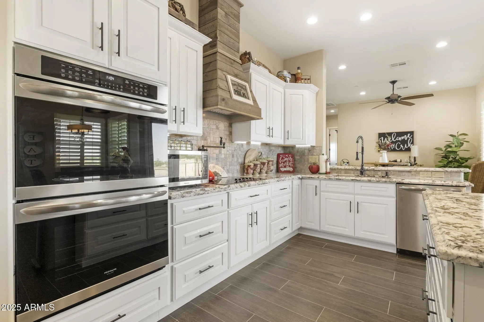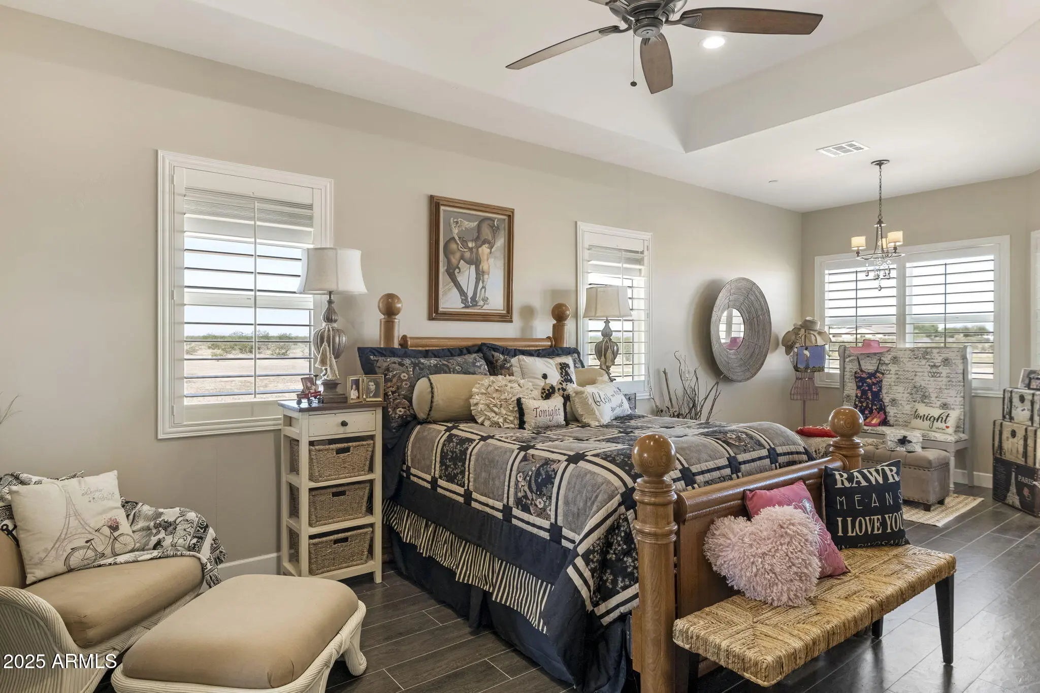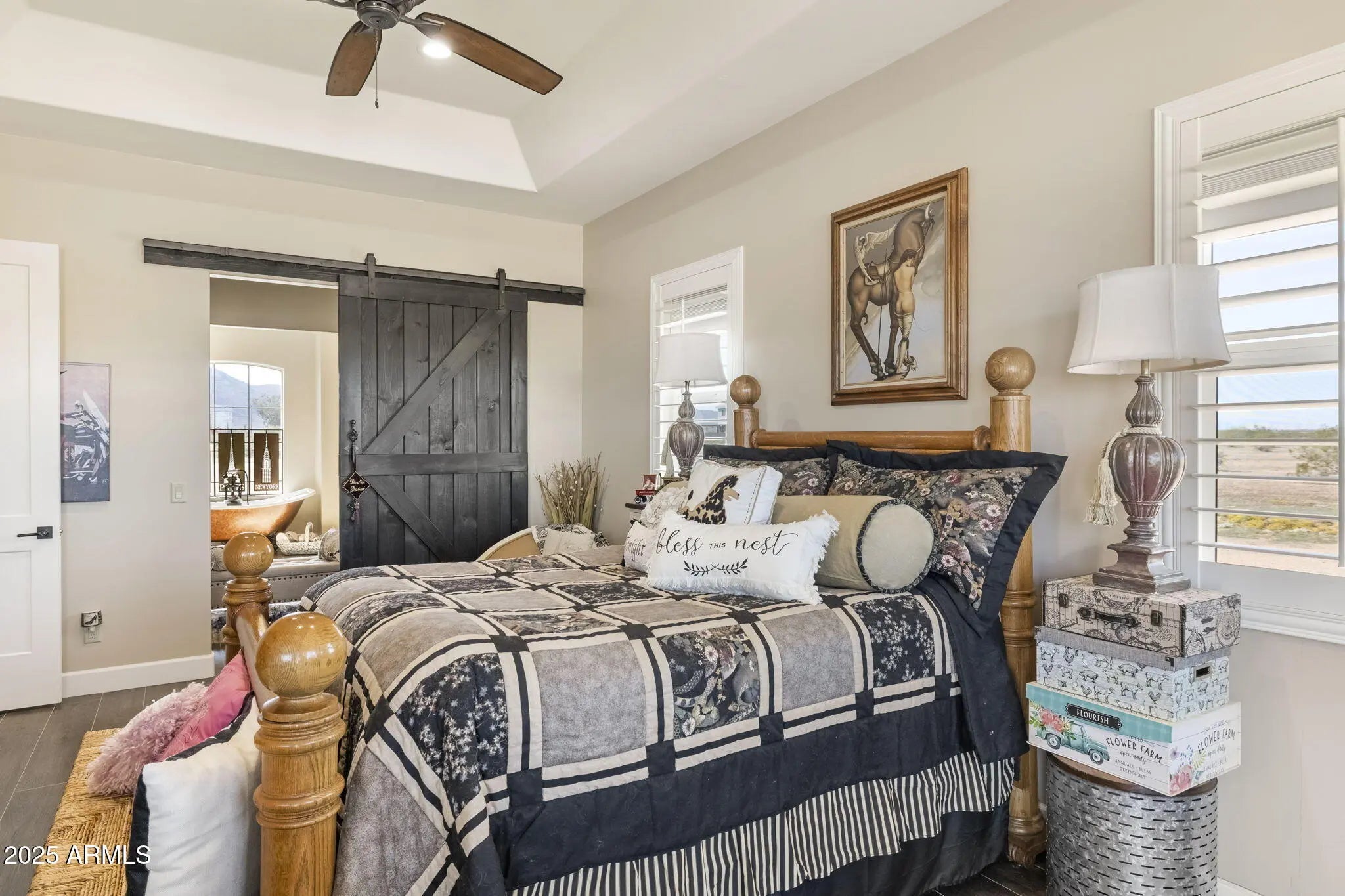 Custom Surprise Estate - Ultimate Desert Retreat. This stunning 3-bedroom, 3-bath plus den custom home sits on 2.5 private acres with panoramic mountain and desert views. Soaring ceilings and abundant natural light create open, inviting living spaces throughout. The gourmet kitchen is ideal for both everyday living and entertaining, showcasing quality finishes and a functional layout designed for the home chef. Elegant design elements shine throughout the home, blending style and practicality. The spacious primary suite offers a sitting area, custom dressing closet, and a luxurious ensuite with clawfoot soaking tub and mountain views. The expansive property provides endless possibilities: create an equestrian estate, add a pool or casita, or explore split-and sell options. 4-car garage.