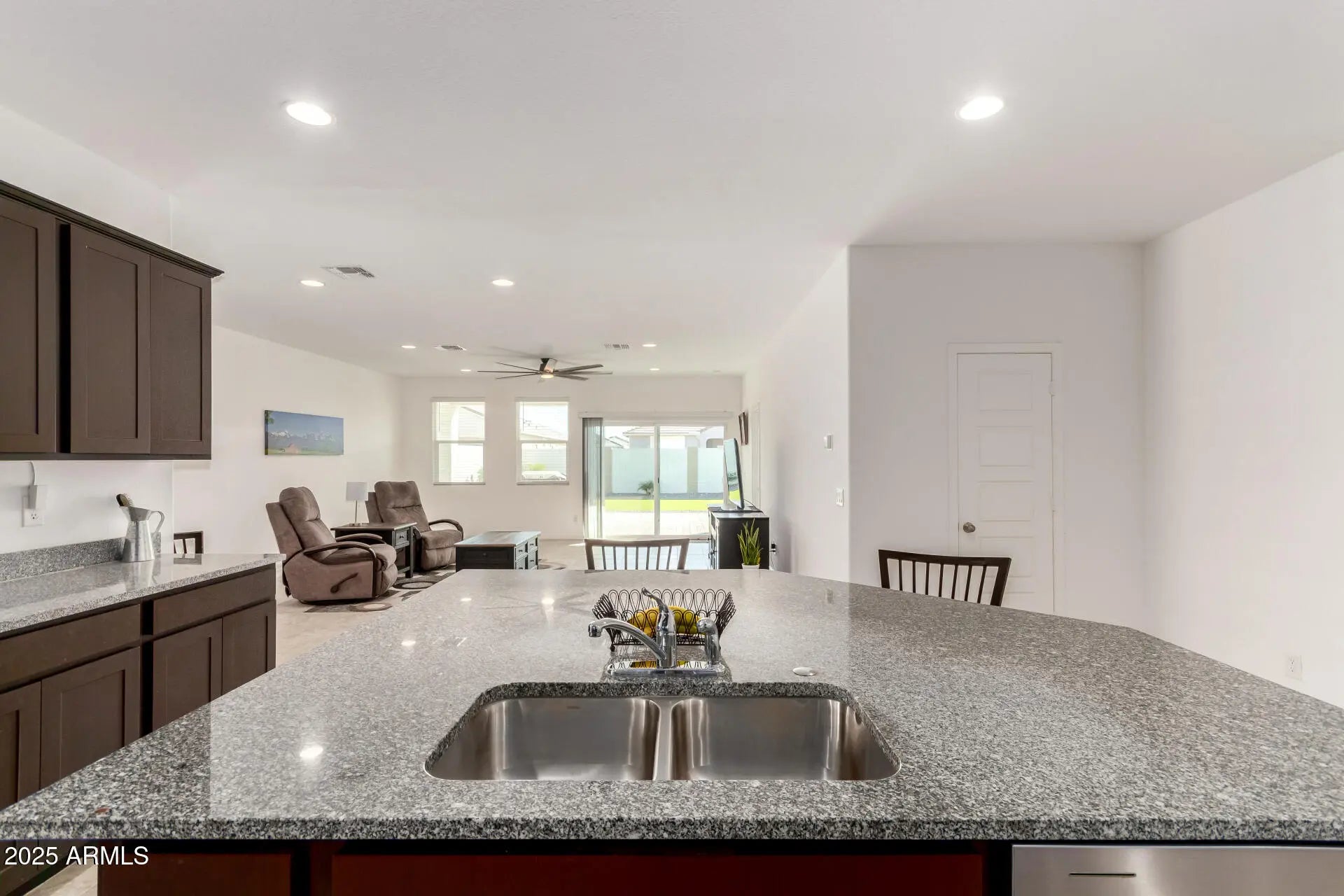 Welcome to this beautifully maintained home featuring a 2-car garage! Enter to discover a large open floor plan highlighted by tile flooring, neutral palette, and wide sliding glass doors leading to the back patio, perfect for both relaxing and entertaining. Spotless kitchen displays a handy pantry, plenty of cabinets with crown moulding, stainless steel appliances, granite counters, and a prep island with a breakfast bar ideal for casual dining. Serene primary bedroom ensures a good rest after a long day, which provides plush carpet, a private bathroom with dual sinks, and a walk-in closet. Continue outside to find a spacious backyard complete with a covered patio and synthetic grass. Don't miss out on this amazing jewel! Hurry!