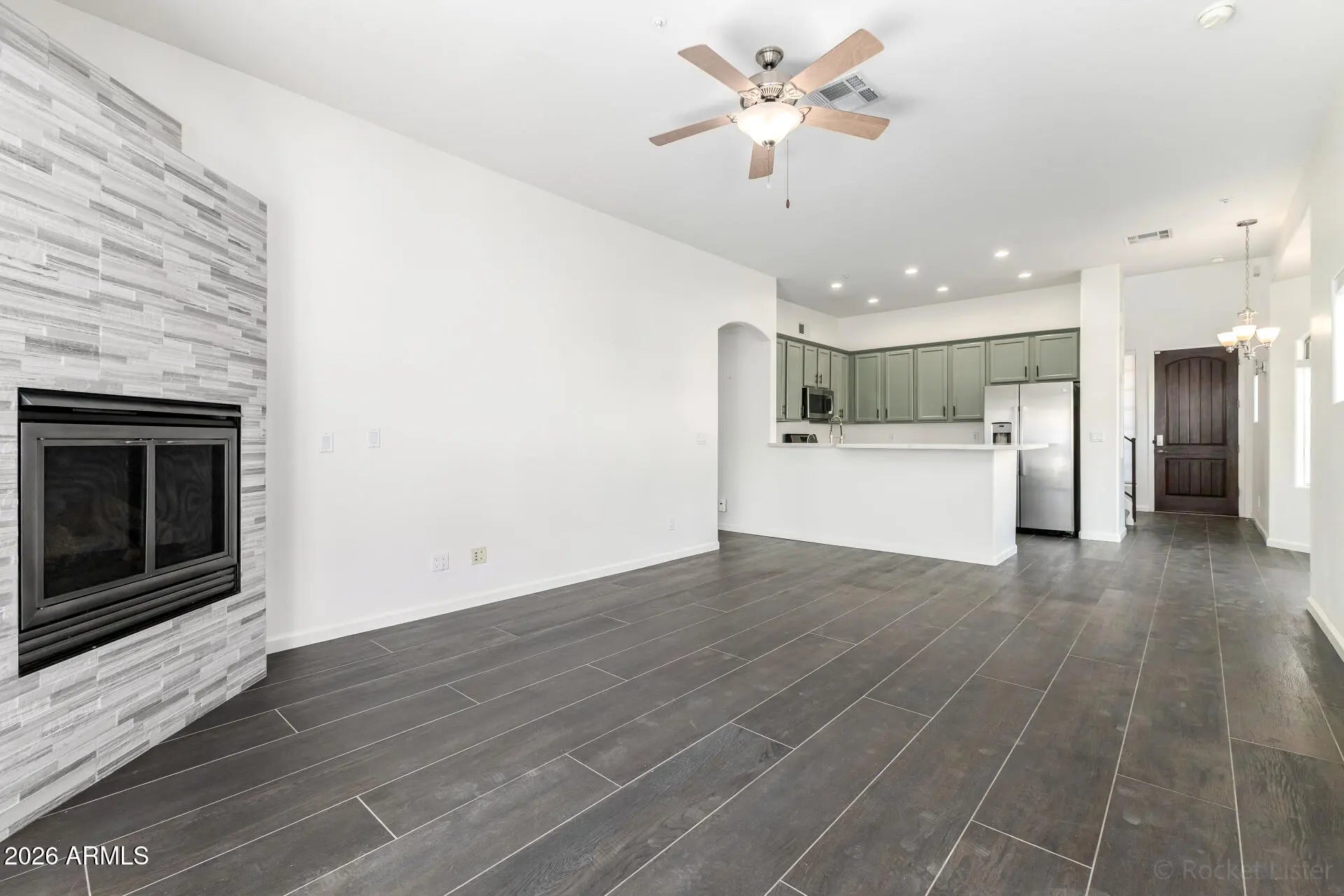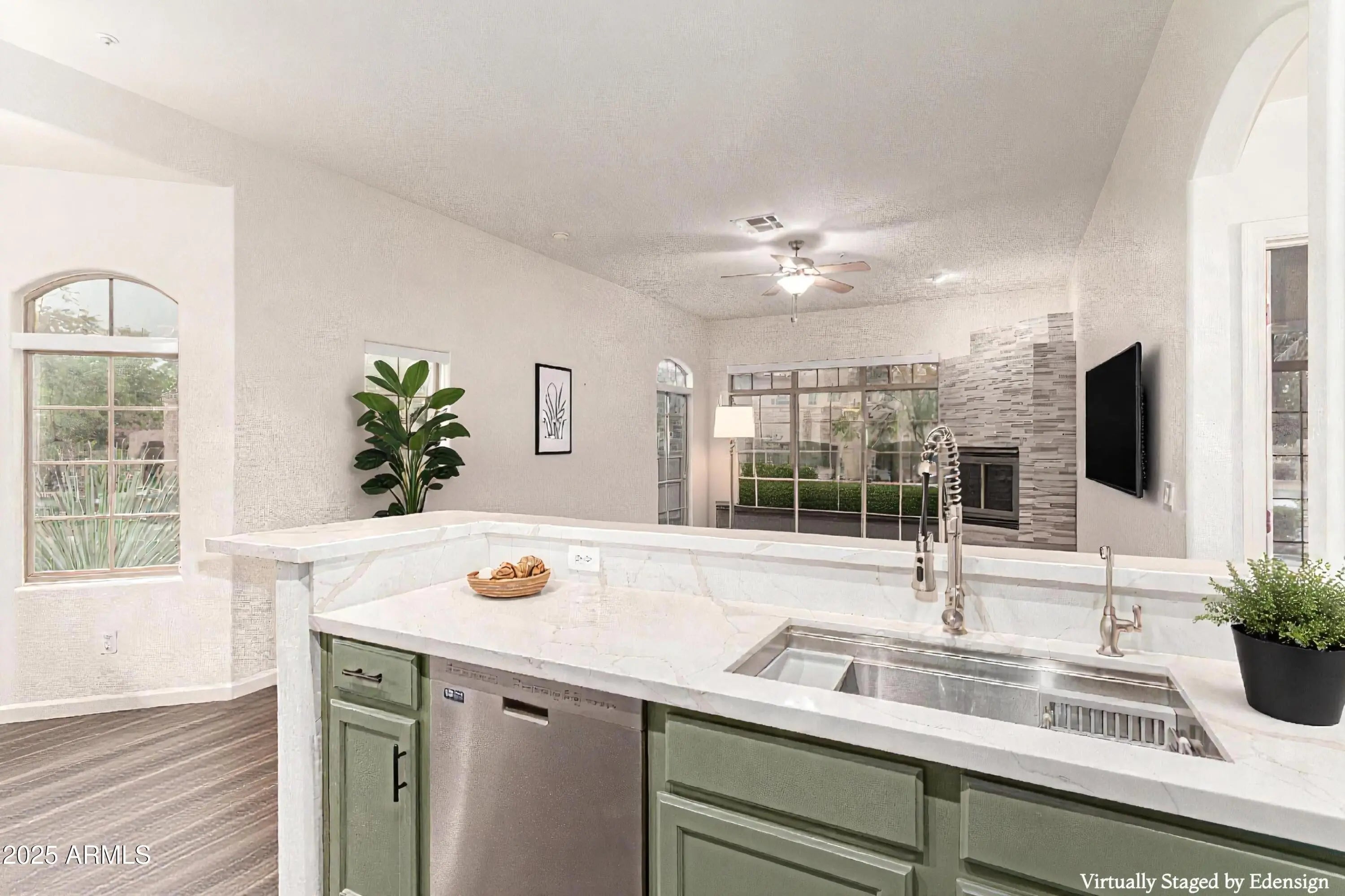 Fully remodeled and perfectly located, this 3-bedroom, 2.5-bath townhome in the gated Fountain Mist community combines modern comfort with prime Fountain Hills living. The 2023 remodel includes an updated kitchen and bathrooms, new flooring, interior paint, and a tankless water heater. The open-concept main floor features wood-look tile, a stacked-stone gas fireplace, and access to a private patio. The designer kitchen showcases quartz countertops, stainless steel appliances, a gas range, R/O system, and freshly painted sage-green cabinetry. The primary suite is on the main level with dual sinks and a walk-in shower featuring upgraded tile. Upstairs, find a loft plus two bedrooms—each with balconies, and one with a private ensuite-style bath and walk-in closet. The HOA recently replaced all community roofs for added peace of mind. Enjoy a 2-car garage, community pool, and an unbeatable location next to the iconic Fountain Park, multi-use trail, and local shops and restaurantsclose to everything Fountain Hills has to offer!