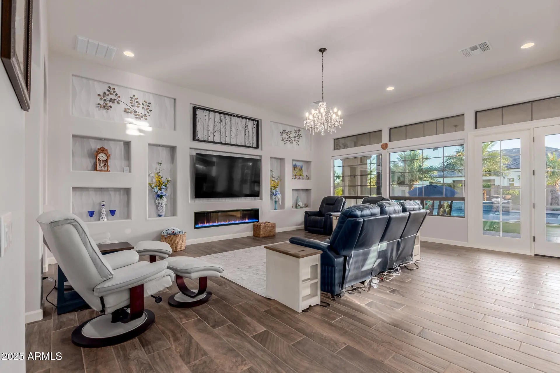 Your dream home is finally within reach! This beautiful estate welcomes you with a 3-car garage, 51 foot RV garage with 1/2 bath, RV gate, elegant pavers, an eye-catching stone facade, and an inviting courtyard. The gorgeous interior showcases a captivating open layout with soaring ceilings, recessed lighting, sleek window covering, features a custom built-in entertainment center with integrated lighting, a 75'' Dimplex electric fireplace, perfect for cozy movie nights or entertaining guests, exquisite wood-look flooring. The stunning chef's kitchen features a breakfast nook, granite counters, chic pendant lighting, a striking tile backsplash, custom wood cabinetry with crown molding, high-end stainless steel appliances, a walk-in pantry. The luxurious primary bedroom boasts direct backyard access, classic plantation shutters, a lavish ensuite with double sinks, a make-up vanity, and walk-in closets. Imagine enchanting evenings in the lovely backyard, which offers spacious covered patios, pristine artificial turf, a sparkling heated salt-water pool, and a separate 51 foot RV garage, perfect for a workshop or additional storage. This gem will sell fast! Act now before it's gone!