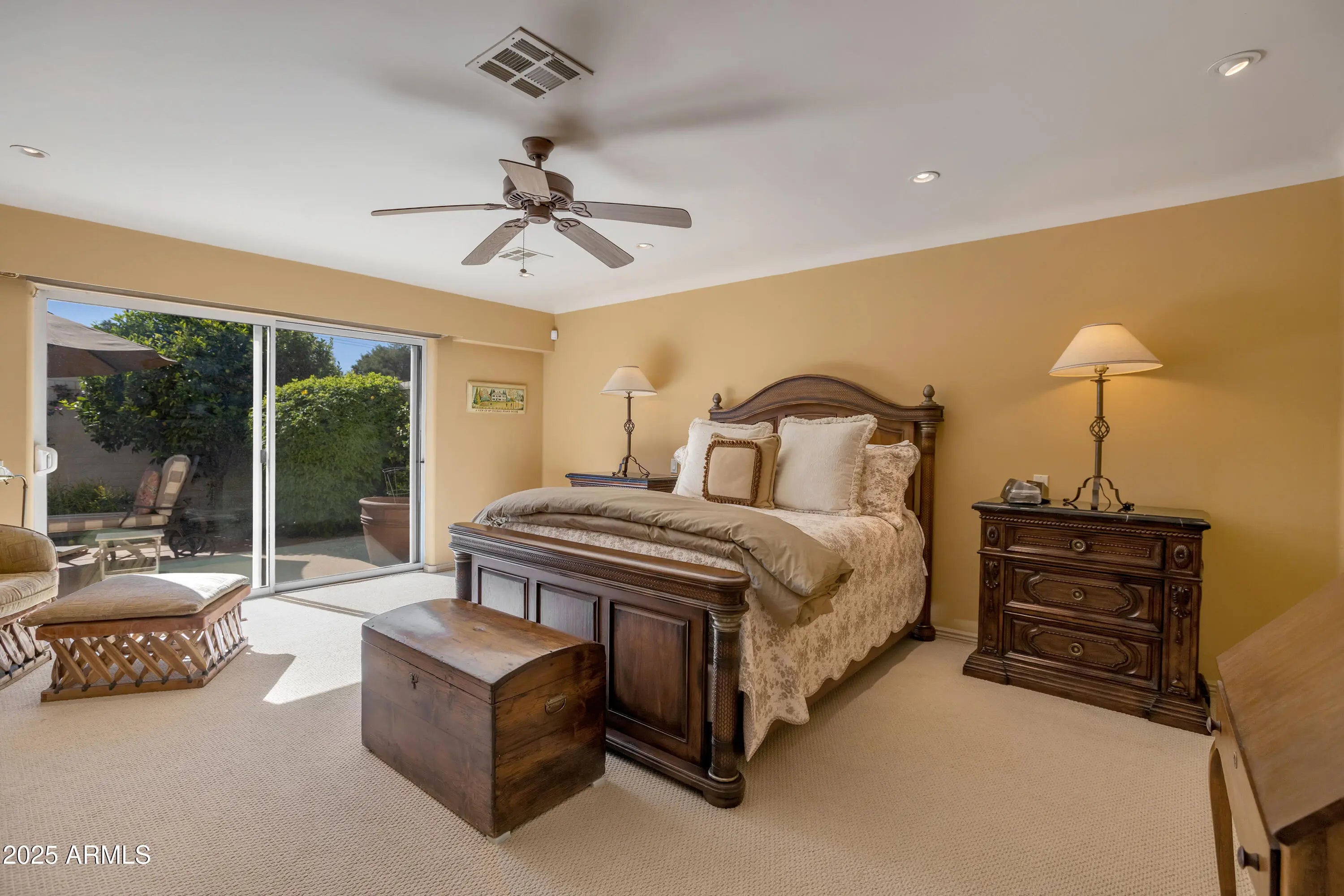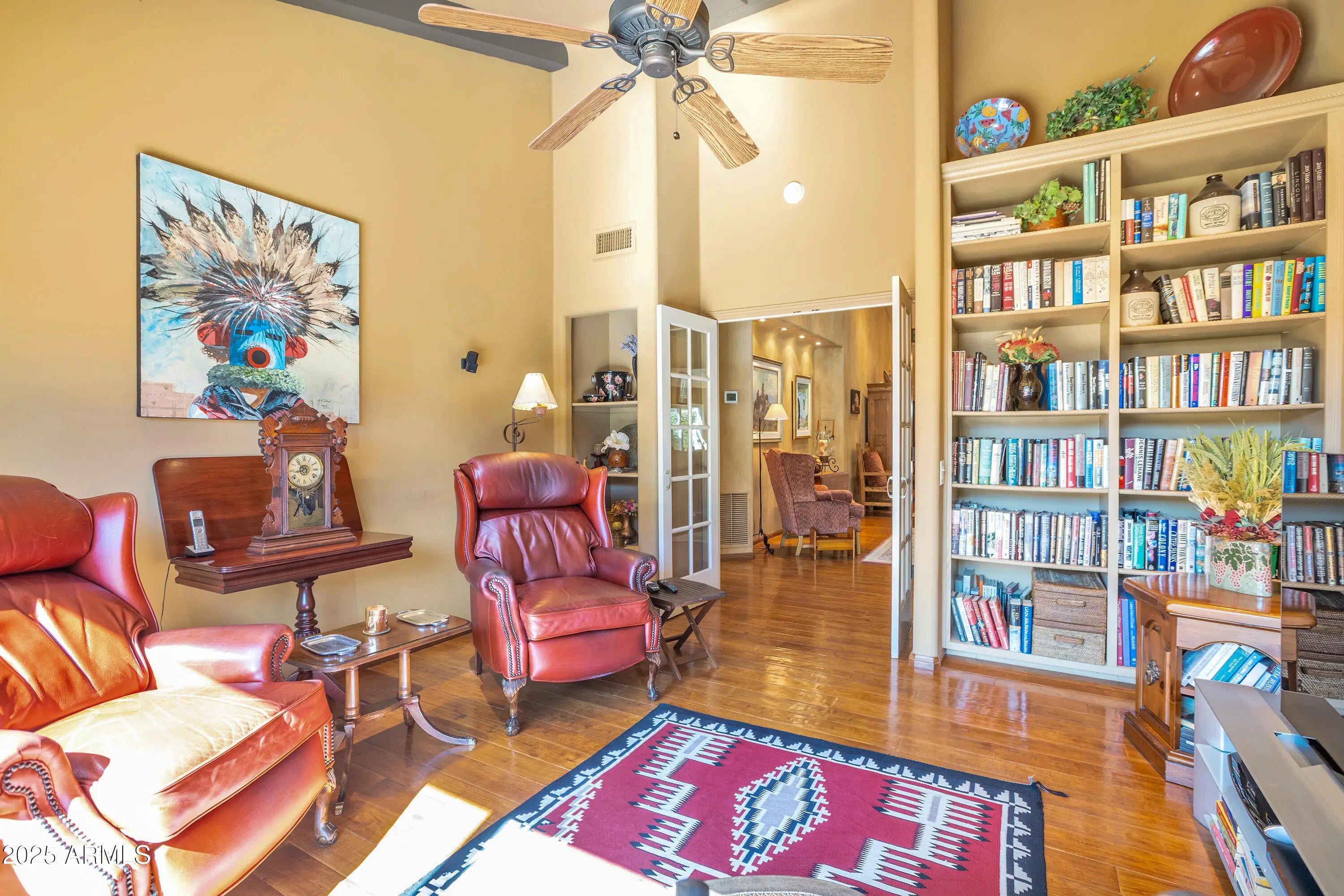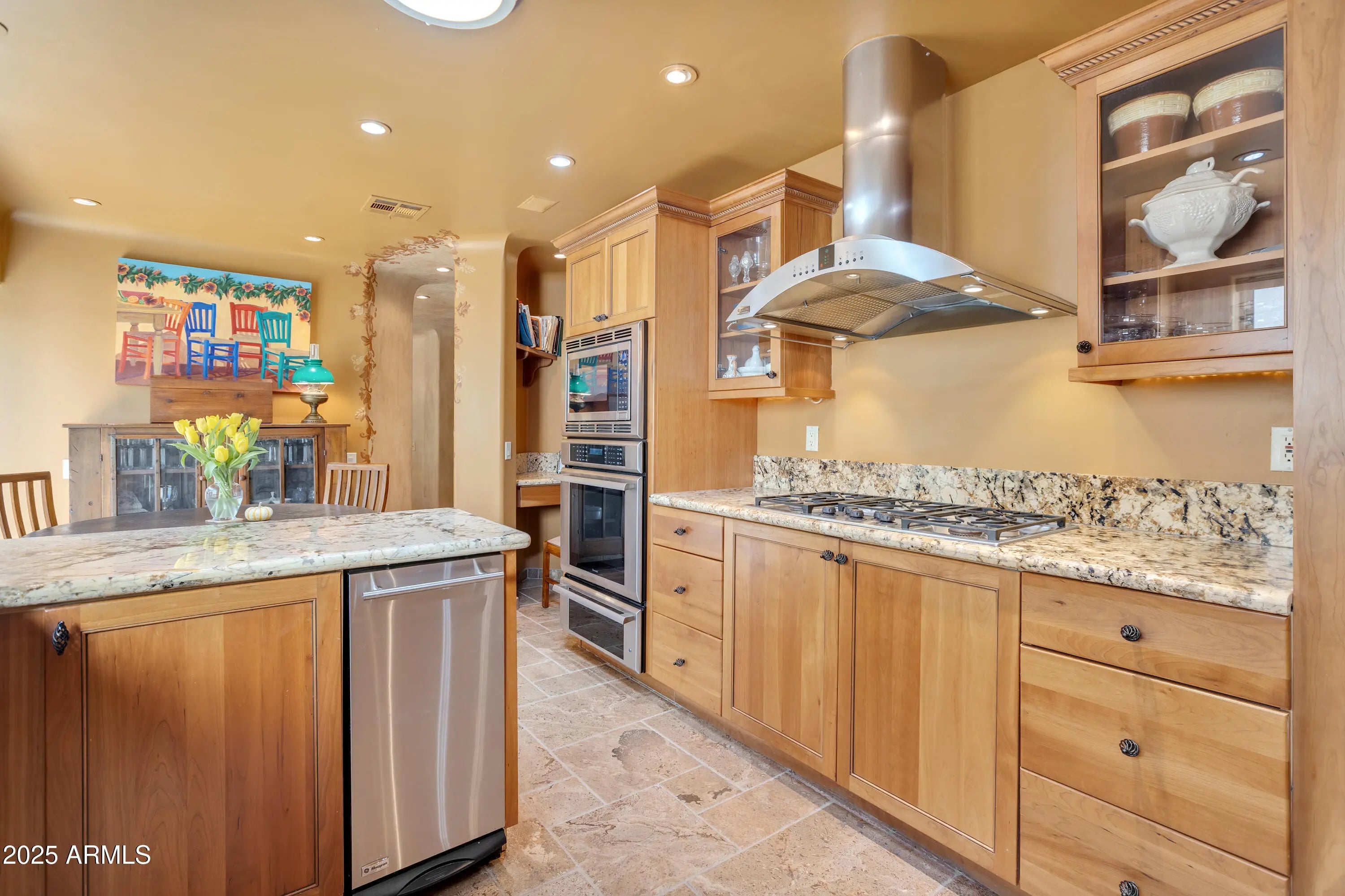 Discover refined luxury in this meticulously designed patio home, gutted down to the studs and remodeled in 2006, including all new copper piping and wiring throughout, nestled within the sought-after gated community of Casabella. This stunning residence offers 2 bedrooms, 2.5 bathrooms, a dedicated office, and a versatile den, with electric sun shades, providing the perfect blend of elegance and functionality. Step inside to experience an inviting open floor plan enhanced by soaring high ceilings and rich walnut wood floors that flow throughout the main living spaces. The formal dining room sets the stage for memorable gatherings, while the expansive great room, anchored by a large, gorgeous gas fireplace, creates an ideal setting for both relaxation and entertainment. Wine enthusiasts will appreciate the temperature-controlled wine room, perfect for showcasing your collection. The gourmet kitchen is a chef's dream, featuring gleaming granite countertops, abundant glass-faced Cherry cabinetry, and premium GE Monogram appliances including a refrigerator/freezer, 5-burner gas cooktop and trash compactor. Instant hot water adds convenience to your culinary adventures, along with an office nook. Retreat to the generous primary suite, with electric sun shades, where luxury awaits in the spa-inspired bathroom. Tile floors, granite countertops, a walk-in shower, expansive walk-in closet, and a private water closet provide a true sanctuary for rest and rejuvenation. Step outside to your own private oasisbeautifully landscaped side and back patios, with new Polyaspartic coating (guaranteed not to chip or peel), designed for Arizona's indoor-outdoor lifestyle. The temperature-controlled 2-car garage with custom storage cabinets offers both comfort and organization. Located minutes from Scottsdale's finest shopping, dining, and entertainment, this exceptional home delivers the ultimate in convenient desert living and is a real gem!