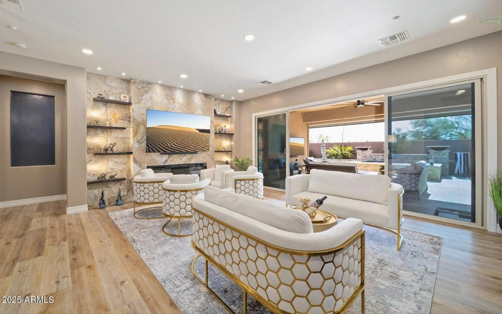 Experience the perfect blend of style, comfort, and functionality in this fully remodeled interior designer's home featuring paid PAID SOLAR and thoughtful upgrades throughout. Every detail has been carefully curated, simply move in and start living. Inside, the open layout is ideal for entertaining, with two fireplaces finished in natural stone and custom built-in TV niches. A spacious lounge and bar area create the perfect atmosphere for gatherings. The kitchen showcases rich natural stone surfaces, abundant cabinetry, and elegant finishes that elevate everyday living. The primary suite is a true retreat, offering a spa-like sanctuary bath complete with a large walk-in shower featuring double shower heads and multi-jets, a freestanding soaking tub, double vanities with lighted... mirror cabinets, and a custom built-in closet system. Two beautifully updated guest baths also feature natural stone and multi-jet showers. Enjoy seamless indoor-outdoor living with three expansive patio doors opening to a backyard oasis. The private outdoor space includes a pool and spa with water shears and fire bowls, an outdoor shower, a dog run, and a fully equipped outdoor kitchen under a pergola. The patio is complete with a remote-control shade, natural gas fire pit, and built-in BBQ, perfect for relaxing or entertaining. Low-maintenance landscaping and natural stone walkways frame the home beautifully. Recent upgrades include paid-off solar, new interior and exterior paint, reverse osmosis and soft-water systems, and a climate-controlled garage.