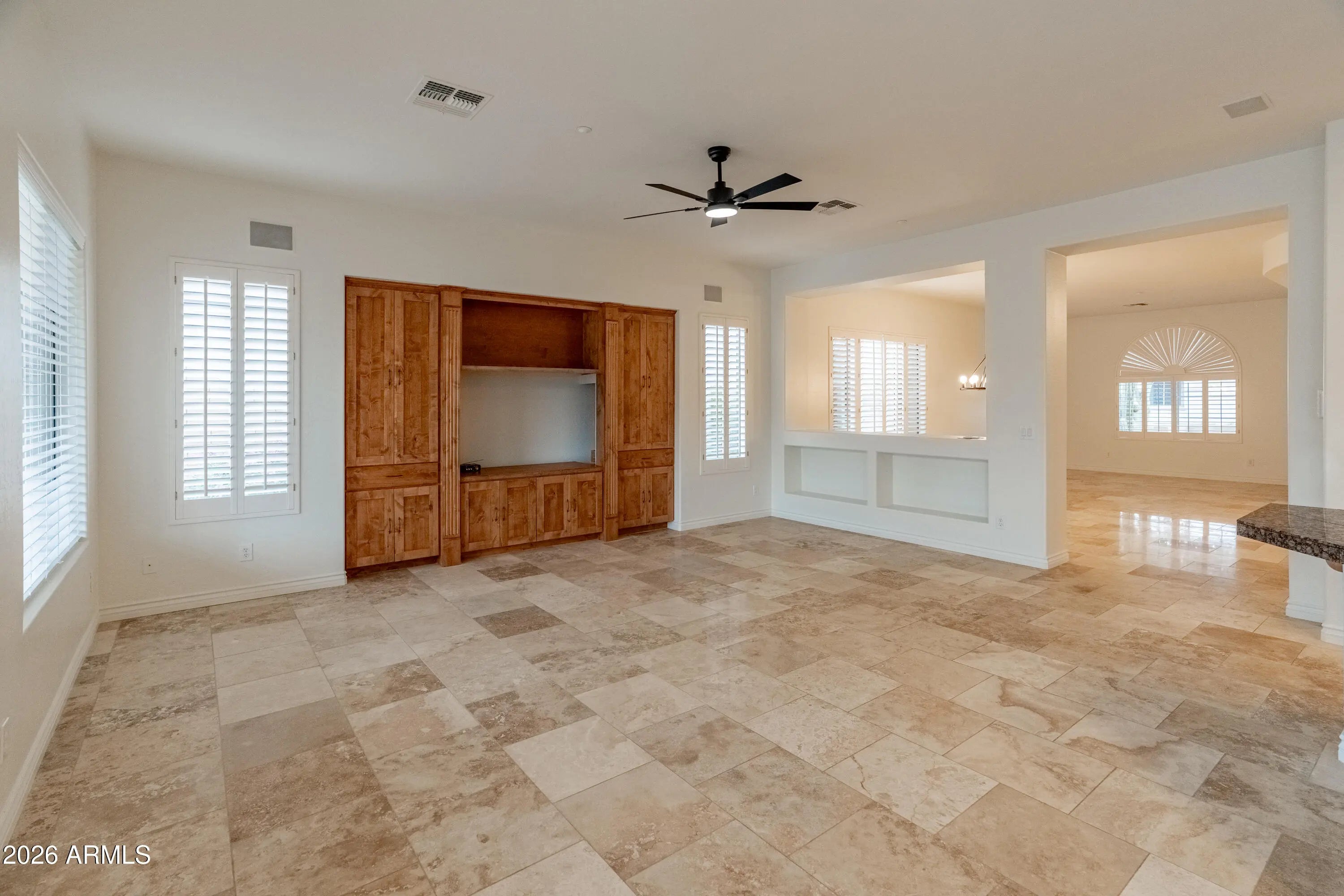 Morning coffee in your gated courtyard. Afternoon laps in the heated pool (2022). Evenings at one of Anthem's two clubhouses, or enjoy tennis, pickleball, or golf just steps from home. This north/south-facing home feels warm and welcoming, featuring fresh interior paint, travertine floors, new lighting, soft neutral tones, plantation shutters, and newer stainless appliances. The kitchen opens to the main living area, ideal for everyday living and entertaining. A custom family room built-in anchors the space, while brand new carpet in the bedrooms adds a fresh finish. The private primary suite offers a peaceful retreat. All set within the gated Anthem Golf & Country Club lifestyle.