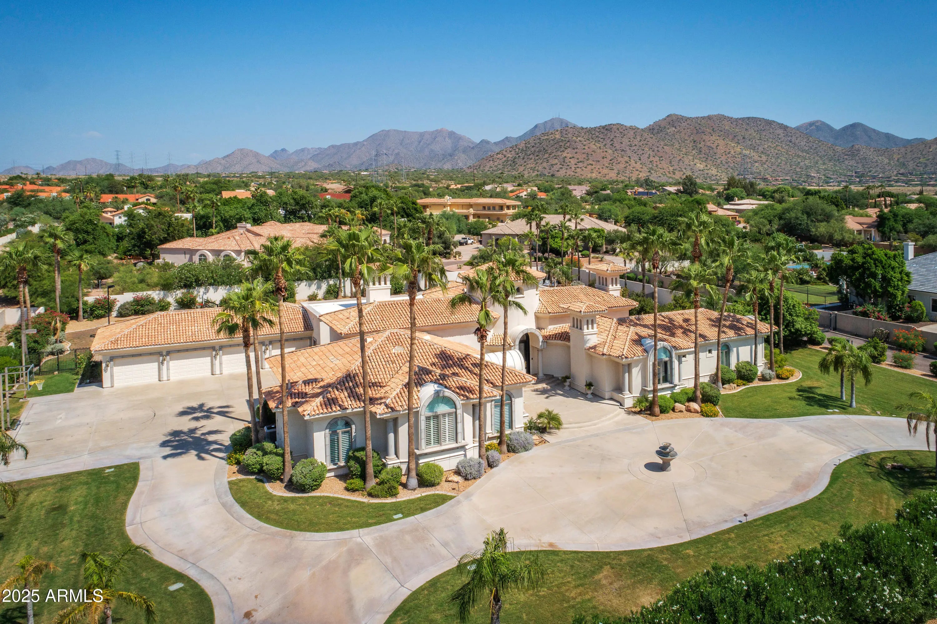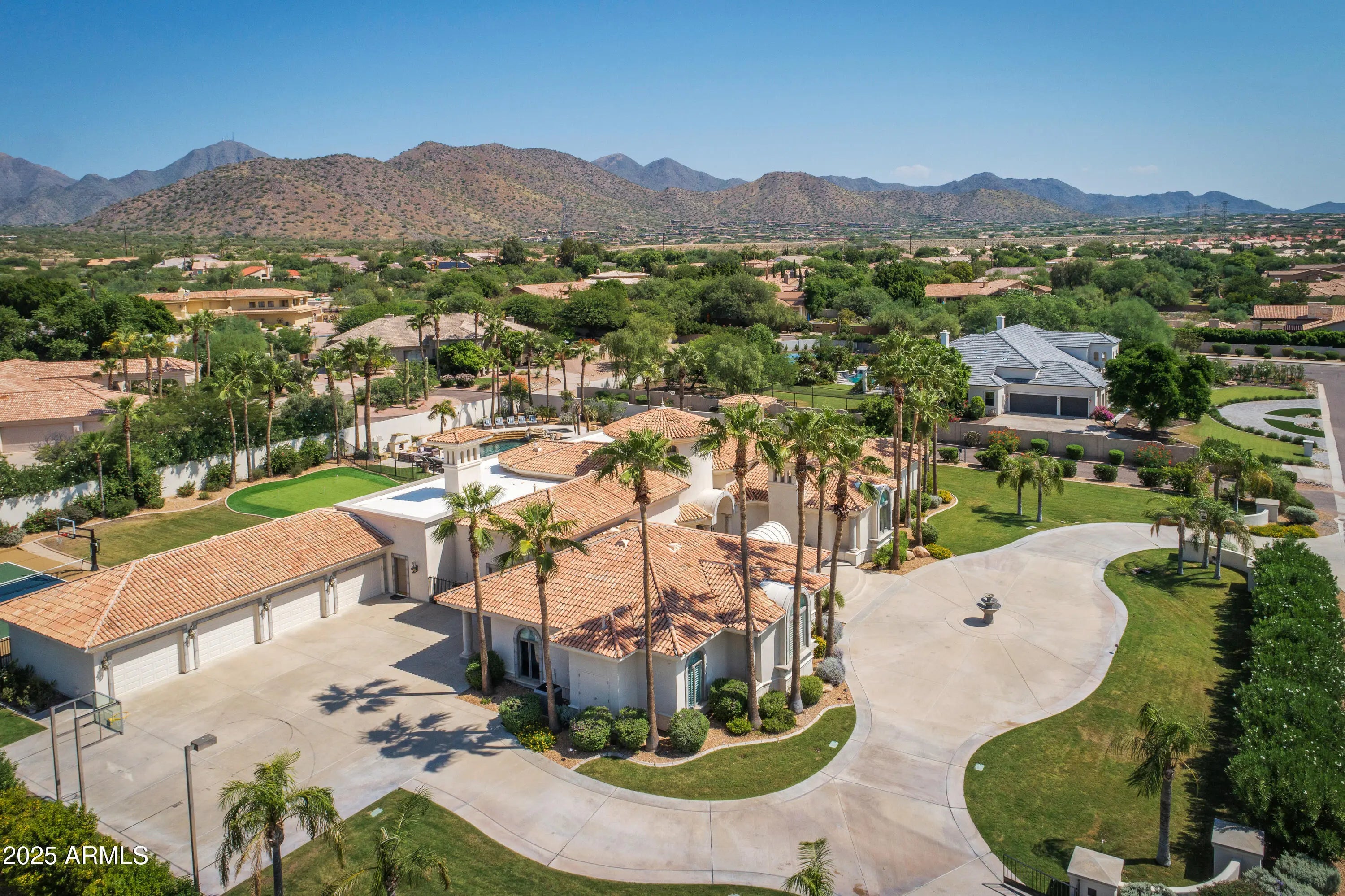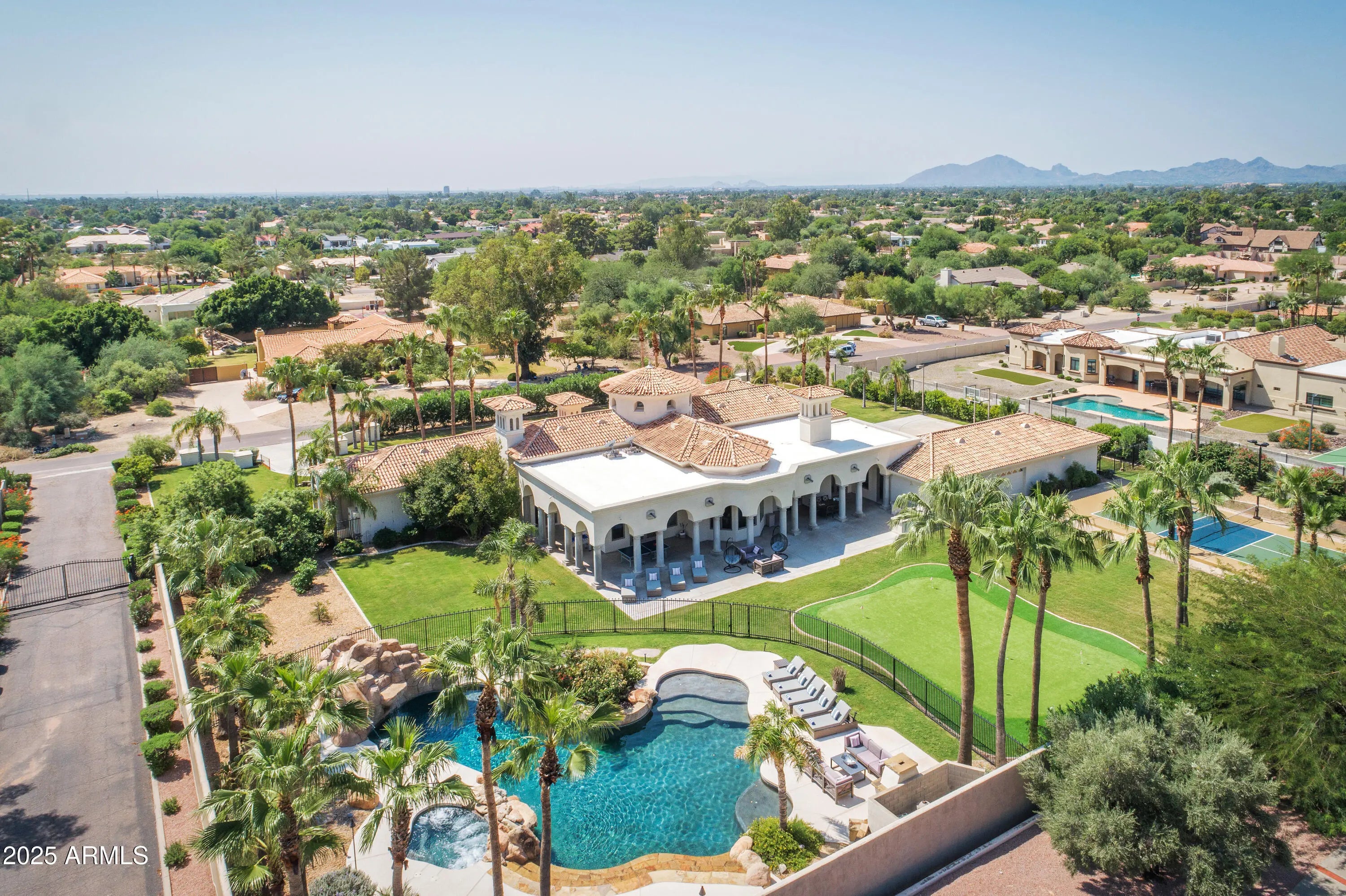 Experience resort-style living in this 5,775 sq ft Cactus Corridor estate on 1.2 acres of luxury. Framed by mountain views, this Laurel Lane masterpiece welcomes with striking curb appeal and a grand arrival court. The split floor plan showcases an opulent primary retreat with fireplace, sitting area, and marble spa bath. A chef's kitchen featuring Wolf/Sub-Zero appliances overlooks the 60,000-gallon pool and sweeping vistas. Outdoor amenities abound—custom waterslide, pickleball and basketball courts, putting green, and water features create a true entertainer's paradise. A separate guest wing with 4 bedrooms ensures comfort and privacy for all. Large bonus room is great for entertaining. The home also offers formal living and dining rooms, a large bonus room perfect for entertaining, and a full pool bath for added convenience. The resort-style backyard is designed for ultimate outdoor enjoyment, featuring a 60,000-gallon pool with a custom waterslide and cascading water features. Additional amenities include a regulation-size pickleball court with lights, a basketball court with hoops in both the front and back, a poolside fireplace, and a large putting green. The 4-car garage offers an additional rear garage door for backyard access. There is also ample space to add a casita on the southwest corner of the lot, providing even more flexibility for the new owner . This is a rare opportunity to own a spectacular estate in one of Scottsdale's most sought-after neighborhoods, offering both luxury and convenience in an unparalleled setting.