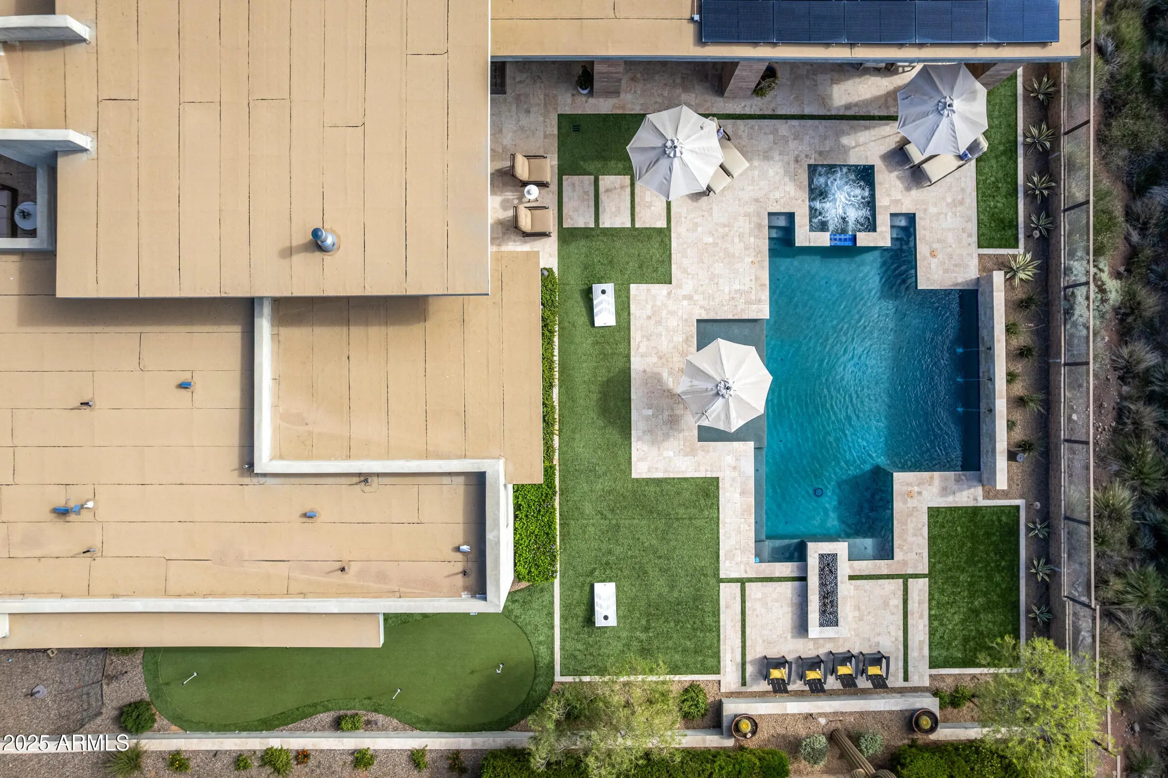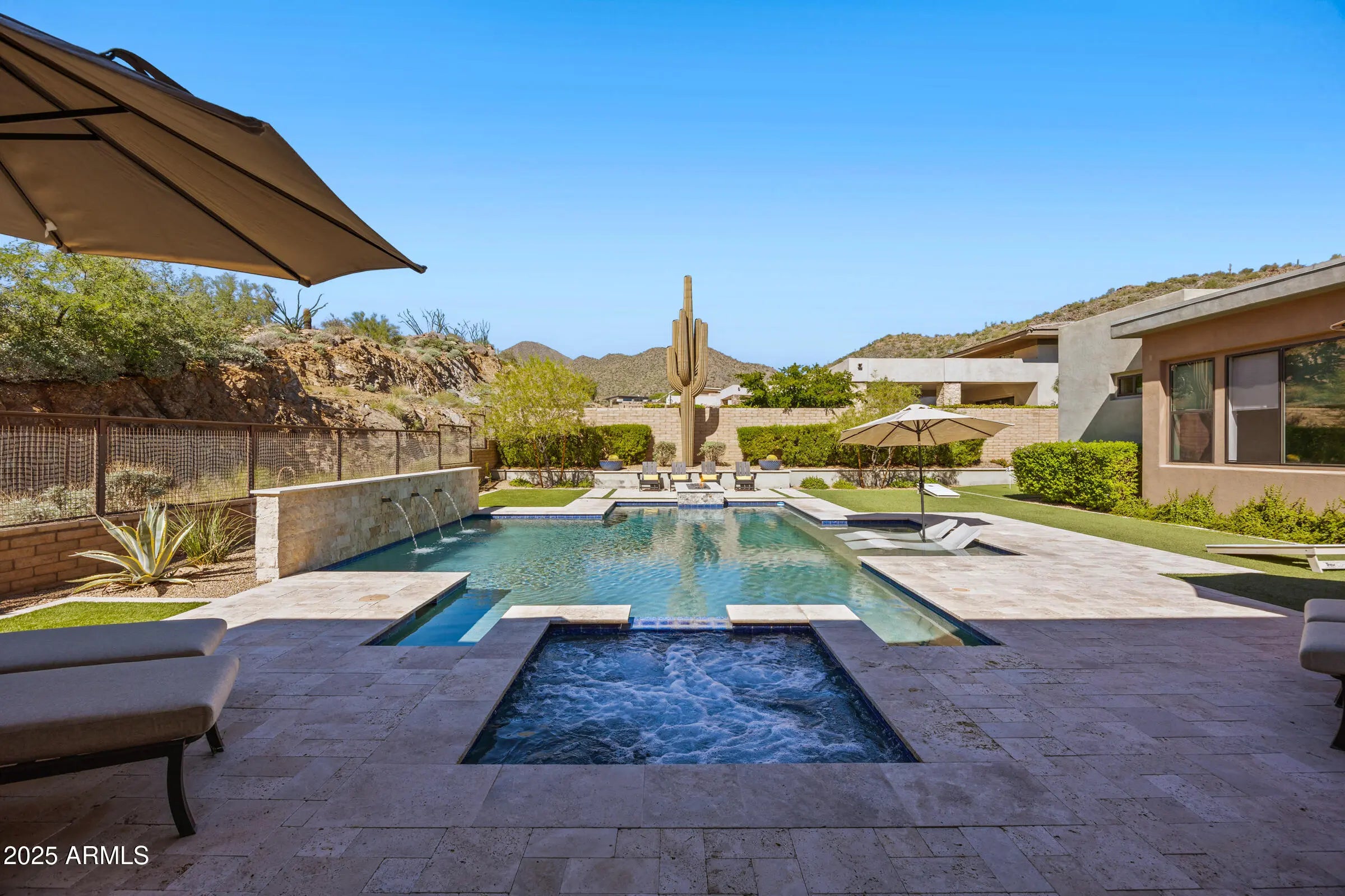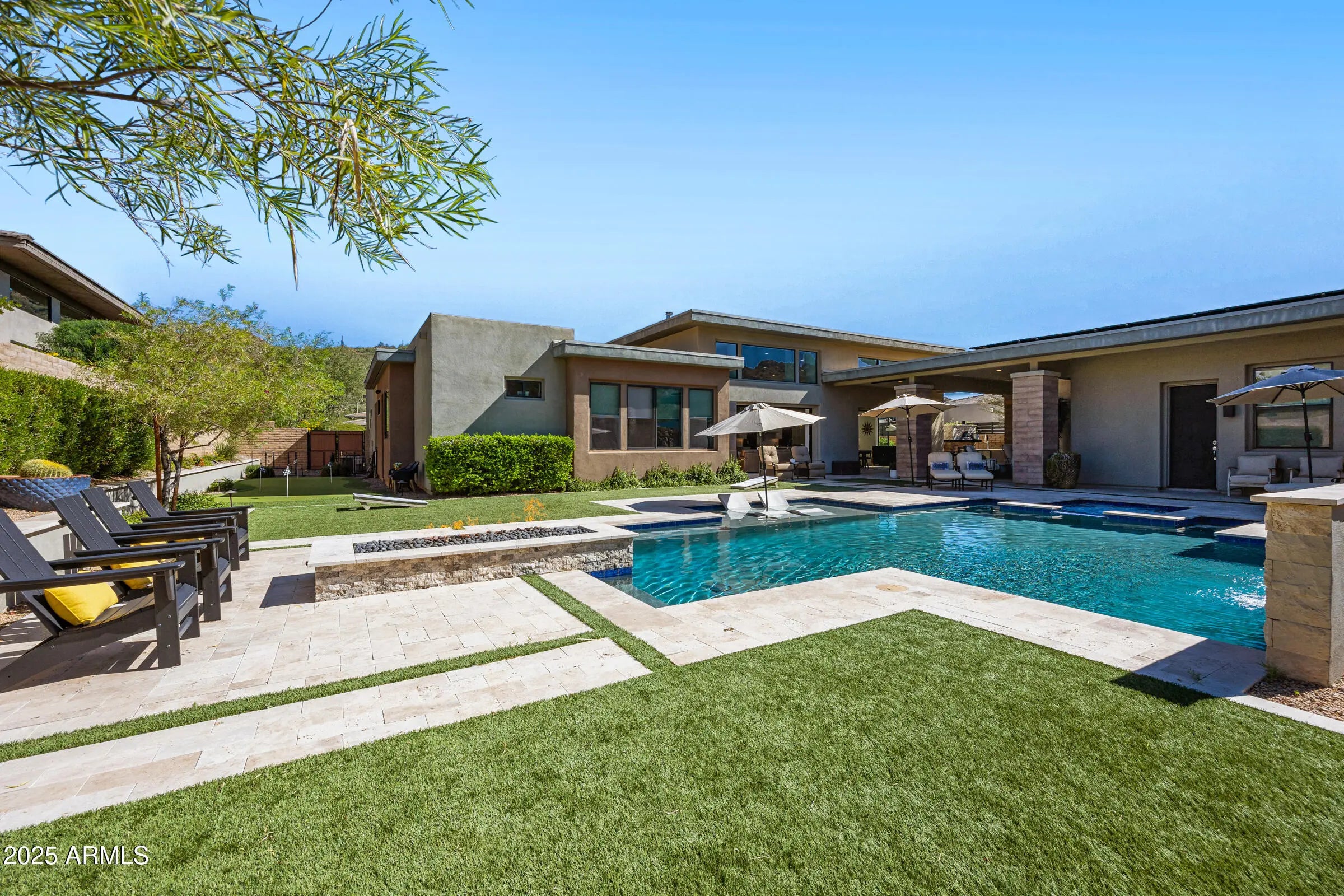 Welcome to a breathtaking desert lifestyle in the highly esteemed gated community of Adero Canyon with this exceptional 3,624 sq ft modern residence — featuring a 3,250 sq ft single-level main home plus a 374 sq ft private casita, 3 bedrooms + den, 3.5 bathrooms, and a rare 4-car garage designed for both luxury and flexibility. A dramatic private courtyard entry framed by custom steel doors sets the tone for refined living and exceptional privacy. Inside, the open-concept great room boasts soaring ceilings and designer finishes, seamlessly flowing into the chef-inspired kitchen featuring Wolf & Sub-Zero appliances, quartz surfaces, custom cabinetry, and a generous walk-in pantry. The primary suite is a tranquil retreat with a spa-style bath and oversized walk-in closet. A secondary bedroom functions as a full second primary suite, ideal for multi-generational living or extended-stay guests. The detached casita provides a third private suite option perfect for company, an office, or a luxurious in-law setup. Entertainment thrives here with a man cave/game room that's perfect for relaxing or hosting friends. Outside, a resort-style backyard awaits complete with travertine decking, sparkling pool & spa, built-in BBQ, pizza oven, fire pit, kegerator, bar seating, and built-in patio heaters for year-round enjoyment. A side-yard putting green adds fun and flair, while professionally designed desert landscaping and lighting showcase epic mountain and city-light views that are breathtaking from sunrise to starlit evenings. Located steps from the Adero Trailhead and minutes from The Adero Club, Scottsdale dining, Mayo Clinic, and top-ranked BASIS schools, this home offers a rare combination of luxury, comfort, and world-class desert living.