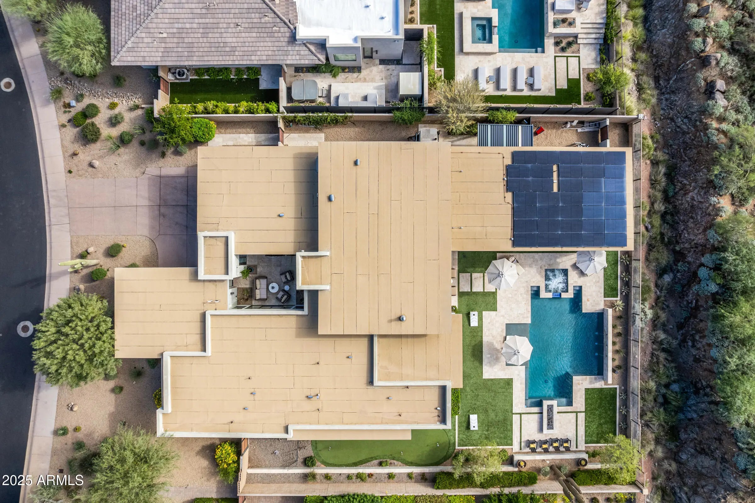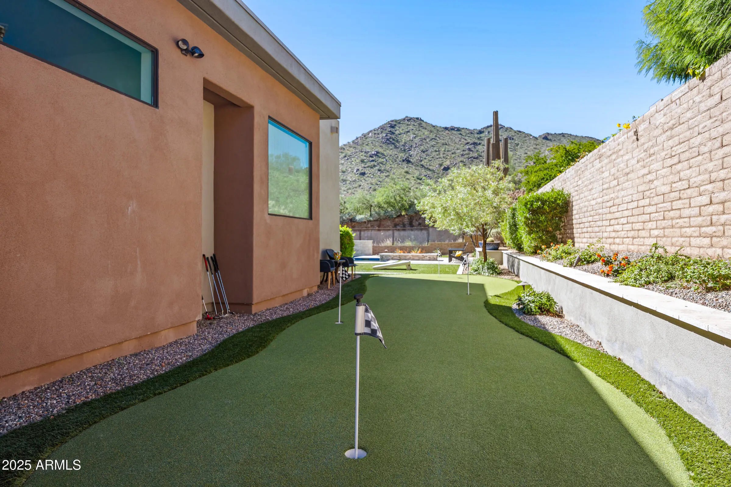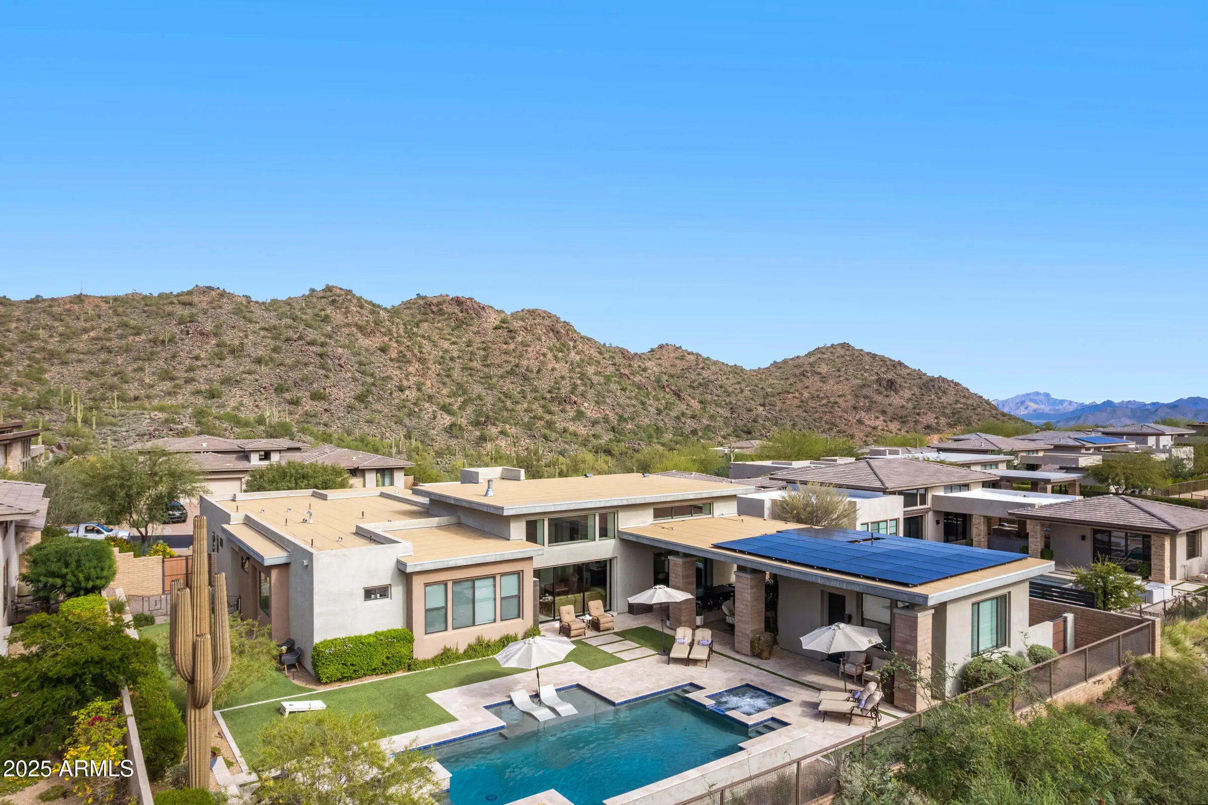 Welcome to a breathtaking desert lifestyle in the highly esteemed gated community of Adero Canyon with this exceptional 3,624 sq ft modern residence — featuring a 3,250 sq ft single-level main home plus a 374 sq ft private casita, 3 bedrooms + den, 3.5 bathrooms, and a rare 4-car garage designed for both luxury and flexibility. A dramatic private courtyard entry framed by custom steel doors sets the tone for refined living and exceptional privacy. Inside, the open-concept great room boasts soaring ceilings and designer finishes, seamlessly flowing into the chef-inspired kitchen featuring Wolf & Sub-Zero appliances, quartz surfaces, custom cabinetry, and a generous walk-in pantry. The primary suite is a tranquil retreat with a spa-style bath and oversized walk-in closet. A secondary bedroom functions as a full second primary suite, ideal for multi-generational living or extended-stay guests. The detached casita provides a third private suite option perfect for company, an office, or a luxurious in-law setup. Entertainment thrives here with a man cave/game room that's perfect for relaxing or hosting friends. Outside, a resort-style backyard awaits complete with travertine decking, sparkling pool & spa, built-in BBQ, pizza oven, fire pit, kegerator, bar seating, and built-in patio heaters for year-round enjoyment. A side-yard putting green adds fun and flair, while professionally designed desert landscaping and lighting showcase epic mountain and city-light views that are breathtaking from sunrise to starlit evenings. Located steps from the Adero Trailhead and minutes from The Adero Club, Scottsdale dining, Mayo Clinic, and top-ranked BASIS schools, this home offers a rare combination of luxury, comfort, and world-class desert living.