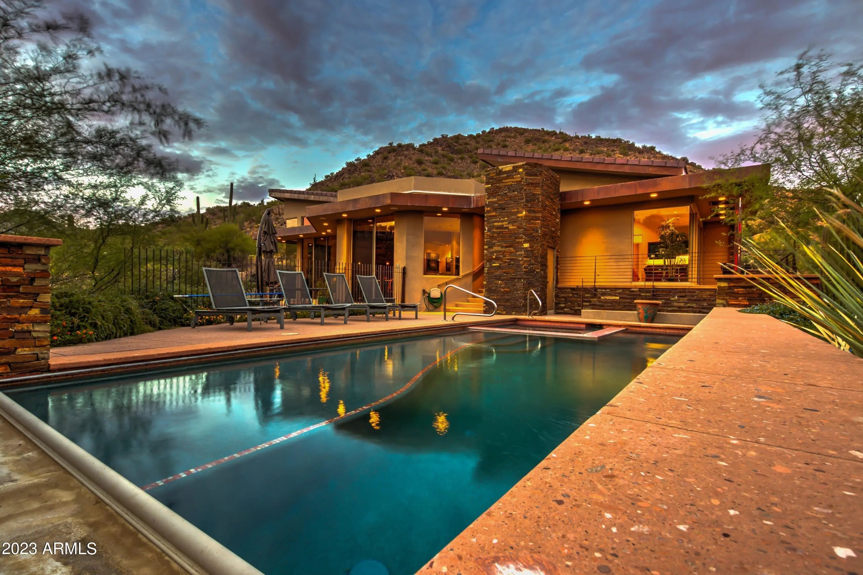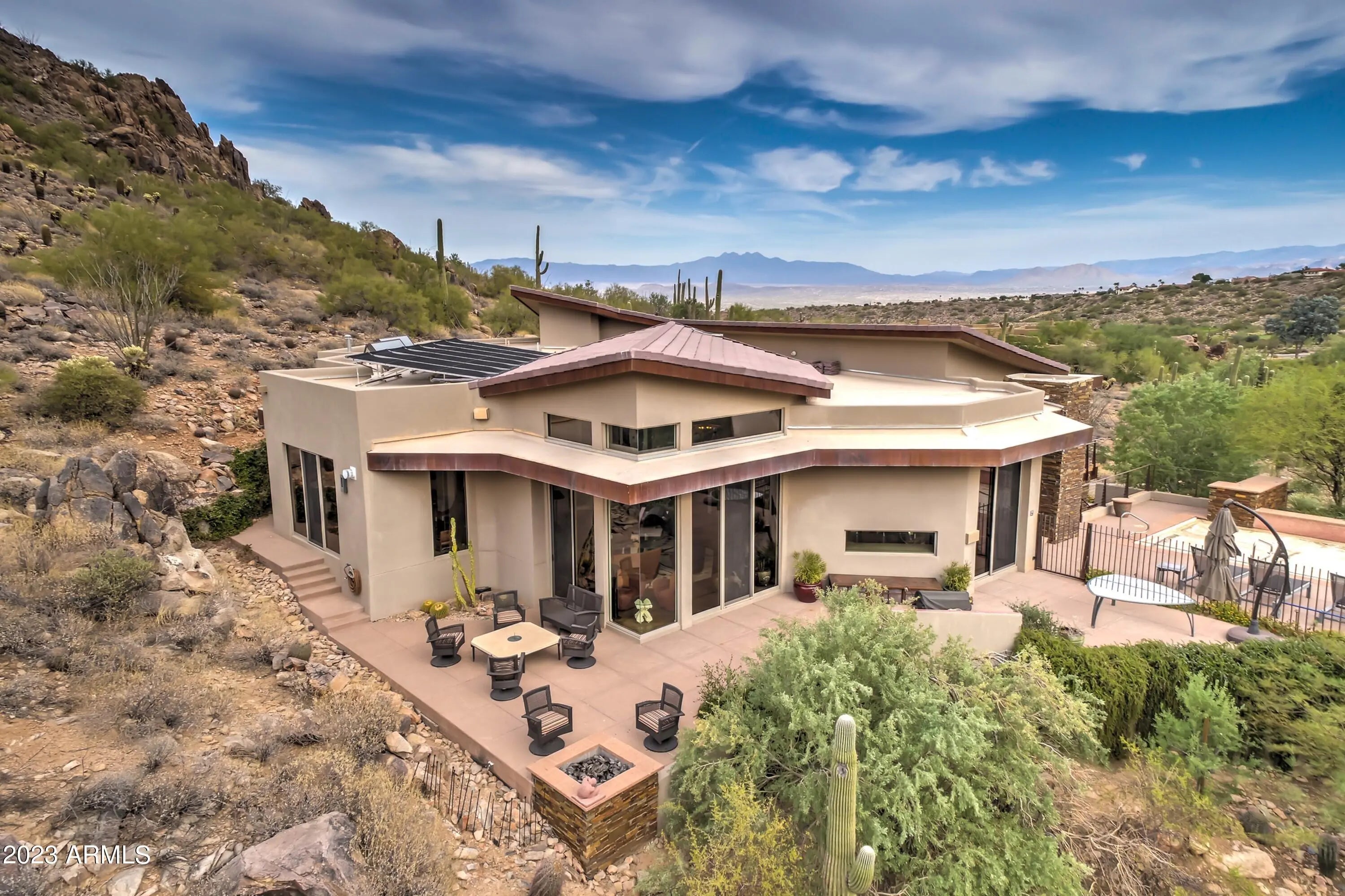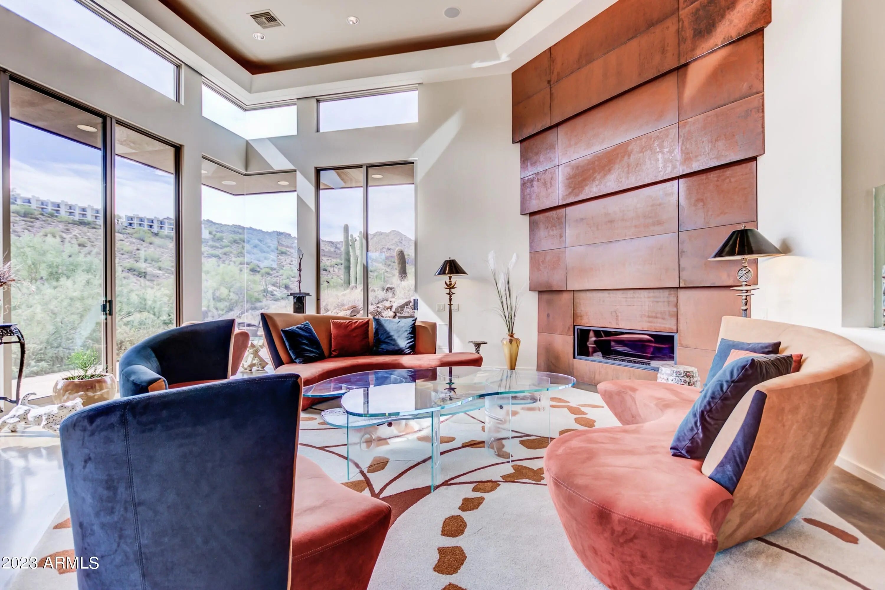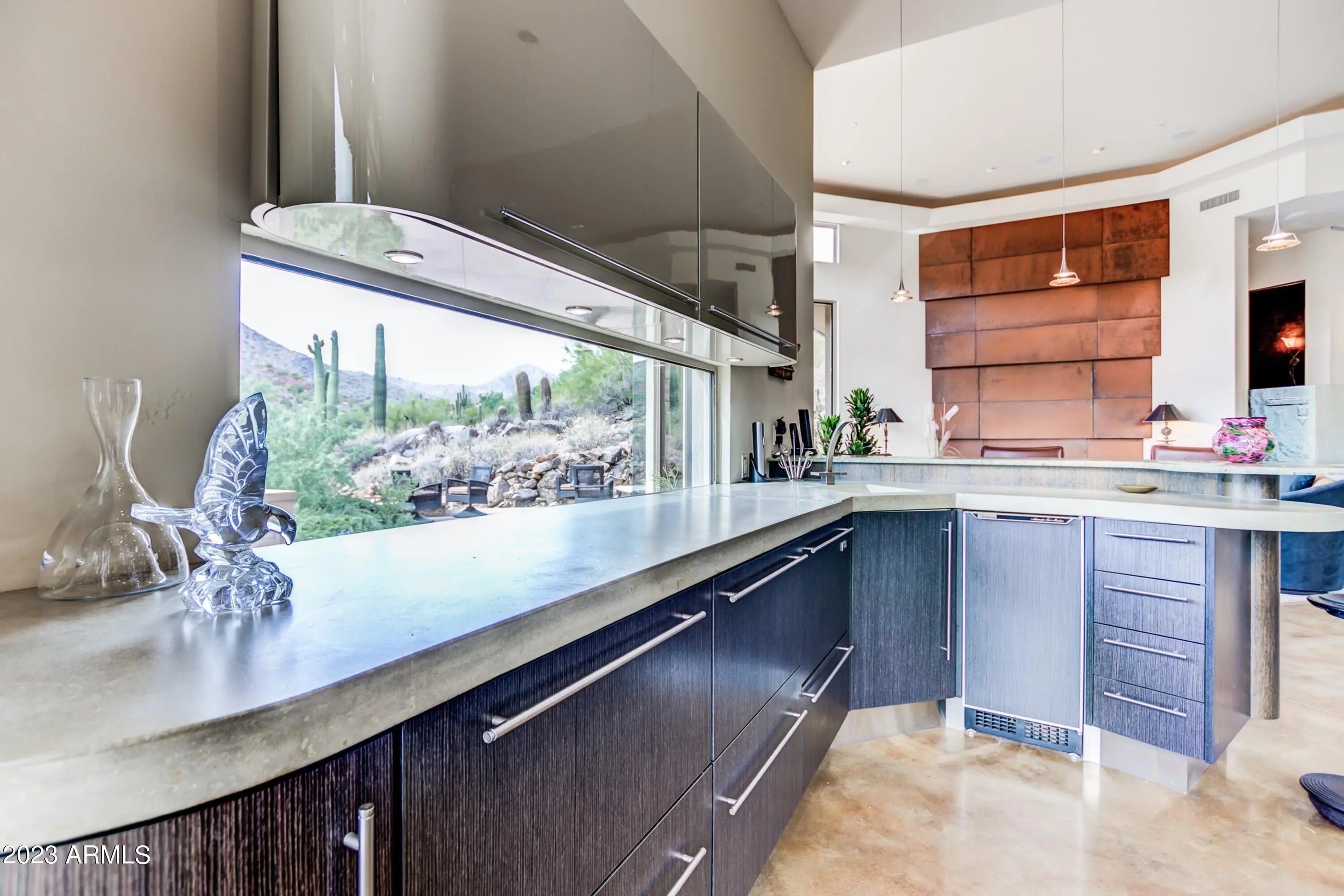 Frank Lloyd Wright-inspired contemporary home tucked in the west end of Sunridge Canyon, bordered by open public land for outstanding privacy and views. Double‑gated access and a long private drive lead to a modern design of steel, glass, and clean architectural lines. The dramatic 18‑foot custom iron and glass entry opens to spacious living areas with soaring ceilings, walls of glass with motorized blinds, and a sleek fireplace framed by sculptural metal panels concealing a hidden TV. The gourmet kitchen features imported Italian cabinetry and high‑end Gaggenau and Thermador appliances. Designed for comfort, style, and connection to its desert setting, this home offers refined living in one of Fountain Hills' most desirable communities.