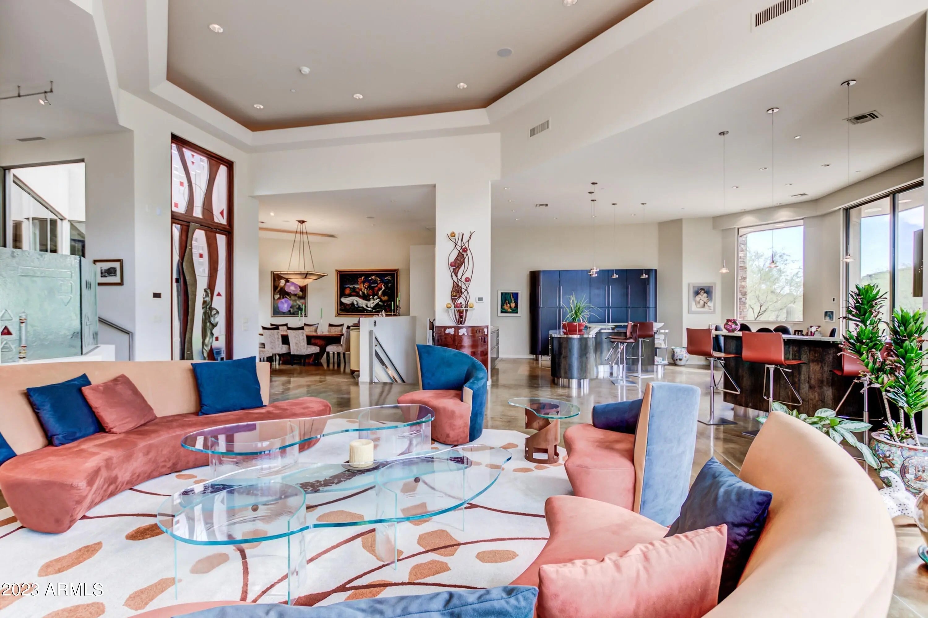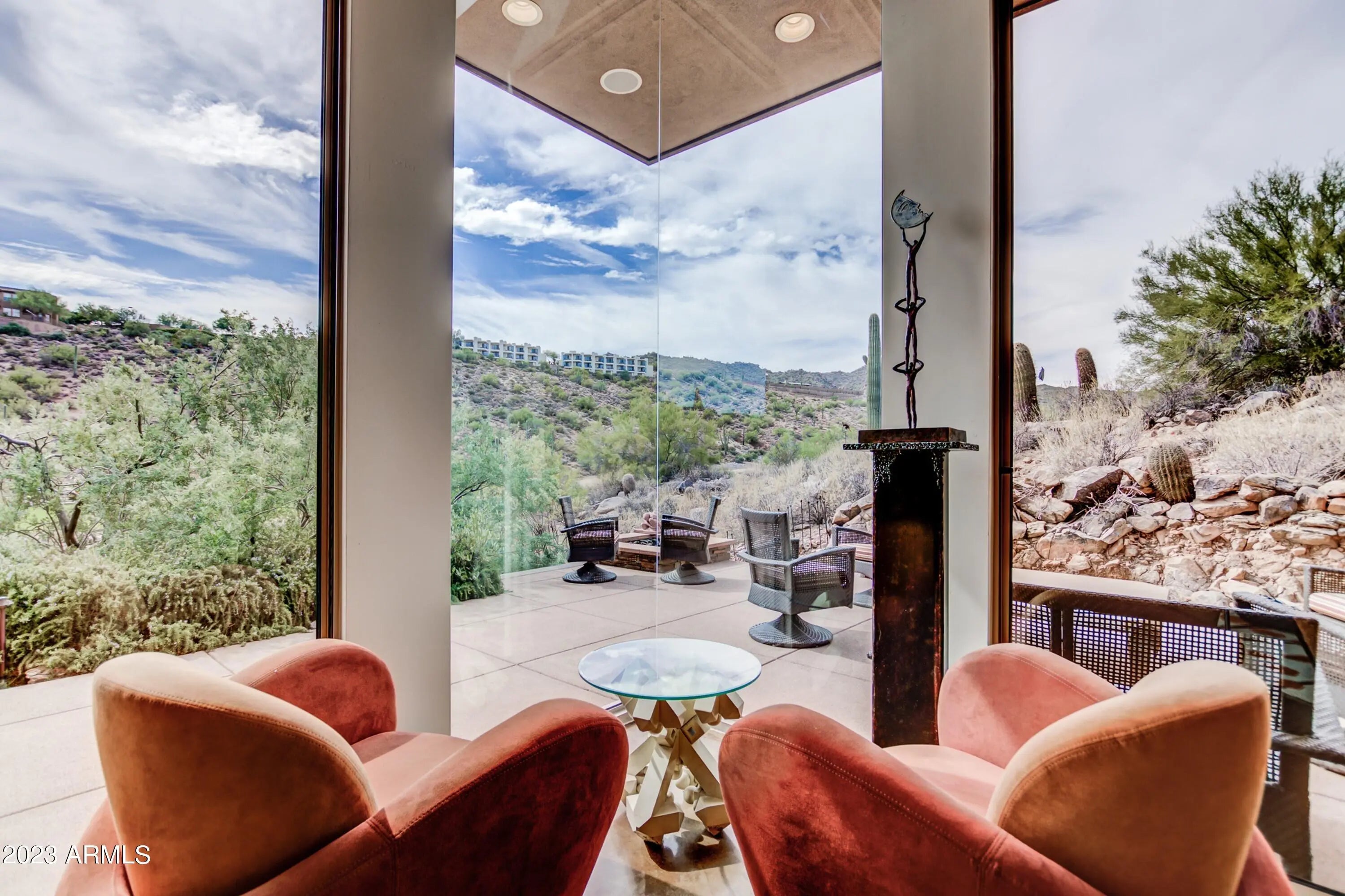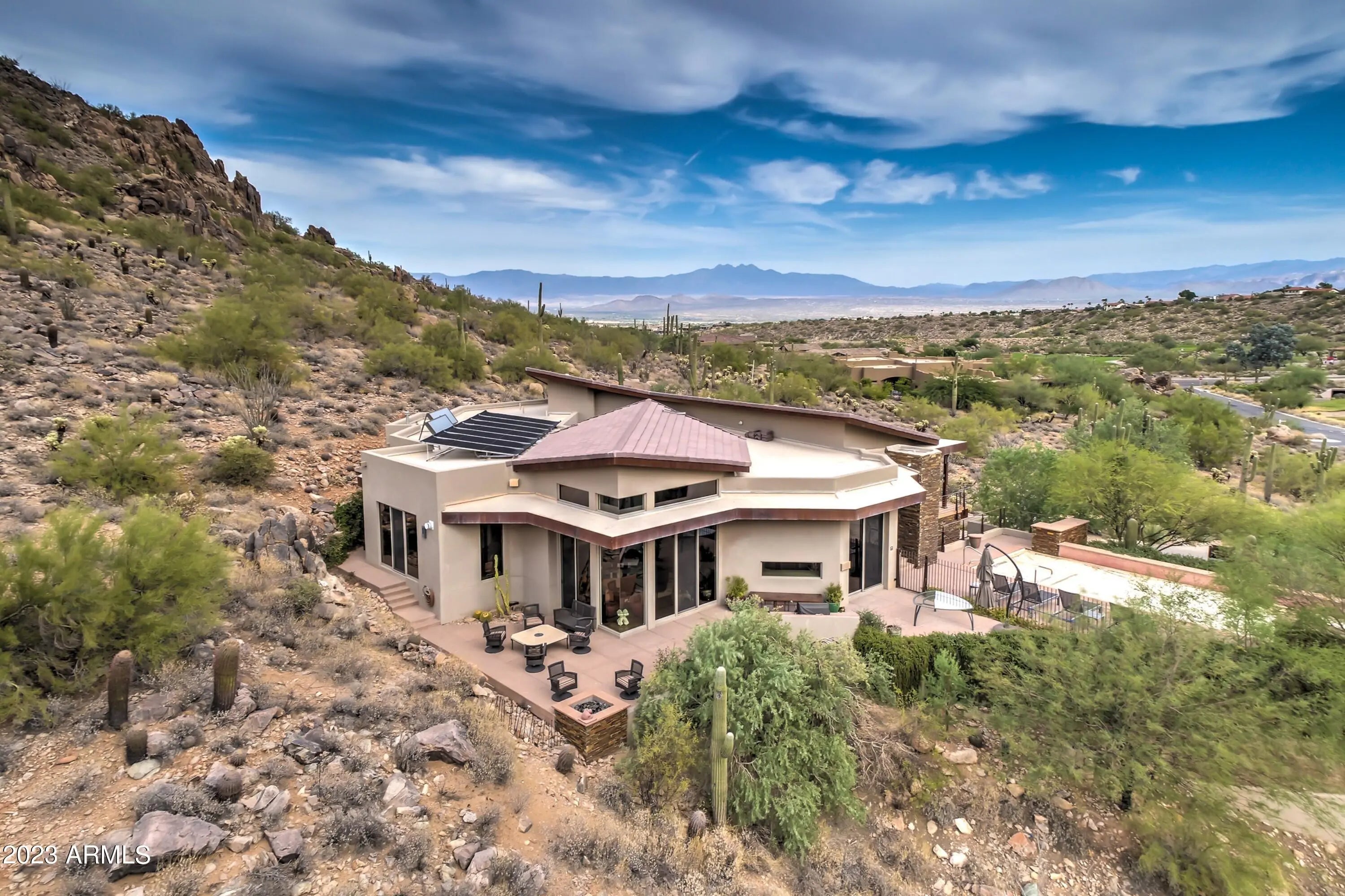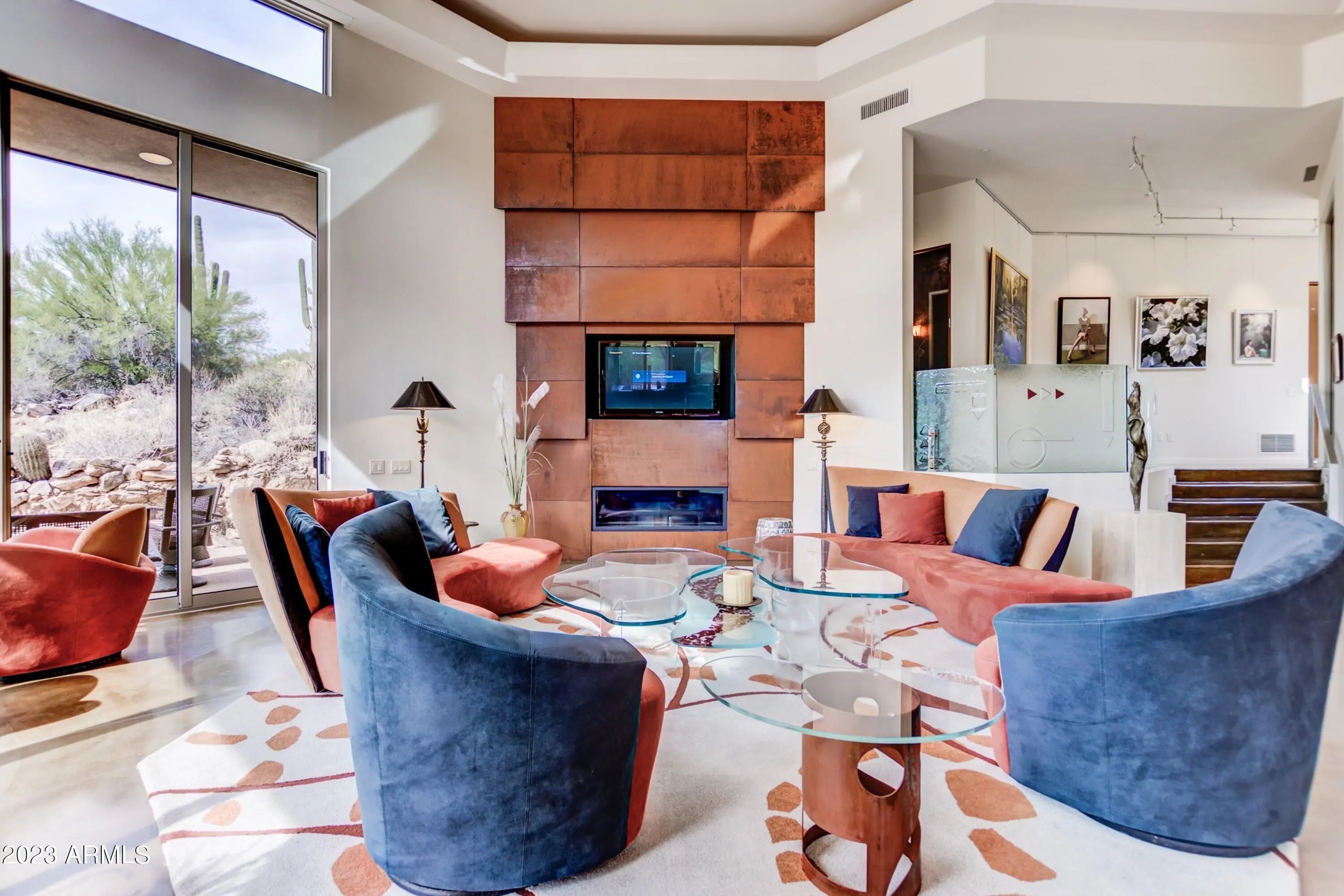 Frank Lloyd Wright-inspired contemporary home tucked in the west end of Sunridge Canyon, bordered by open public land for outstanding privacy and views. Double‑gated access and a long private drive lead to a modern design of steel, glass, and clean architectural lines. The dramatic 18‑foot custom iron and glass entry opens to spacious living areas with soaring ceilings, walls of glass with motorized blinds, and a sleek fireplace framed by sculptural metal panels concealing a hidden TV. The gourmet kitchen features imported Italian cabinetry and high‑end Gaggenau and Thermador appliances. Designed for comfort, style, and connection to its desert setting, this home offers refined living in one of Fountain Hills' most desirable communities.
