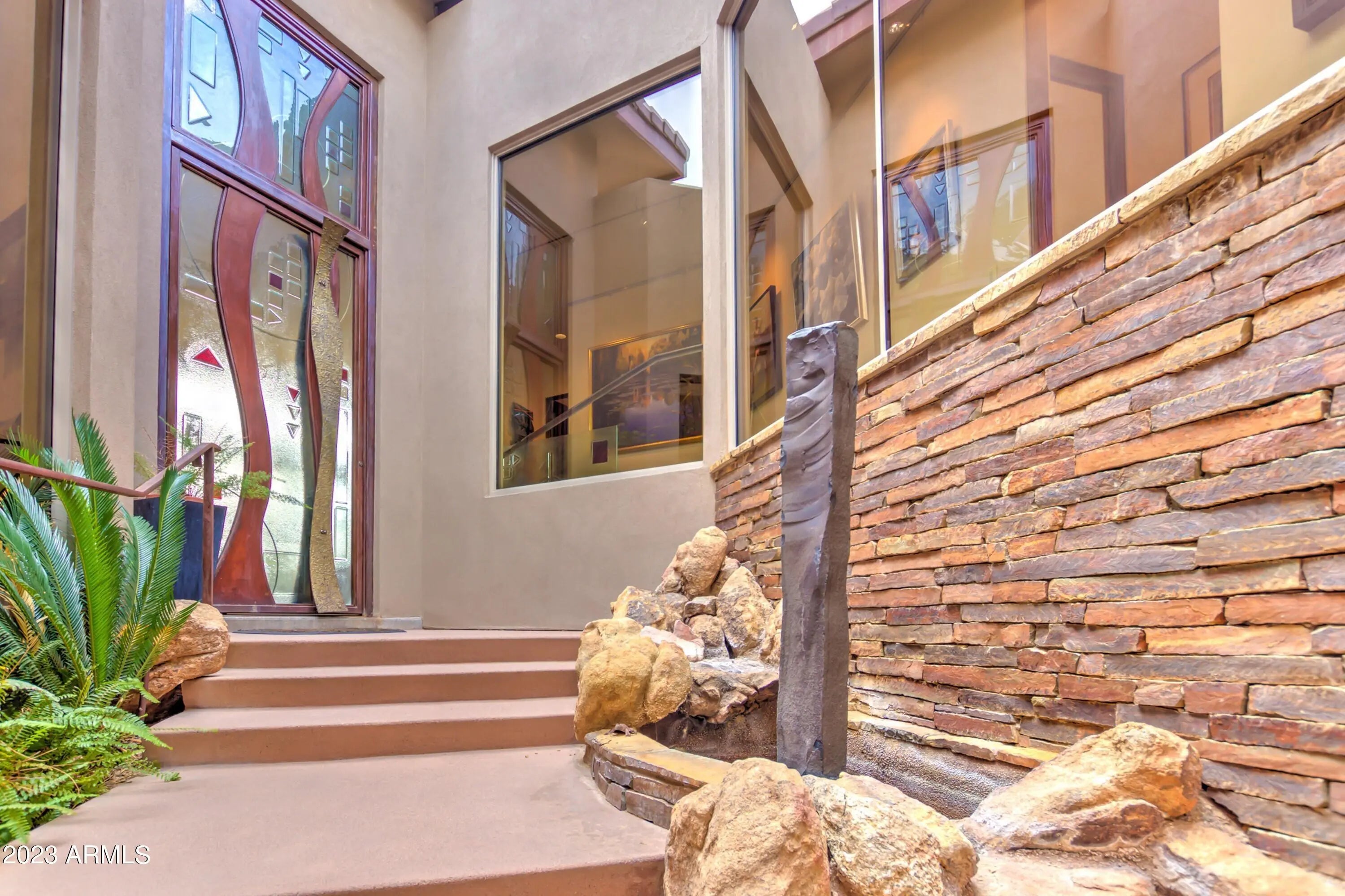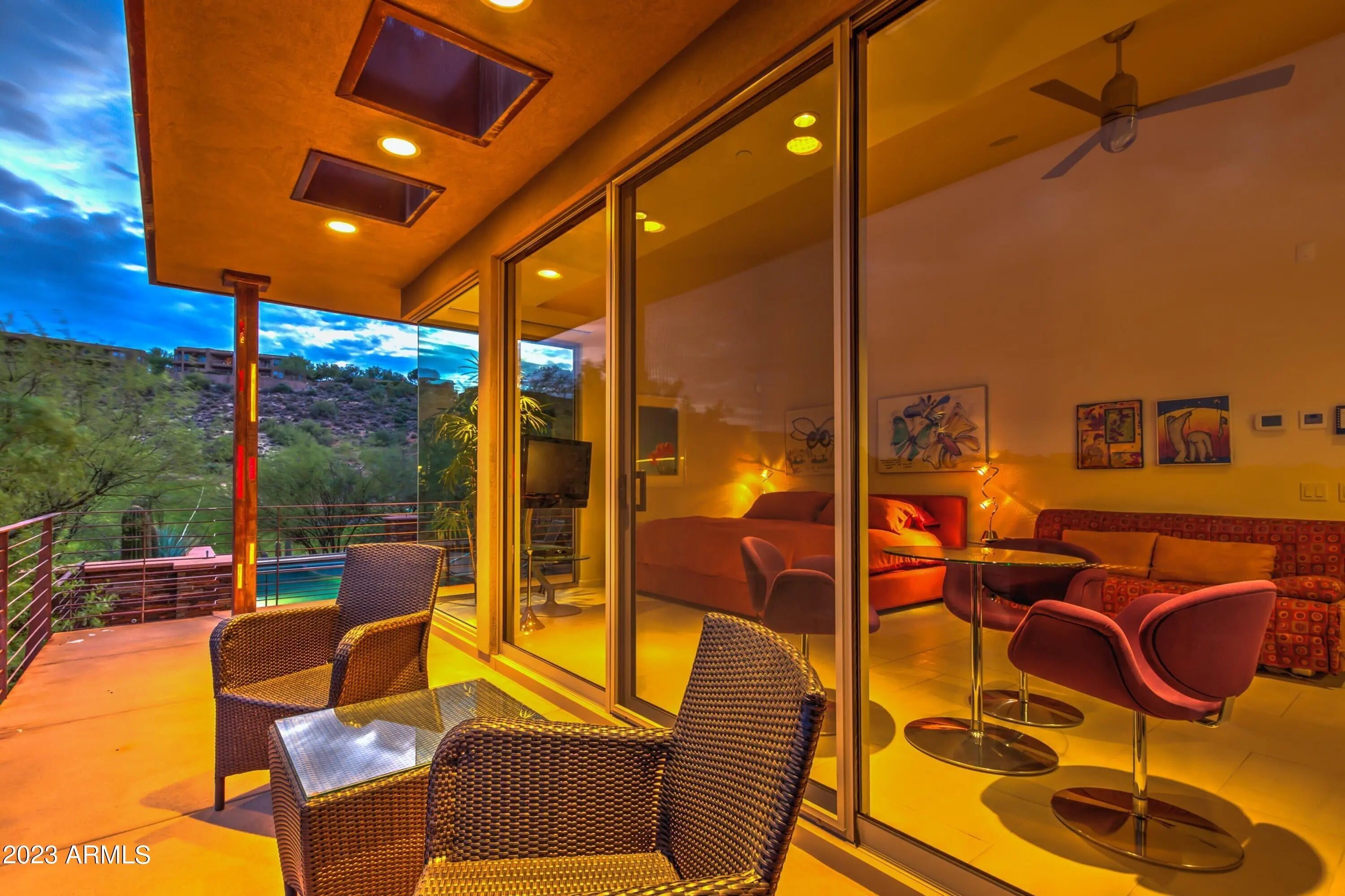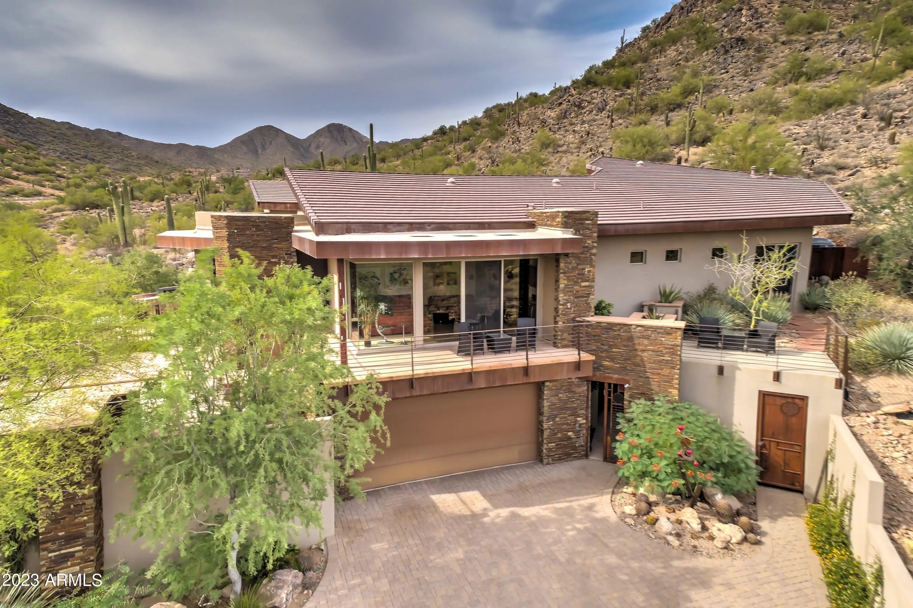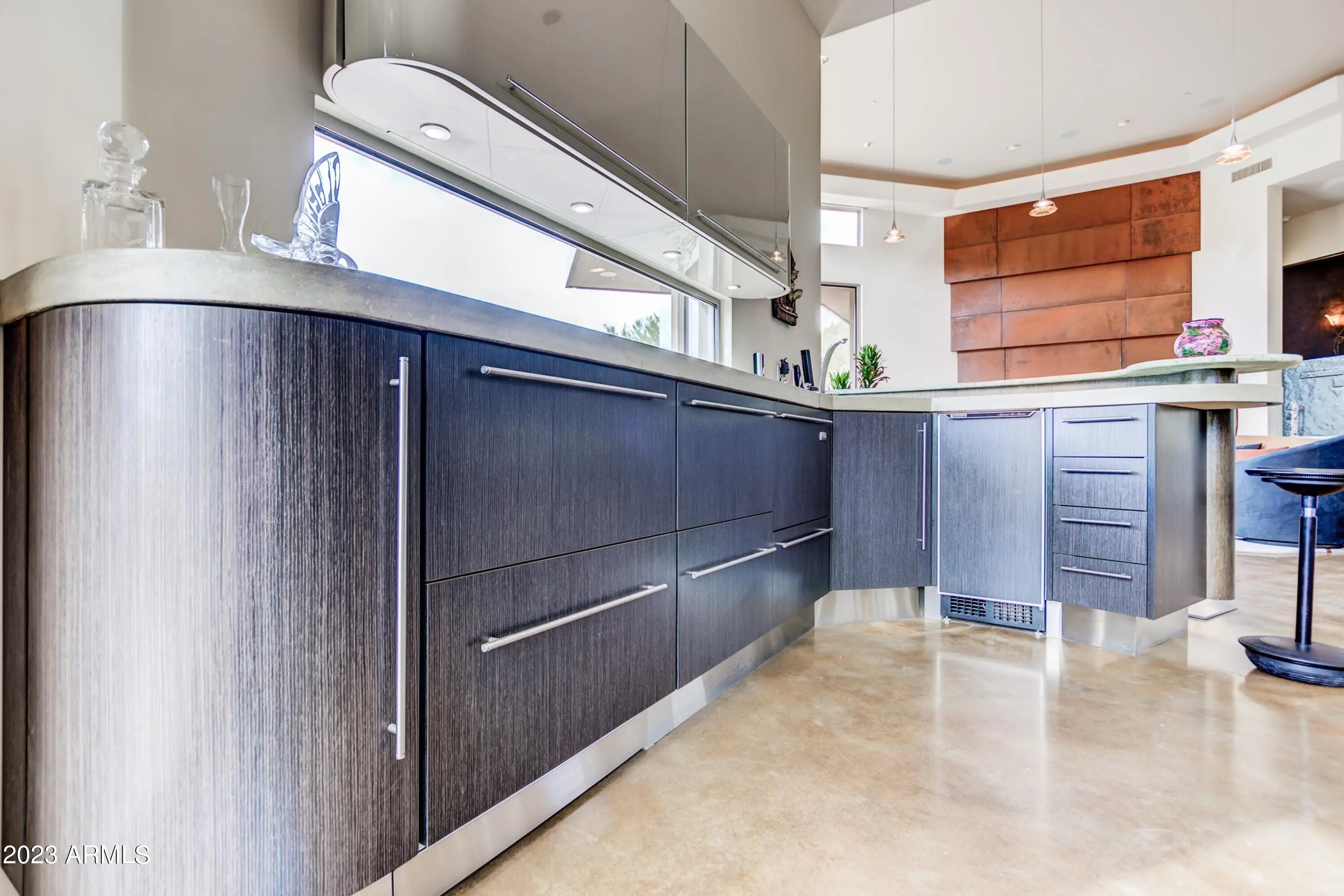 Frank Lloyd Wright-inspired contemporary home tucked in the west end of Sunridge Canyon, bordered by open public land for outstanding privacy and views. Double‑gated access and a long private drive lead to a modern design of steel, glass, and clean architectural lines. The dramatic 18‑foot custom iron and glass entry opens to spacious living areas with soaring ceilings, walls of glass with motorized blinds, and a sleek fireplace framed by sculptural metal panels concealing a hidden TV. The gourmet kitchen features imported Italian cabinetry and high‑end Gaggenau and Thermador appliances. Designed for comfort, style, and connection to its desert setting, this home offers refined living in one of Fountain Hills' most desirable communities.