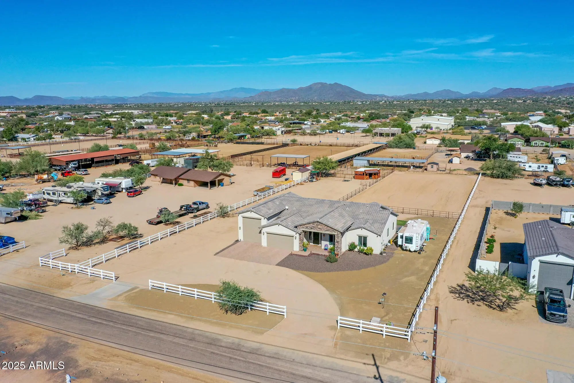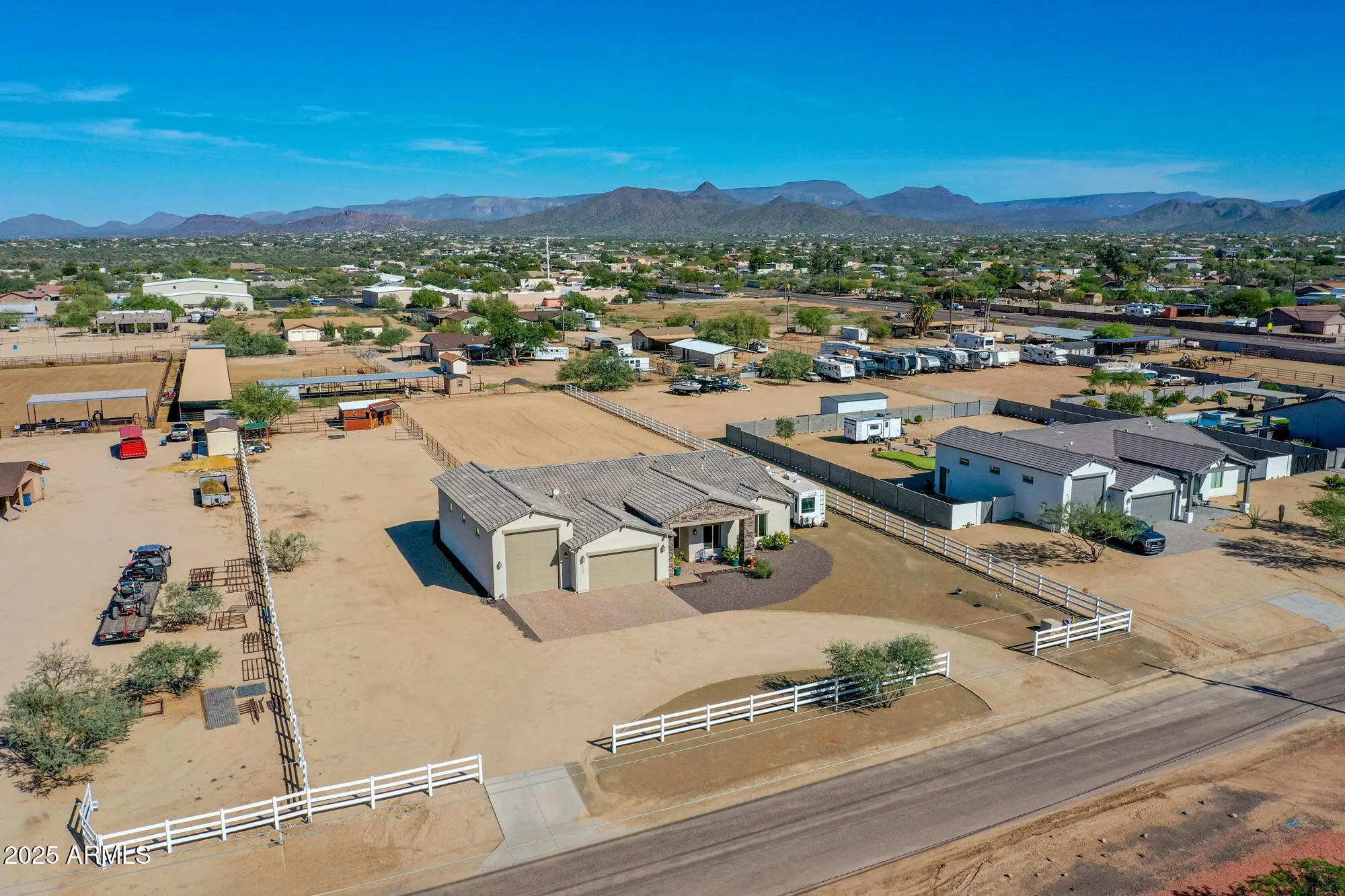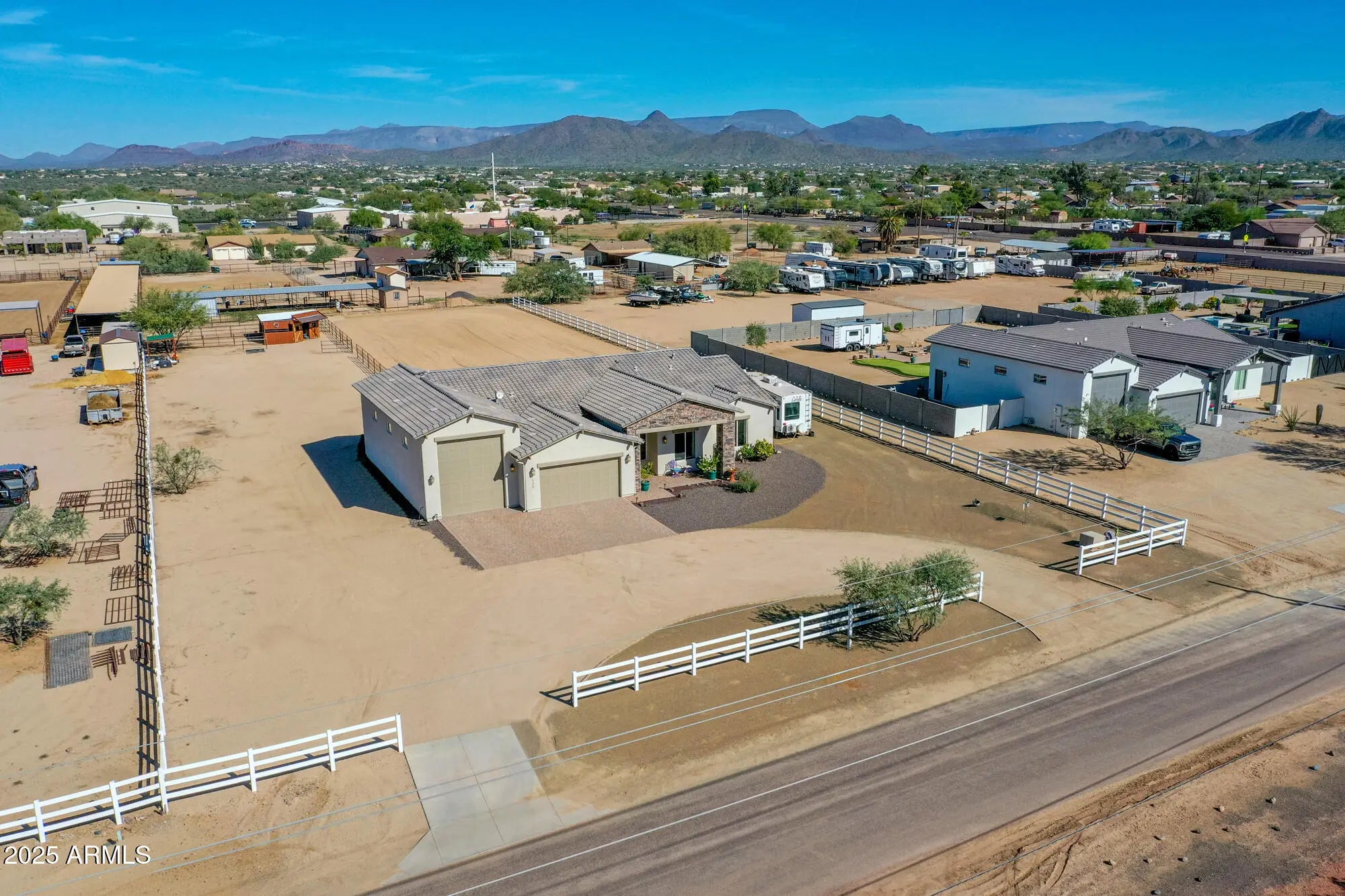 A rare gem, horse property close to the city with country living. Welcome to this better than new Nextgen home. A 4 bedroom, 2 1/2 bath home on a one plus one acre parcel. Completely landscaped with a three-split-rail, white vinyl fence and a circle driveway. The expansive foyer leads into an open floor plan with a great room, large kitchen, dining area and living room. The kitchen features 42'' upper cabinets, white ceramic farm sink, ample island, walk-in, air conditioned pantry and a half bath. The living room features double sliding doors to the patio, where you can enjoy your morning coffee with a Mountain View. Three nice sized guest rooms with walk in closets and a half bath. The laundry room with pocket door leads to the master closet. Plenty of space in this master bedroom and sliding doors to the large rear patio. Master bathroom has dual sinks, huge soaking tub and separate large shower. Spacious walk-in closet includes linen storage. Two car garage, 8' and over 50' RV garage, epoxy floor and 50 amp plug. Backyard includes huge horse riding/jumping arena, western style, two stall barns with tack room, two runs and room to spare.