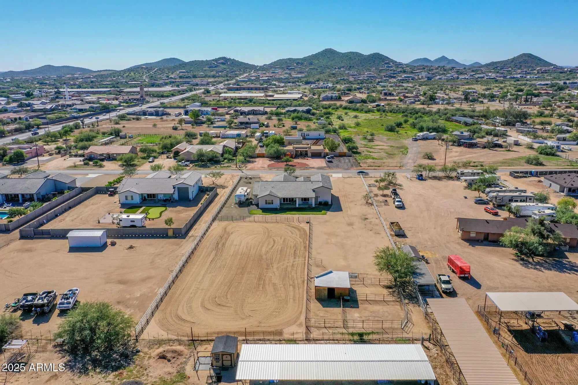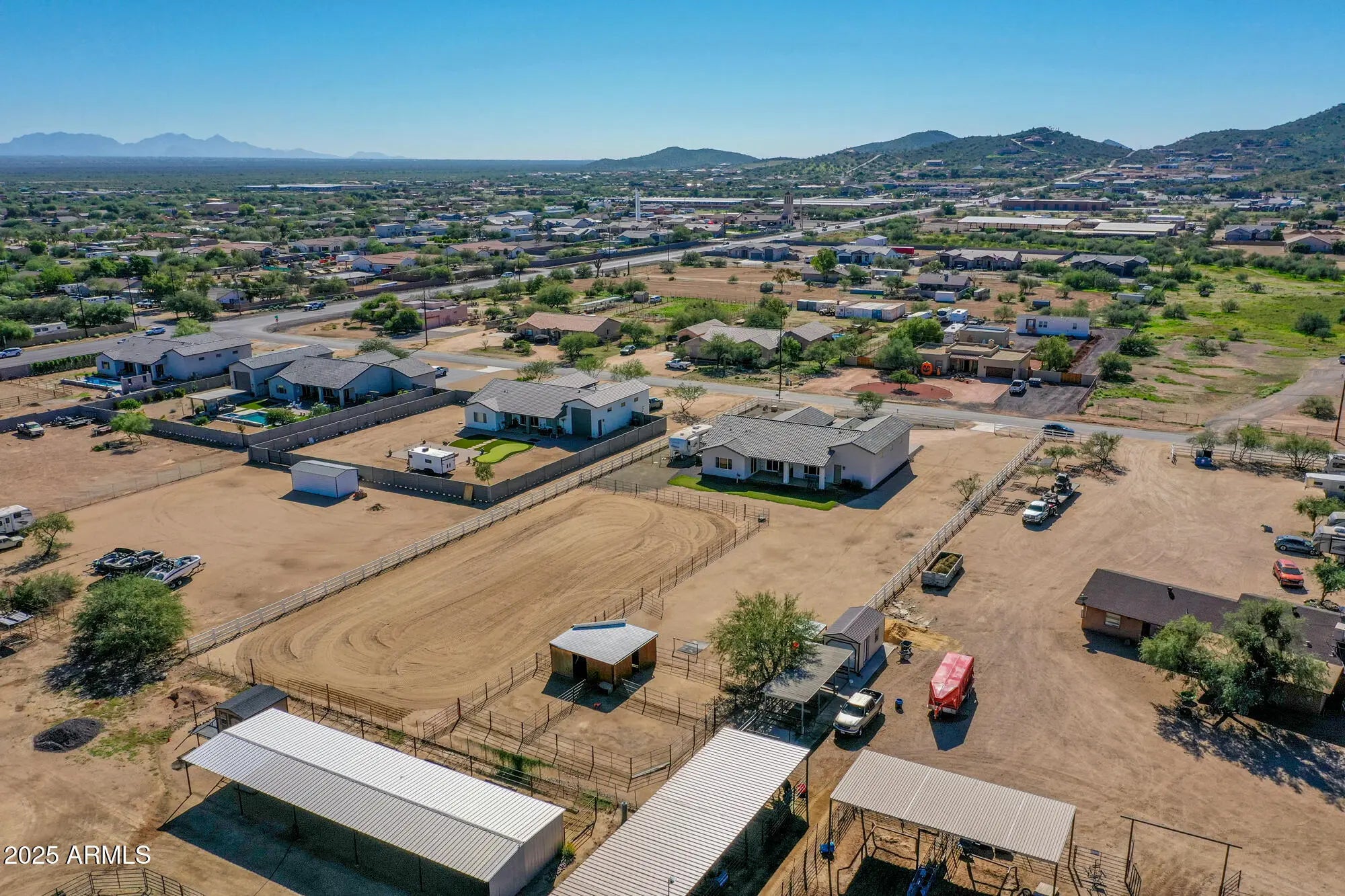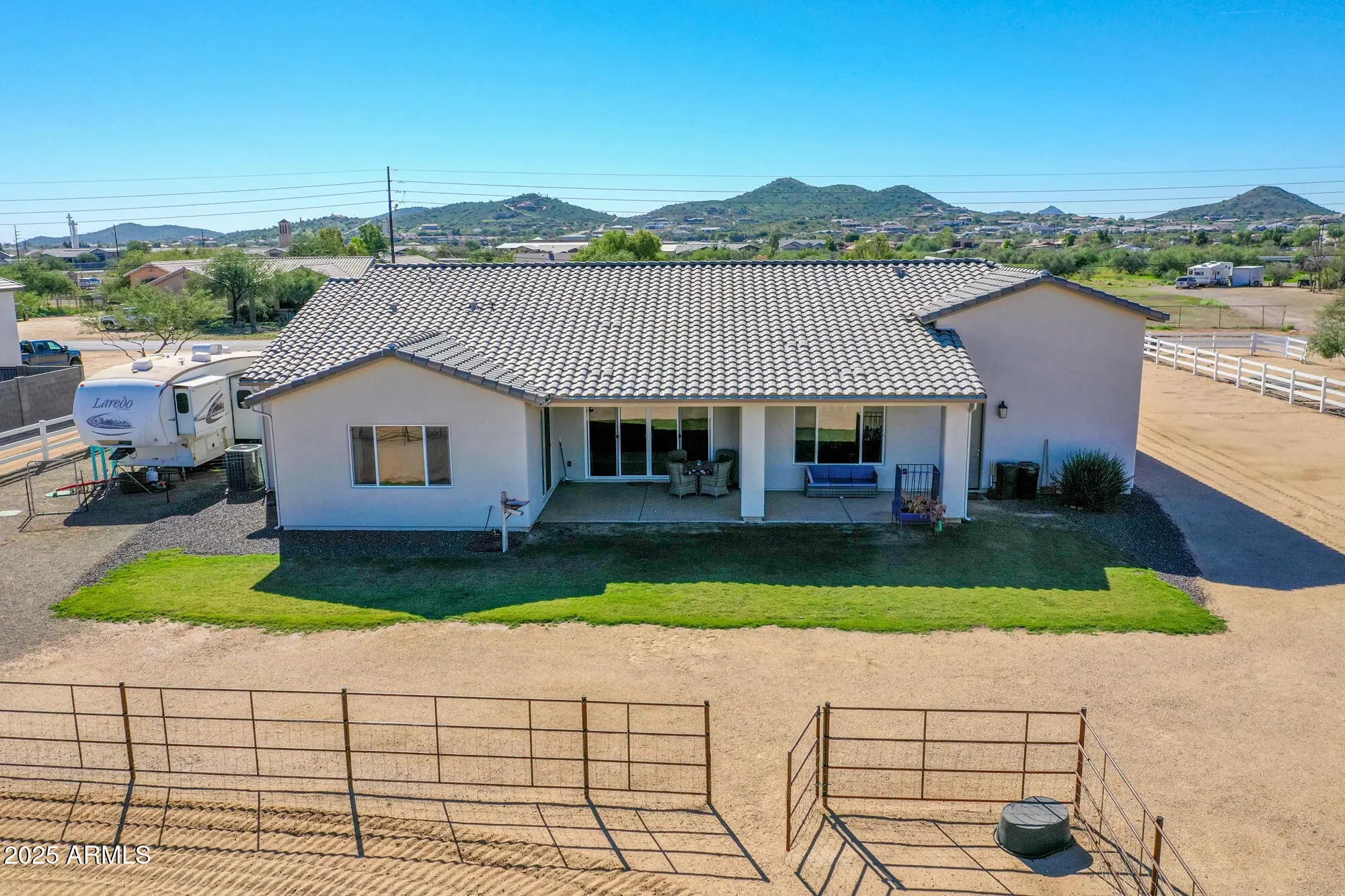 A rare gem, horse property close to the city with country living. Welcome to this better than new Nextgen home. A 4 bedroom, 2 1/2 bath home on a one plus one acre parcel. Completely landscaped with a three-split-rail, white vinyl fence and a circle driveway. The expansive foyer leads into an open floor plan with a great room, large kitchen, dining area and living room. The kitchen features 42'' upper cabinets, white ceramic farm sink, ample island, walk-in, air conditioned pantry and a half bath. The living room features double sliding doors to the patio, where you can enjoy your morning coffee with a Mountain View. Three nice sized guest rooms with walk in closets and a half bath. The laundry room with pocket door leads to the master closet. Plenty of space in this master bedroom and sliding doors to the large rear patio. Master bathroom has dual sinks, huge soaking tub and separate large shower. Spacious walk-in closet includes linen storage. Two car garage, 8' and over 50' RV garage, epoxy floor and 50 amp plug. Backyard includes huge horse riding/jumping arena, western style, two stall barns with tack room, two runs and room to spare.