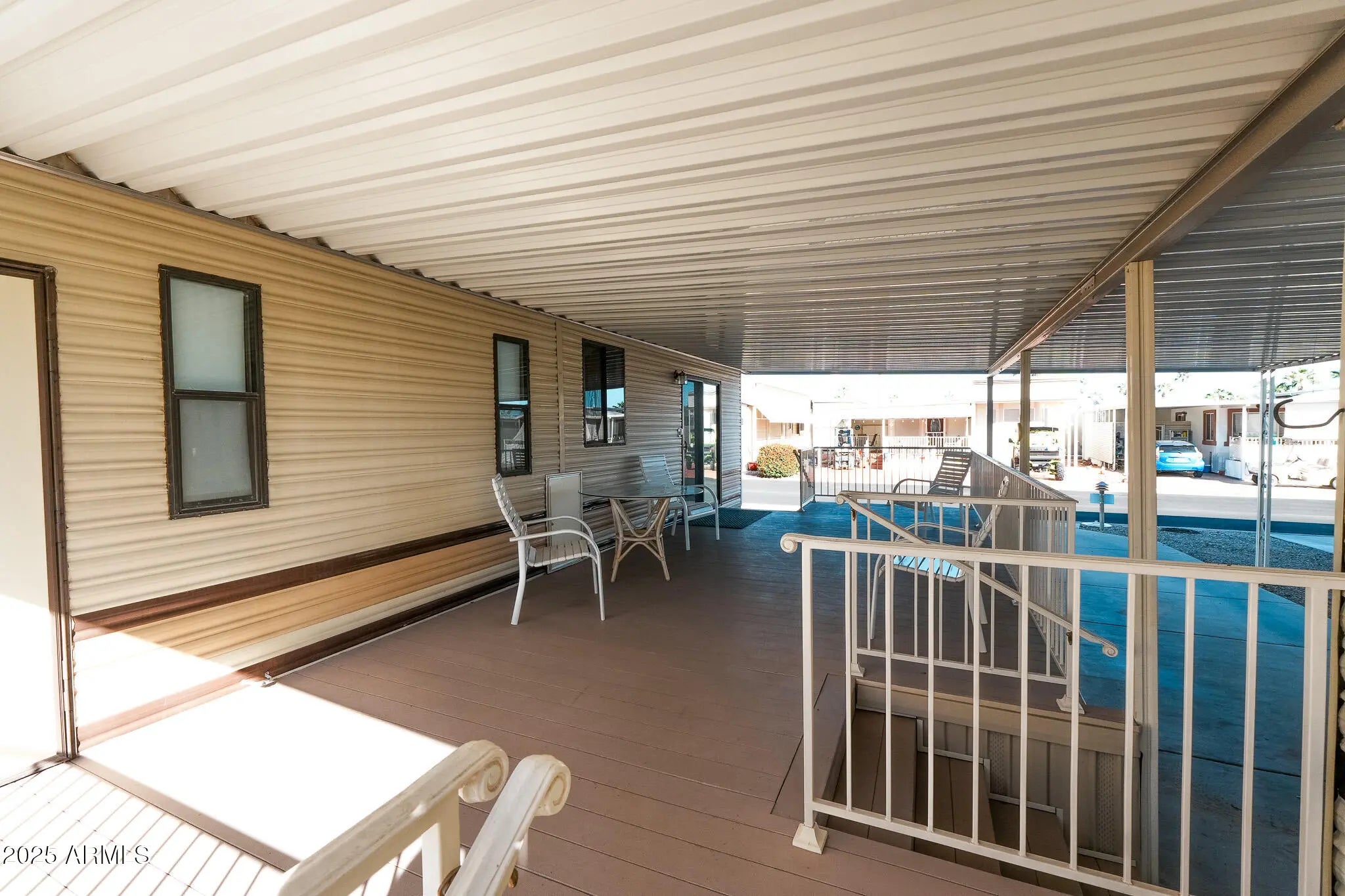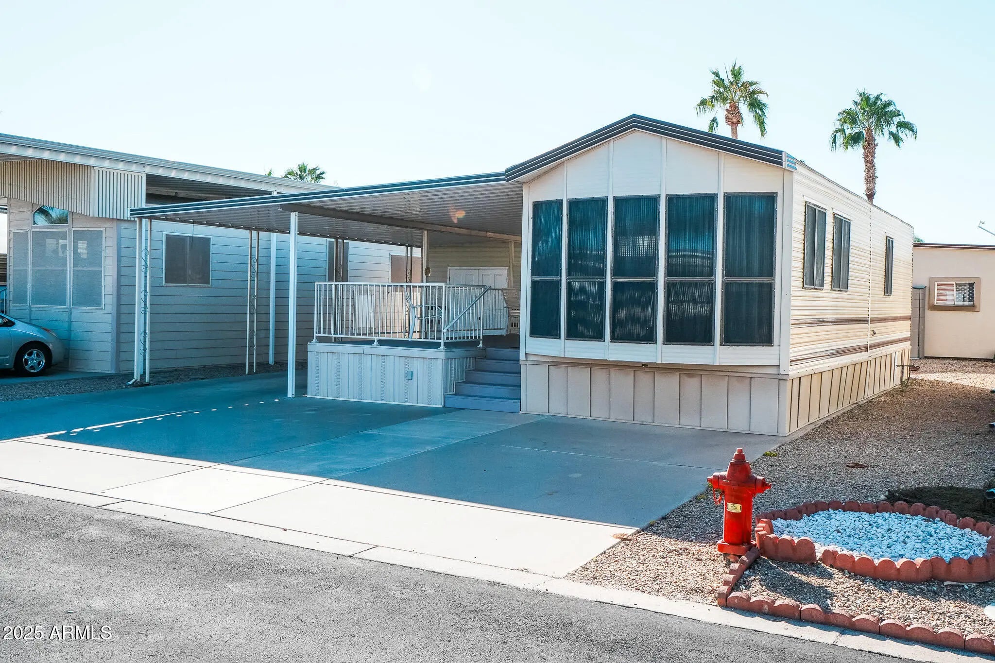 Clean, Updated Park Model Home with Covered Deck & Parking - You Own the Land! Move-in ready and well-maintained, this park model features new washer & dryer, AC/heat pump, recent elastomeric roof coating, and a large, covered deck for outdoor living. The kitchen includes a full-size refrigerator and range, plus excellent built-ins for storage throughout. Clean interior with updated countertops and a smart floor plan with less furniture and more livable space. The covered parking accommodates your vehicle or golf cart with ease. Located in Happy Trails Resort, a gated 55+ community with low HOA fees that include water, sewer, trash and use of all resort amenities like multiple pools and spas, pickleball, tennis, dog park, library, post office, billiards, fitness center and more!