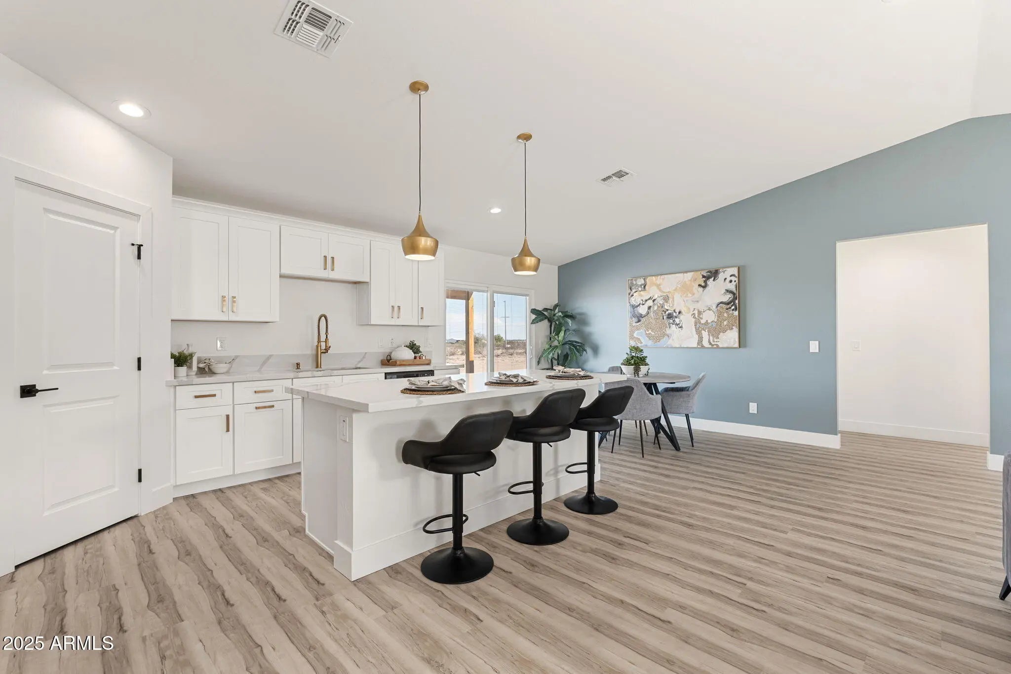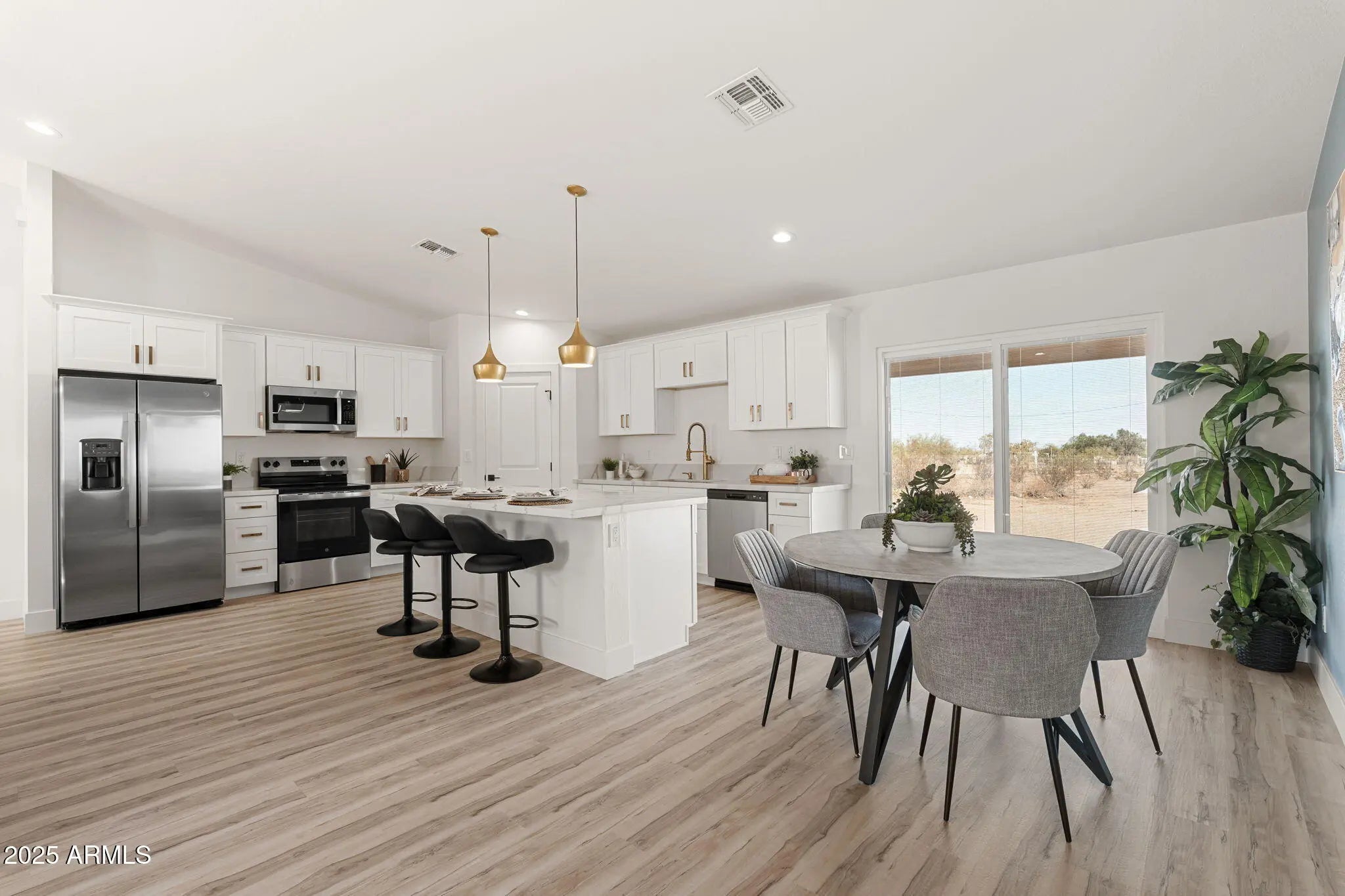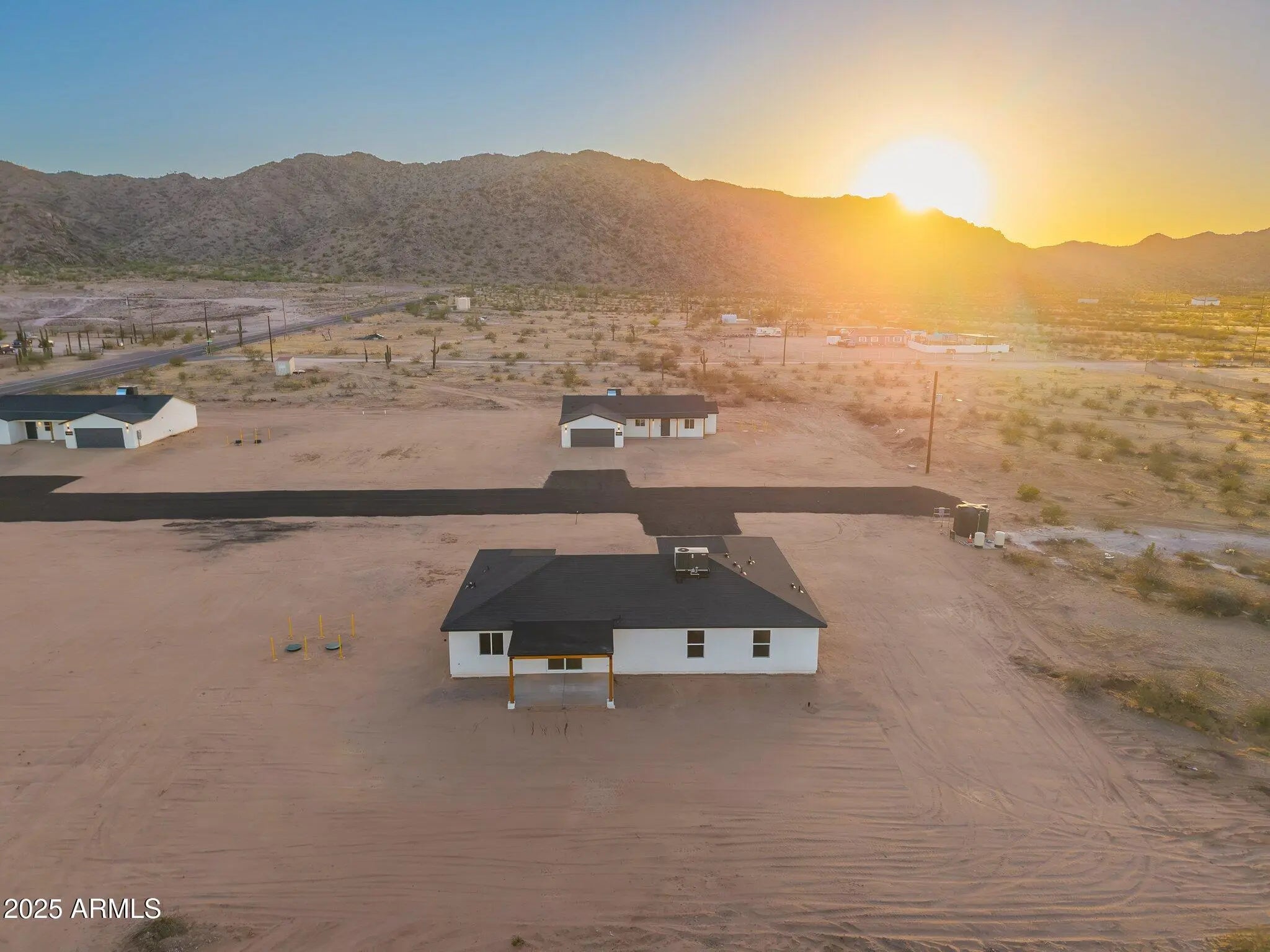 Brand New 2025 Build - No HOA! Discover peaceful desert living in this custom home on a 1.3-acre lot in scenic North Hidden Valley. Enjoy the serenity of an unpopulated valley surrounded by mountain views and glowing sunsets—just minutes from Skydive Arizona, golf courses, the local racetrack, and Harrah's Ak-Chin Resort & Casino. The open-concept design features vaulted ceilings, luxury wood-look flooring, and a bright kitchen with quartz counters, stainless appliances, and a large island. Built with 2x6 construction, foam insulation, water filtration system, shared well, and septic. The split floor plan offers a spacious primary suite with dual vanities, walk-in shower, and large closet. Close enough to enjoy the action yet far enough to feel like your own private retreat!