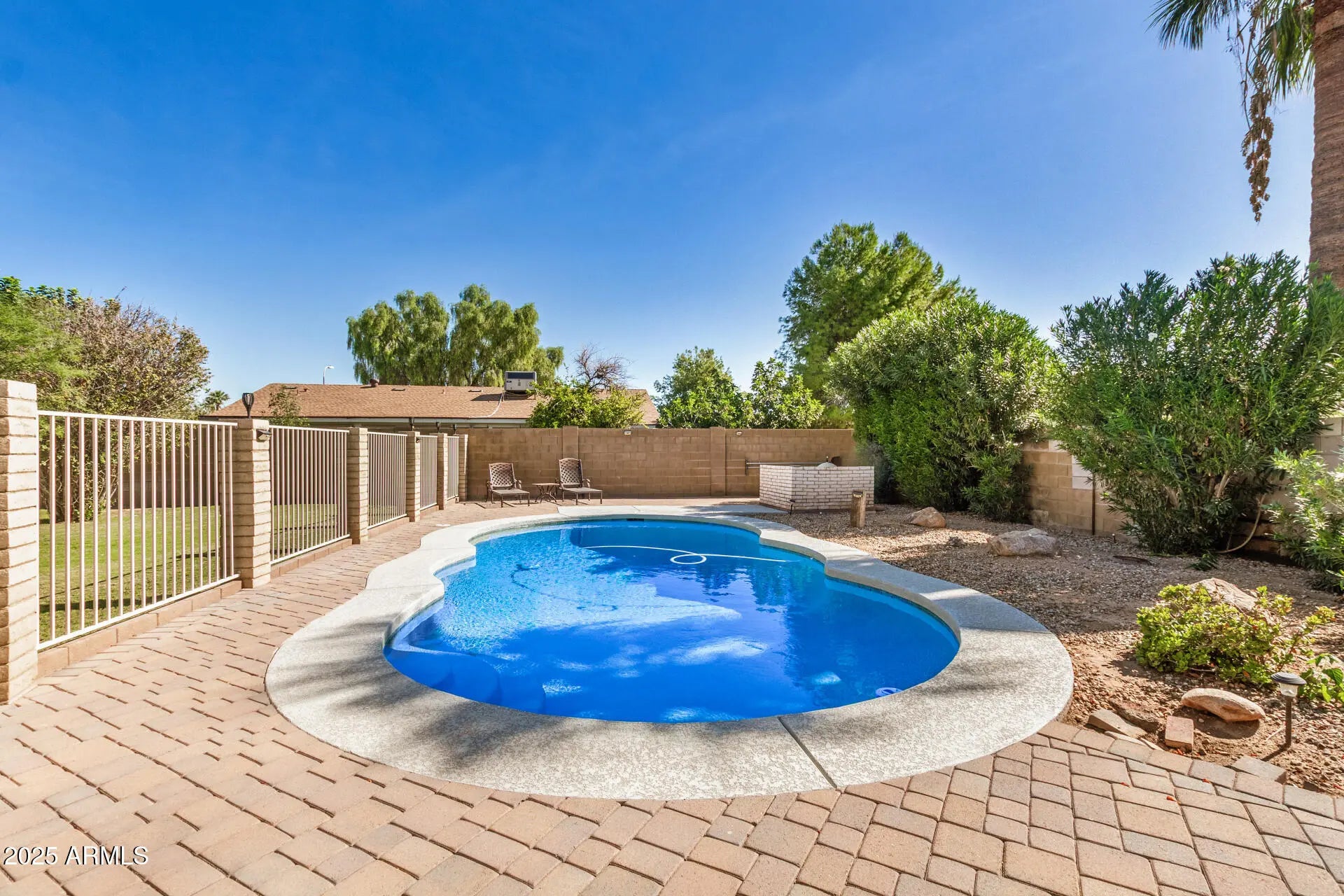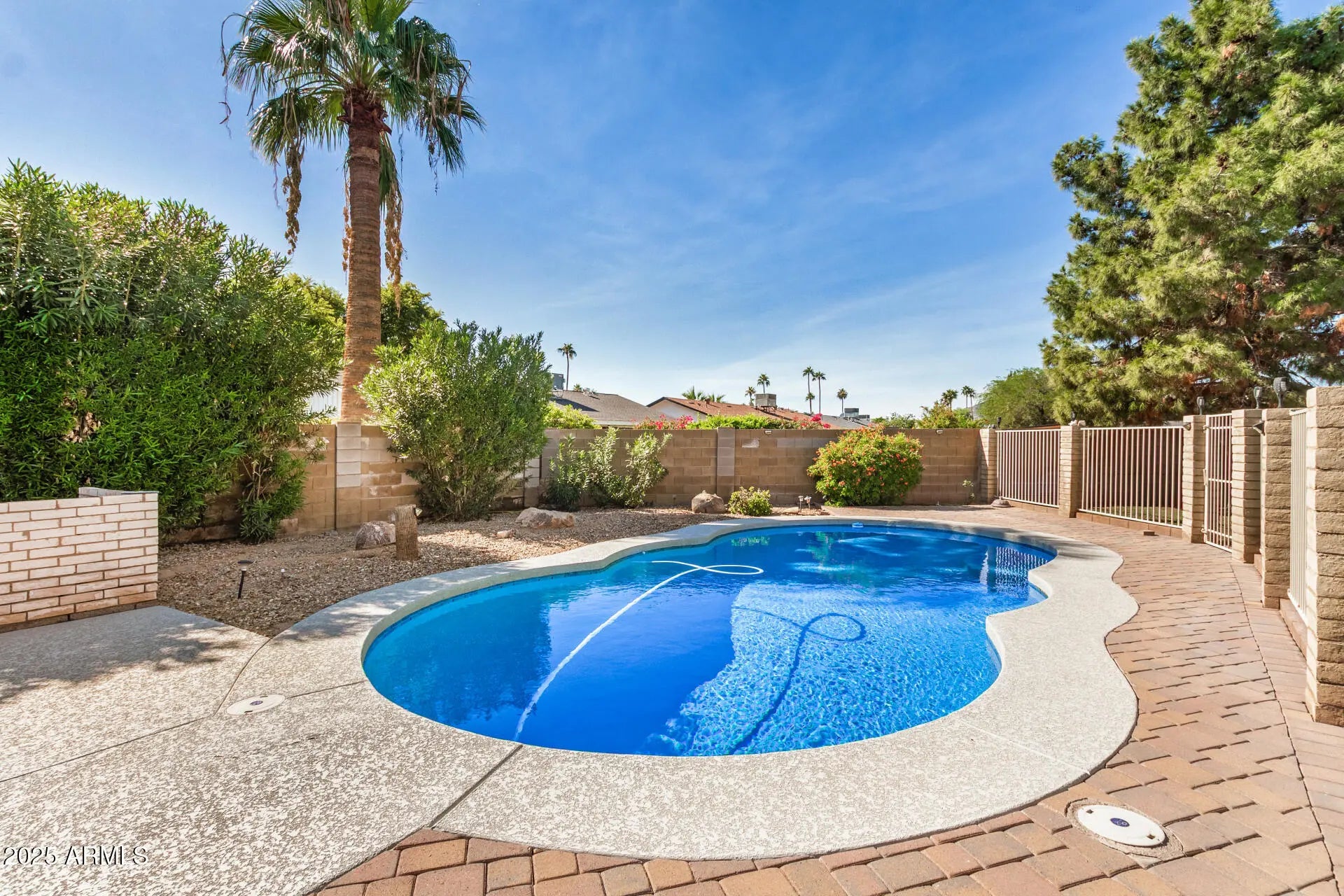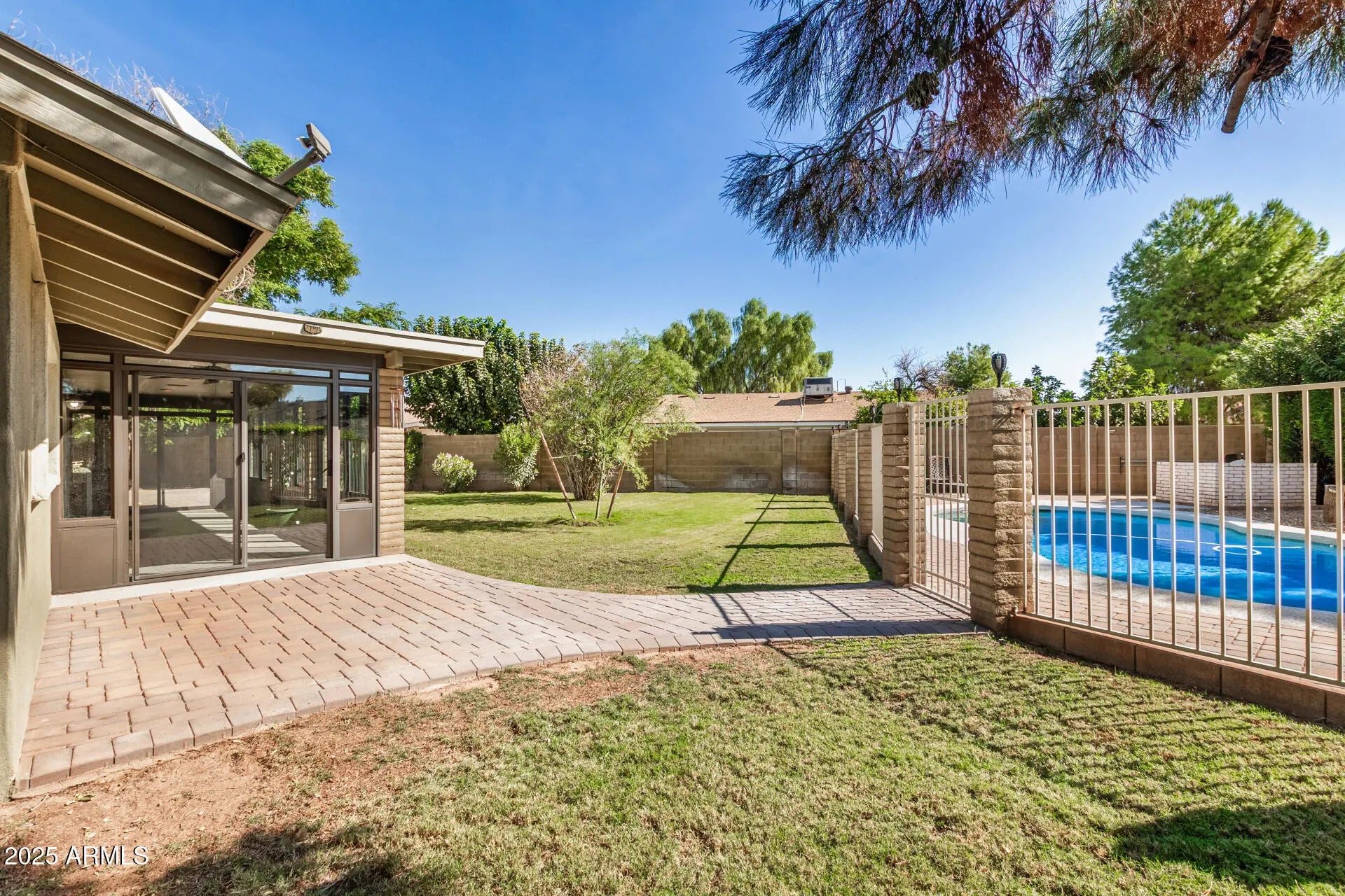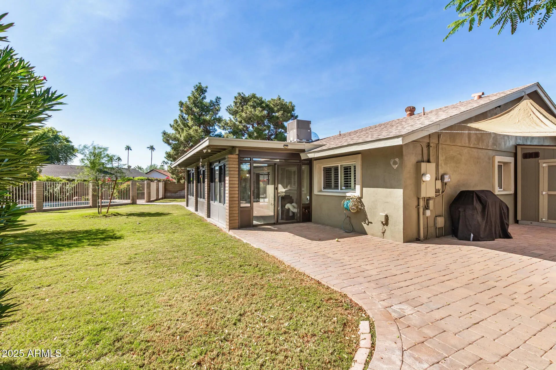Beautiful home with pool on huge quarter acre lot, in a peaceful culdesac in Scottsdale! The cozy courtyard, 2-car garage & RV gates add to the charming curb appeal, inviting you to take a look inside. Fall in love with the bright and spacious living areas where you'll spend enchanting moments, showcasing wood flooring, abundant natural light & neutral paint. The impeccable kitchen boasts ample cabinetry, granite countertops, tile backsplash, built-in essentials & a pass-through window with a breakfast bar. The tranquil main retreat hosts a closet with mirrored doors and a private bathroom. Entertain guests and spend quiet evenings in the AZ room. Your private oasis is complete with plenty of sitting space with pavers, two storage sheds, a lush lawn & a sparkling pool to enjoy sunny days!
